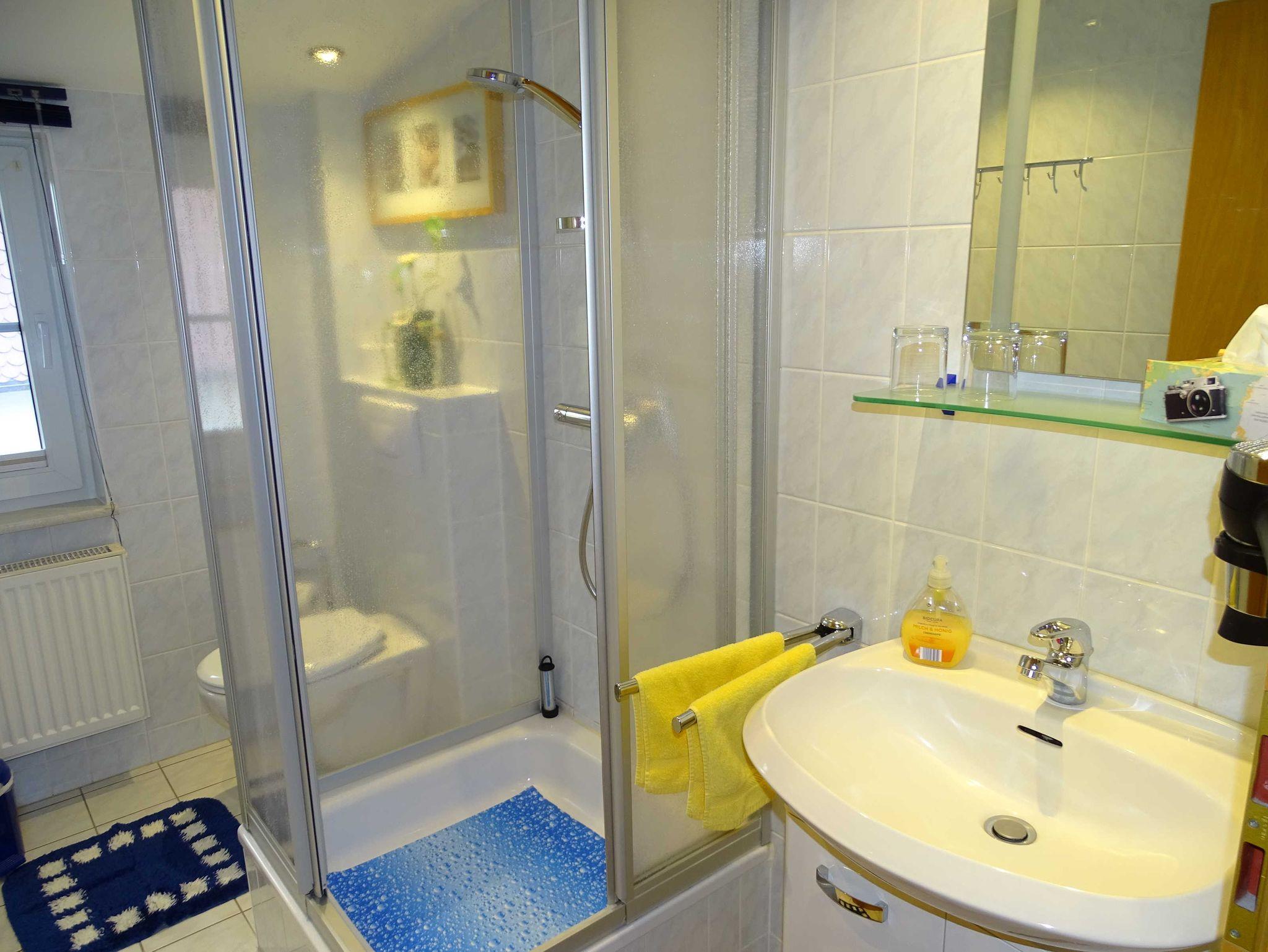 Im Obergeschoß befindet sich das geräumige Schlafzimmer mit einem Doppelbett und einer Schlafcouch als Aufbettungsmöglichkeit. Das Badezimmer ist eingerichtet mit Dusche und WC. Ein Fön ist auch vorhanden.