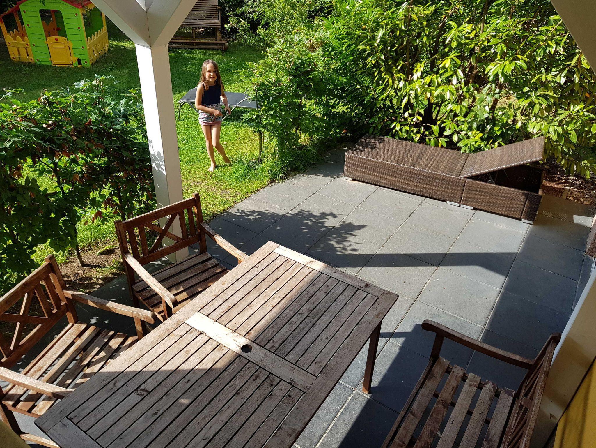 • Großzügigen Terrasse mit Gartenblick und mit Außensauna zur Nutzung. Mit stabiler Sitzgarnitur aus Holz. Für Fewo 1 mit 2 Stühlen, einer Bank und einem Tisch und für Fewo 2 mit 5 Stühlen und einem Tisch. Siehe Fotos. Terrassentür und das Terrassenfenster sind jeweils mit einem Plissee ausgestattet, welches Sie zum Schutz gegen Sonnenlicht oder Blicke nutzen können.