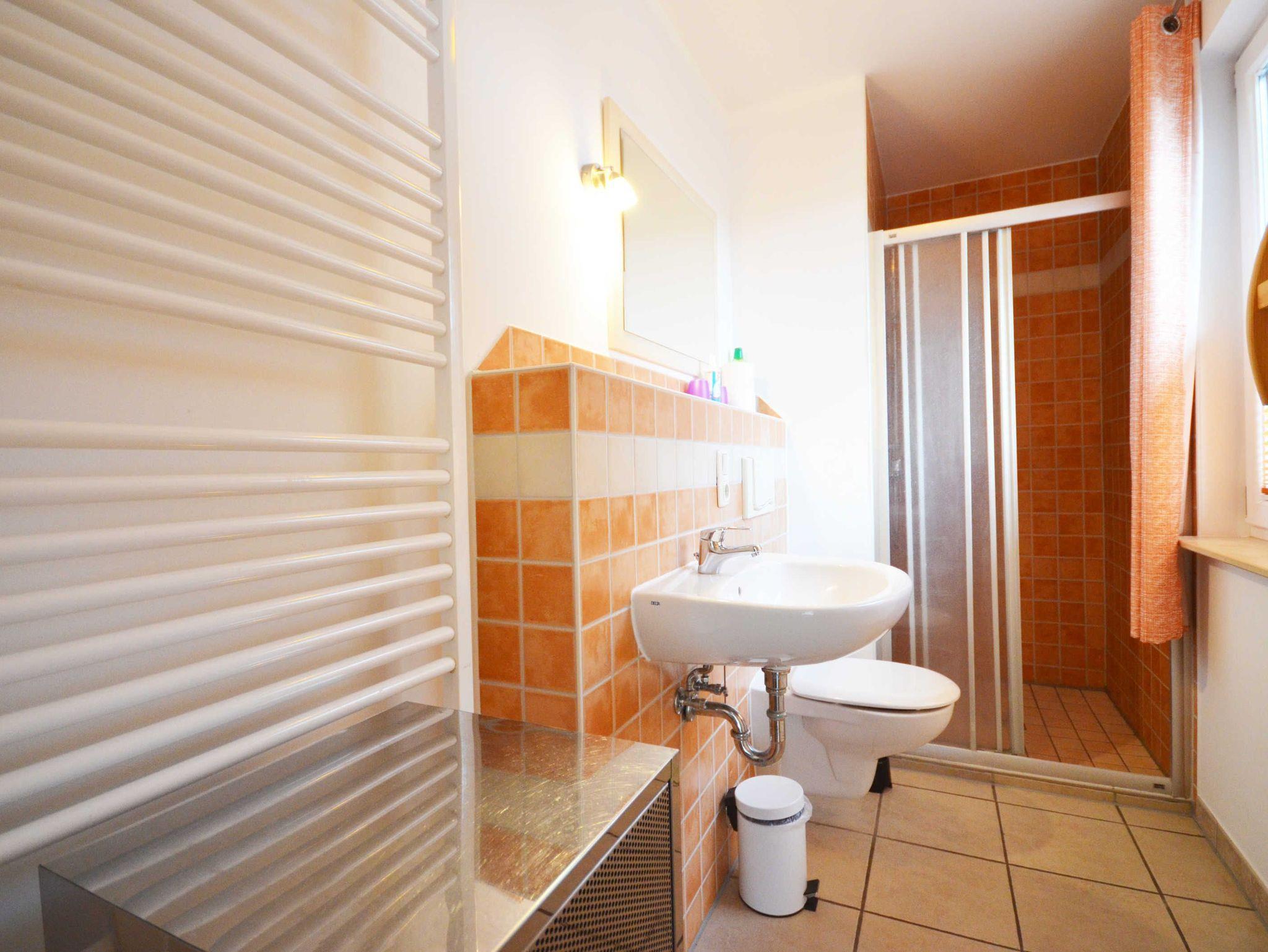 • Im Bad befindet sich die Dusche, Waschbecken, Toilette und ein Handtuchheizkörper. Das Badfenster wurde mit einem Plissee und einem Vorhang ausgestattet.