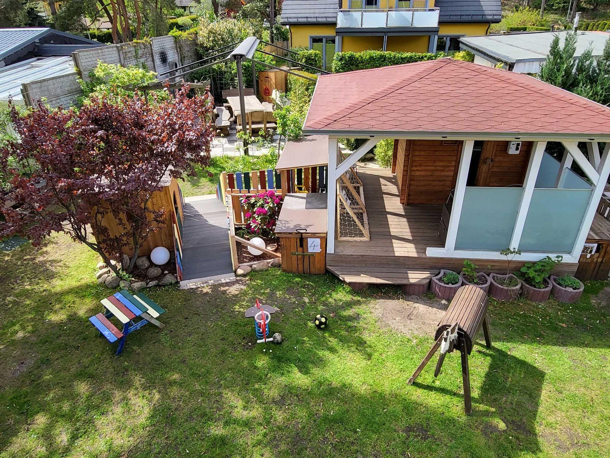 • Eine Kinderküche, Spielhäuser, eine Schultafel und mehrere Fahrgeräte stehen im Garten für alle Kinder bereit.