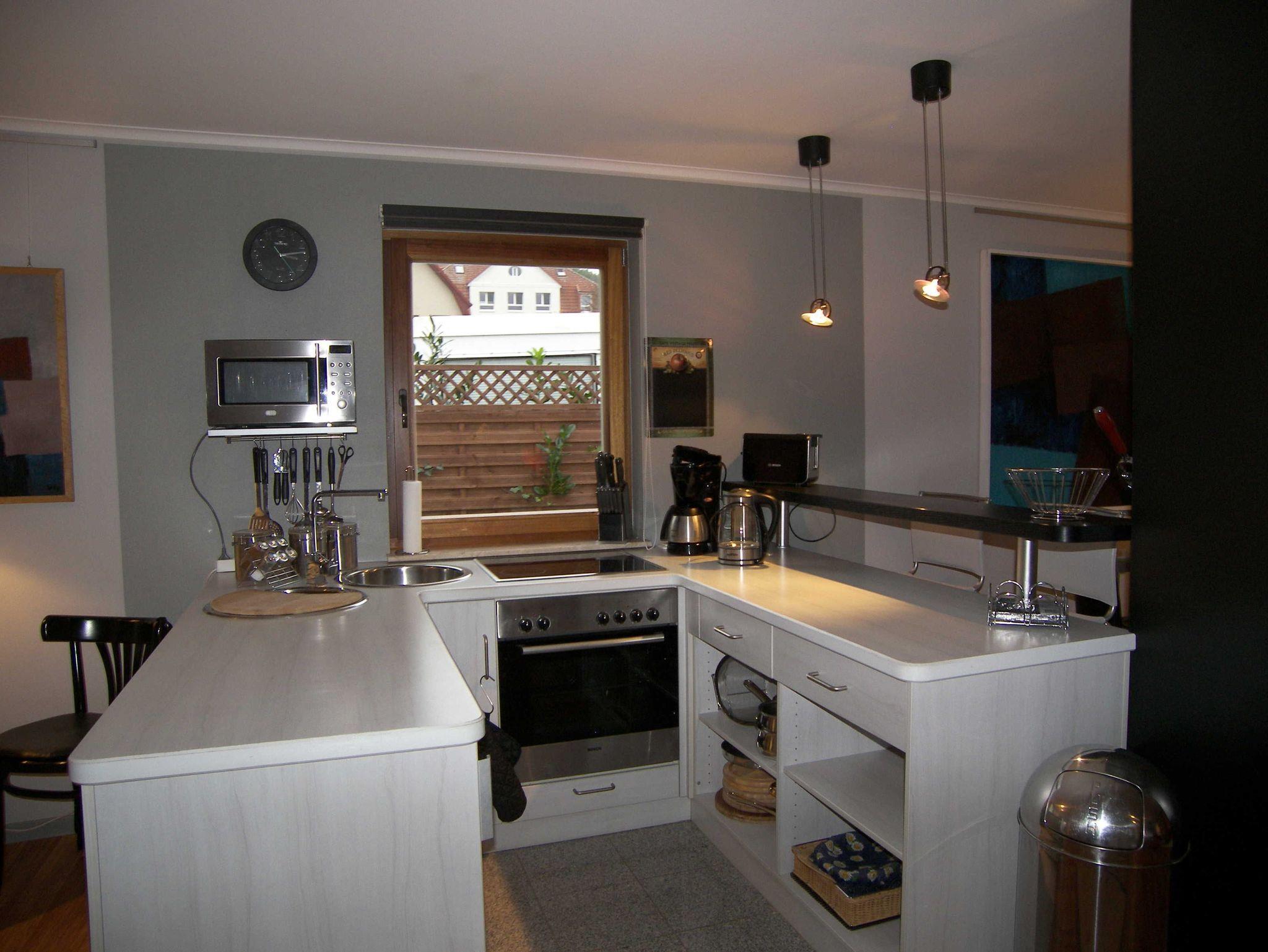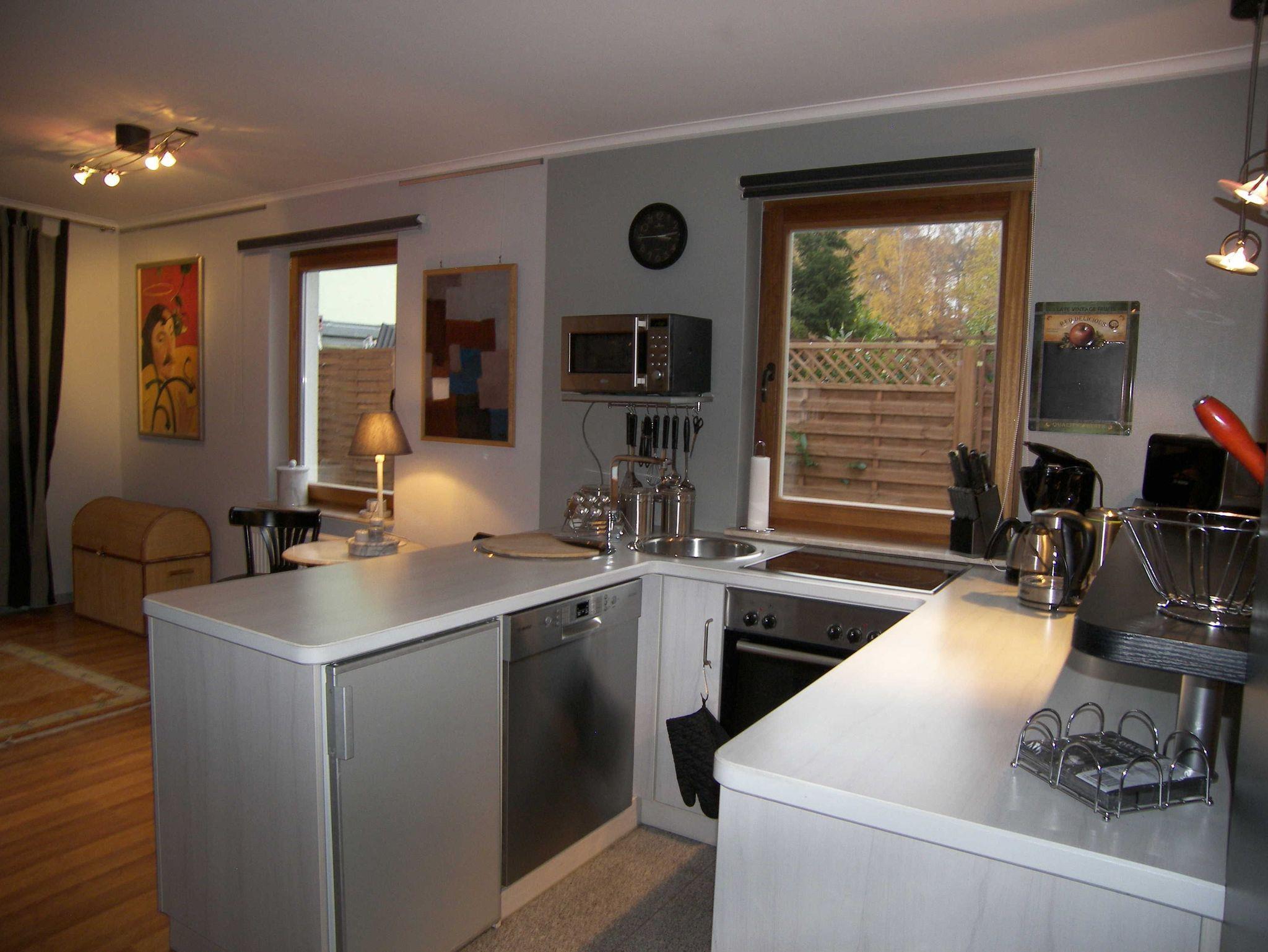 Integriert in den Wohnbereich befindet sich die voll ausgestattete Küche mit Cerankochfeld, Backofen, Geschirrspüler, Kühlschrank, Mikrowelle, Wasserkocher,Toaster & Kaffeevollautomat. Als zusätzliche Sitzgelegenheit steht Ihnen ein Frühstückstresen zur Verfügung.
