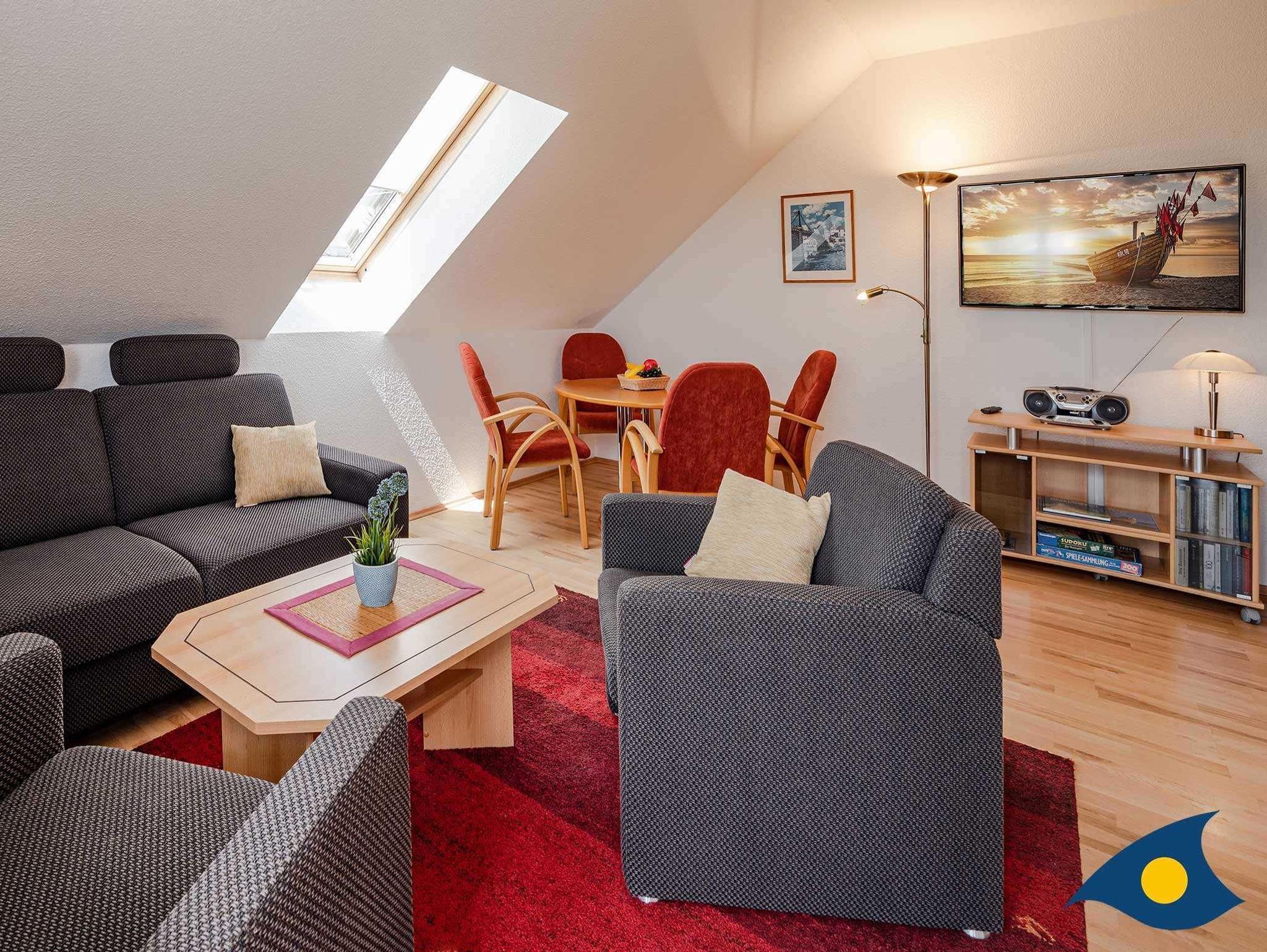 Dieses gemütliche 3-Raum-Appartement unterm Dach begrüßt Sie aufs herzlichste. Sie werden sich in diesem Traumappartement sofort wie zu Hause fühlen. Die gemütliche Einrichtung, die bequemen Schlafplätze verteilt auf zwei Schlafzimmer und die gut ausgestattete Küchenzeile lassen keine Wünsche offen.
