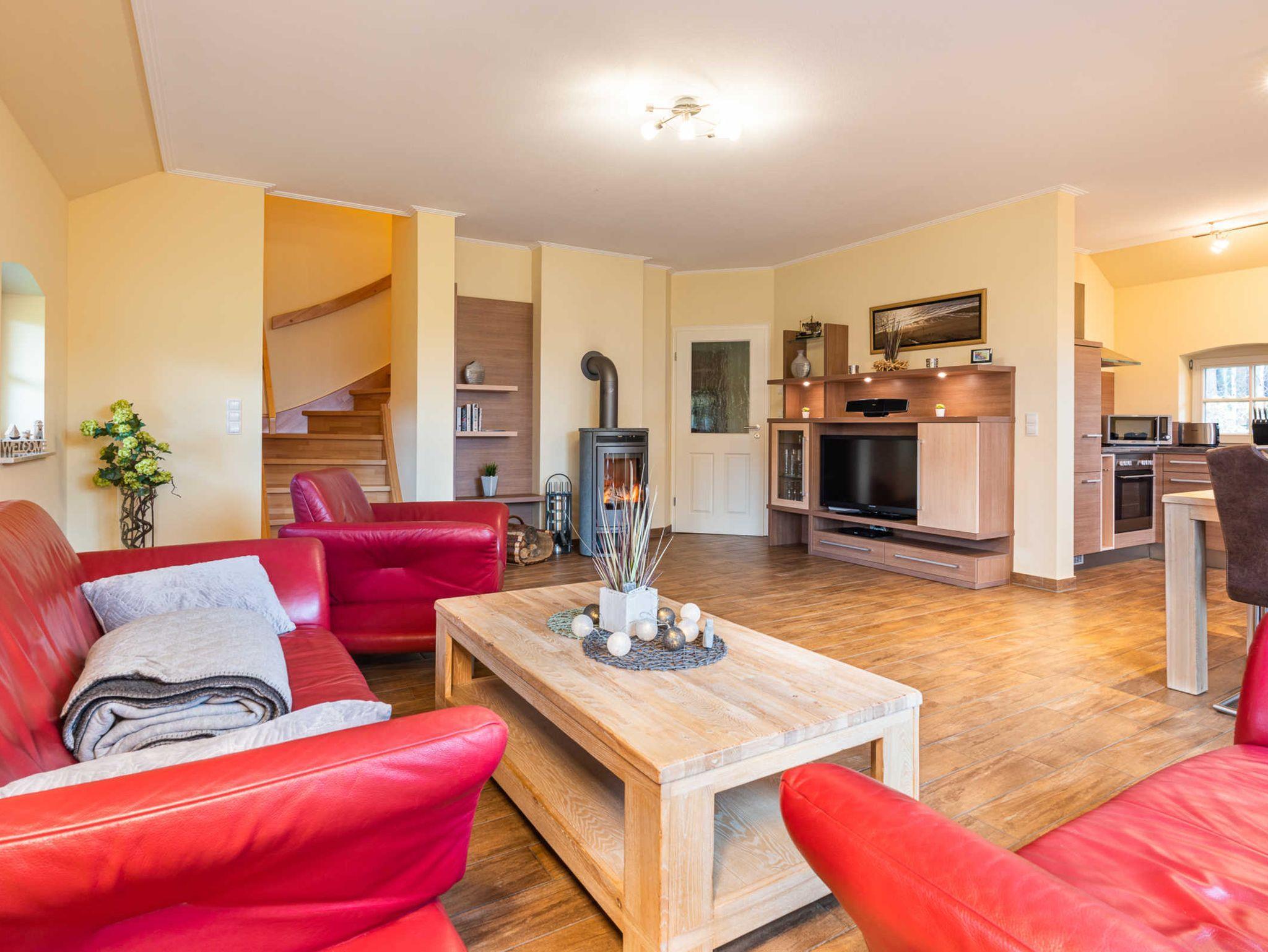 - ein großes Wohnzimmer mit offenen Küchen- und Essbereich