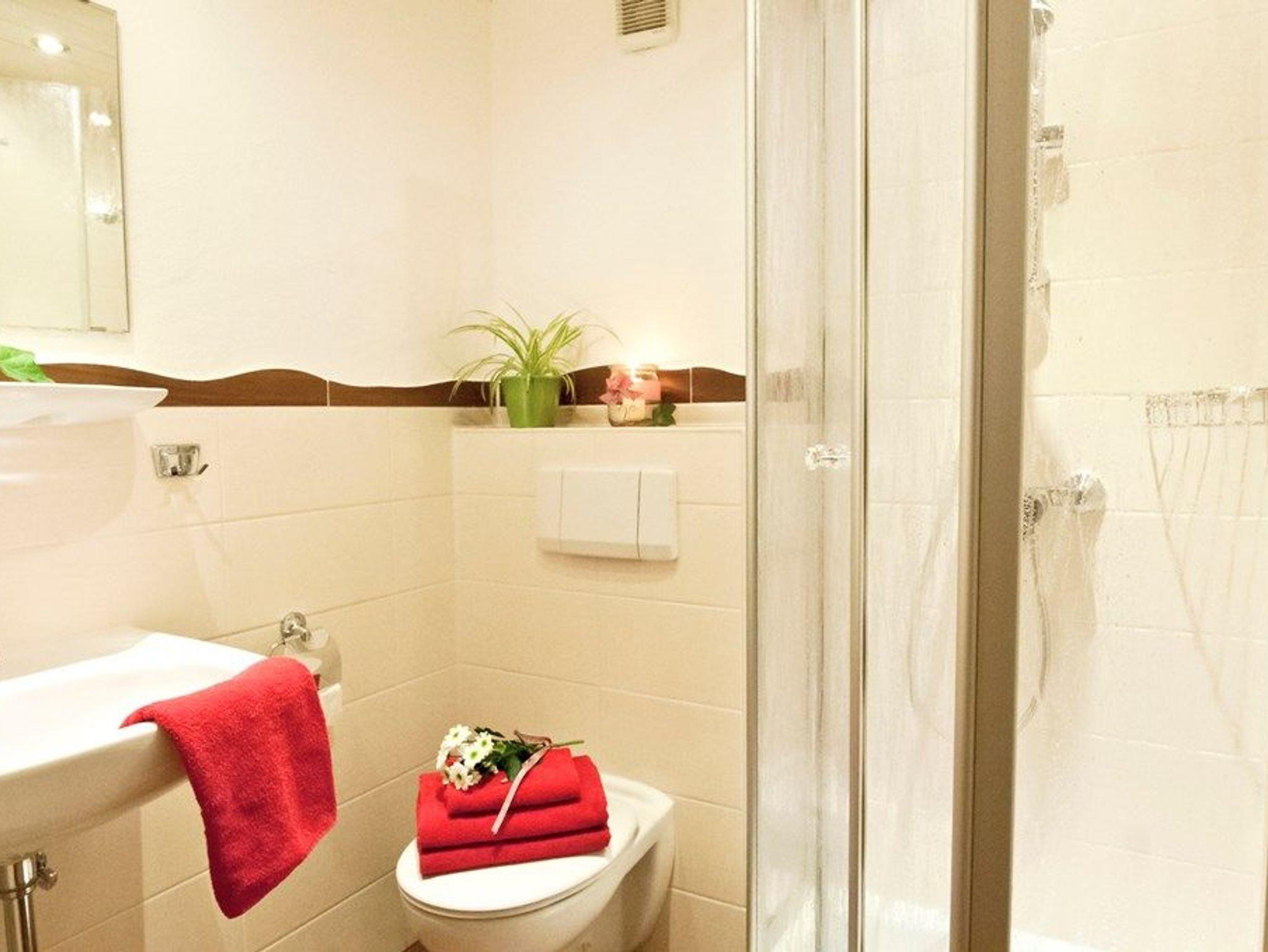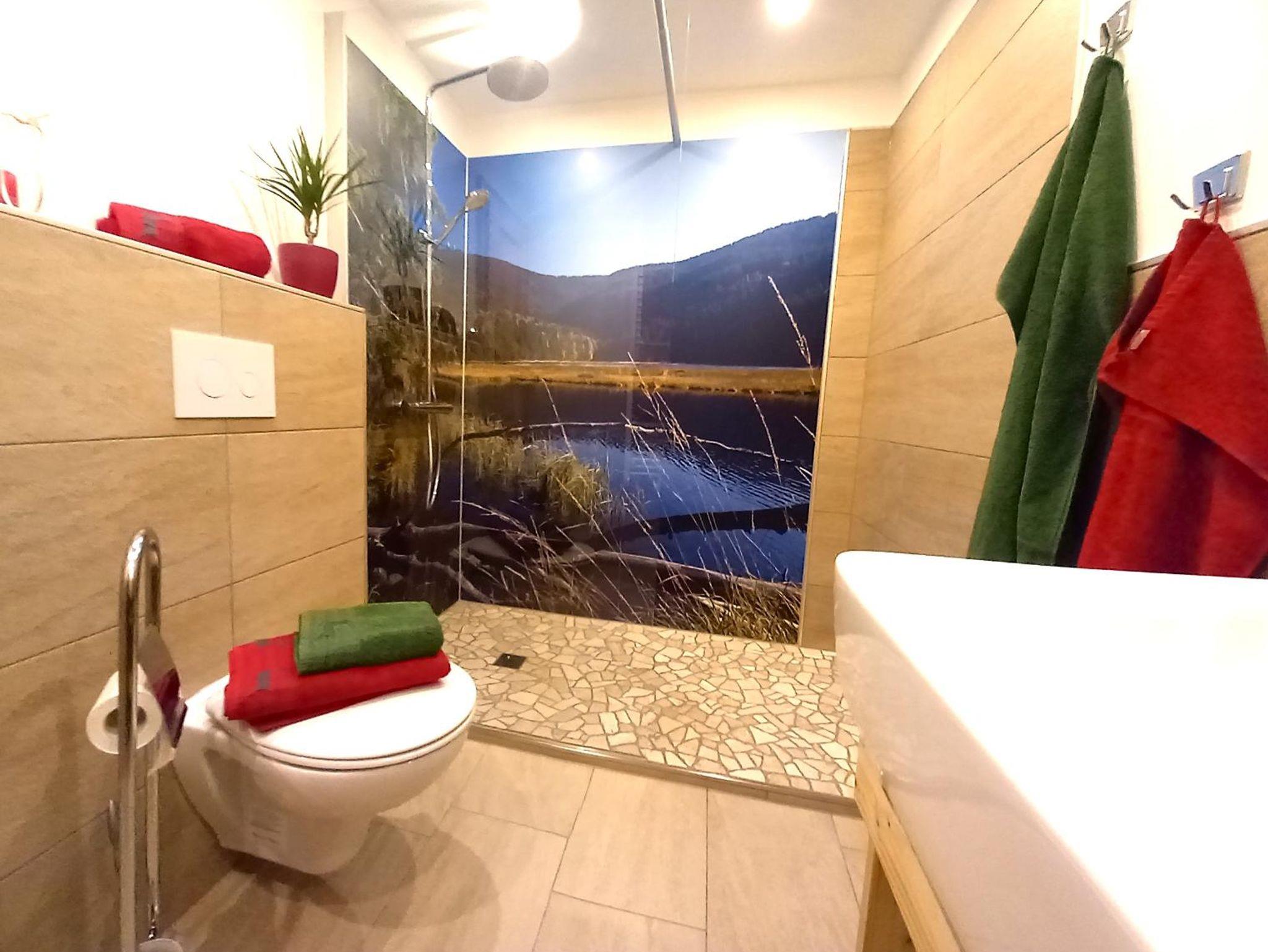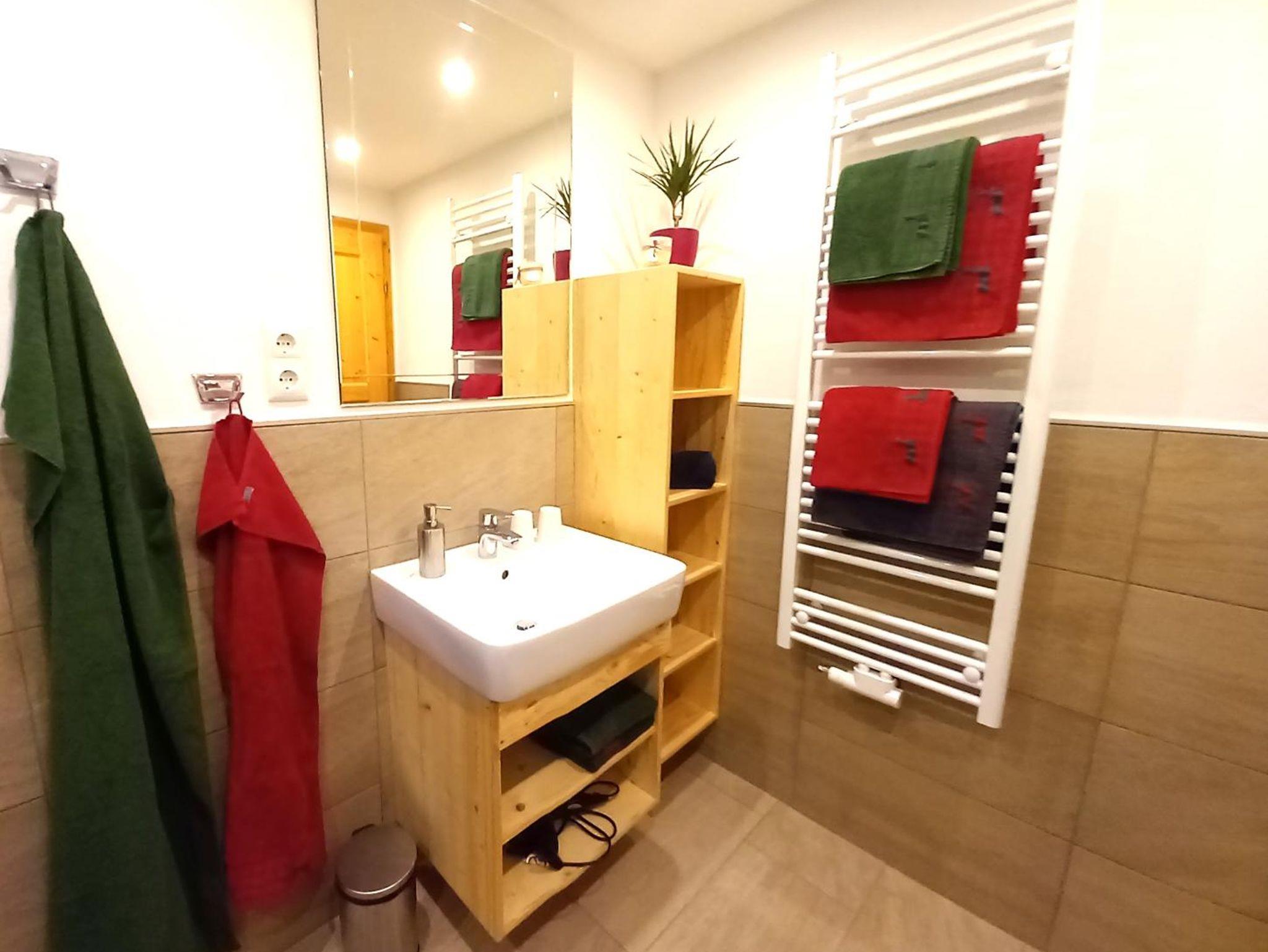 Badezimmer mit Dusche WC, Handtuchtrockner und Fön, Dusch- und Handtücher