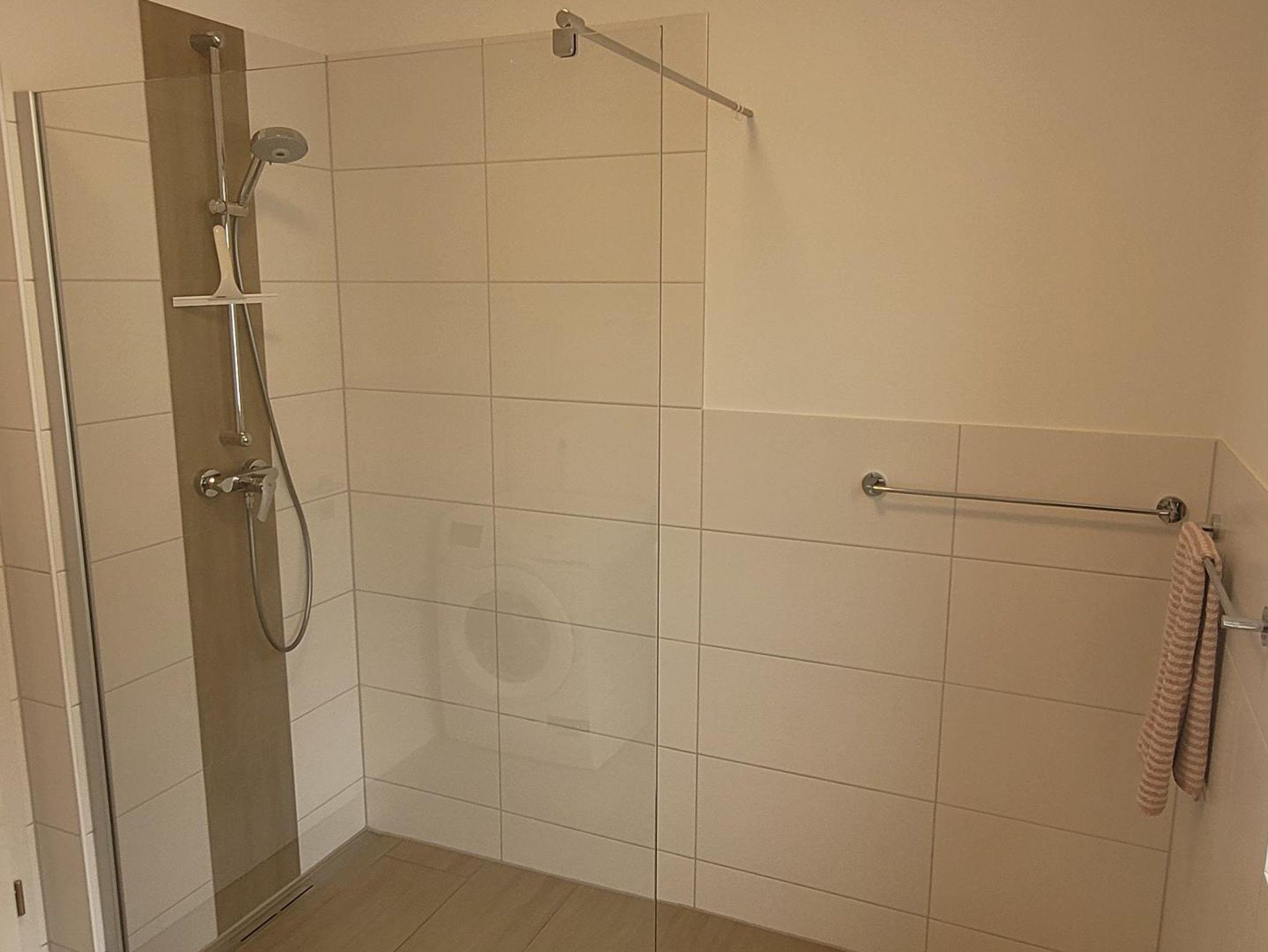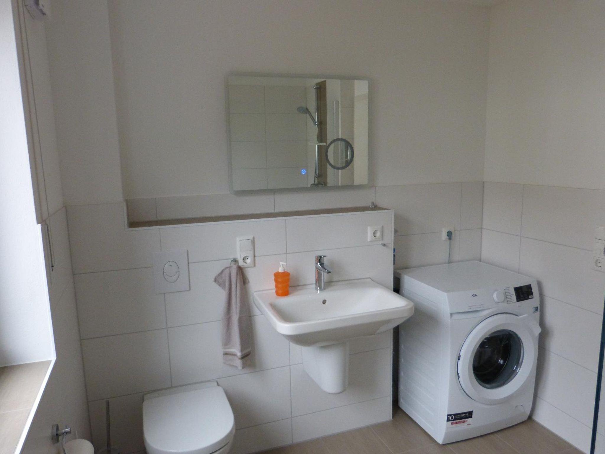 Das geräumige Badezimmer mit ebenerdiger Dusche, Kosmetikspiegel und Waschmaschine lassen keine Wünsche offen.