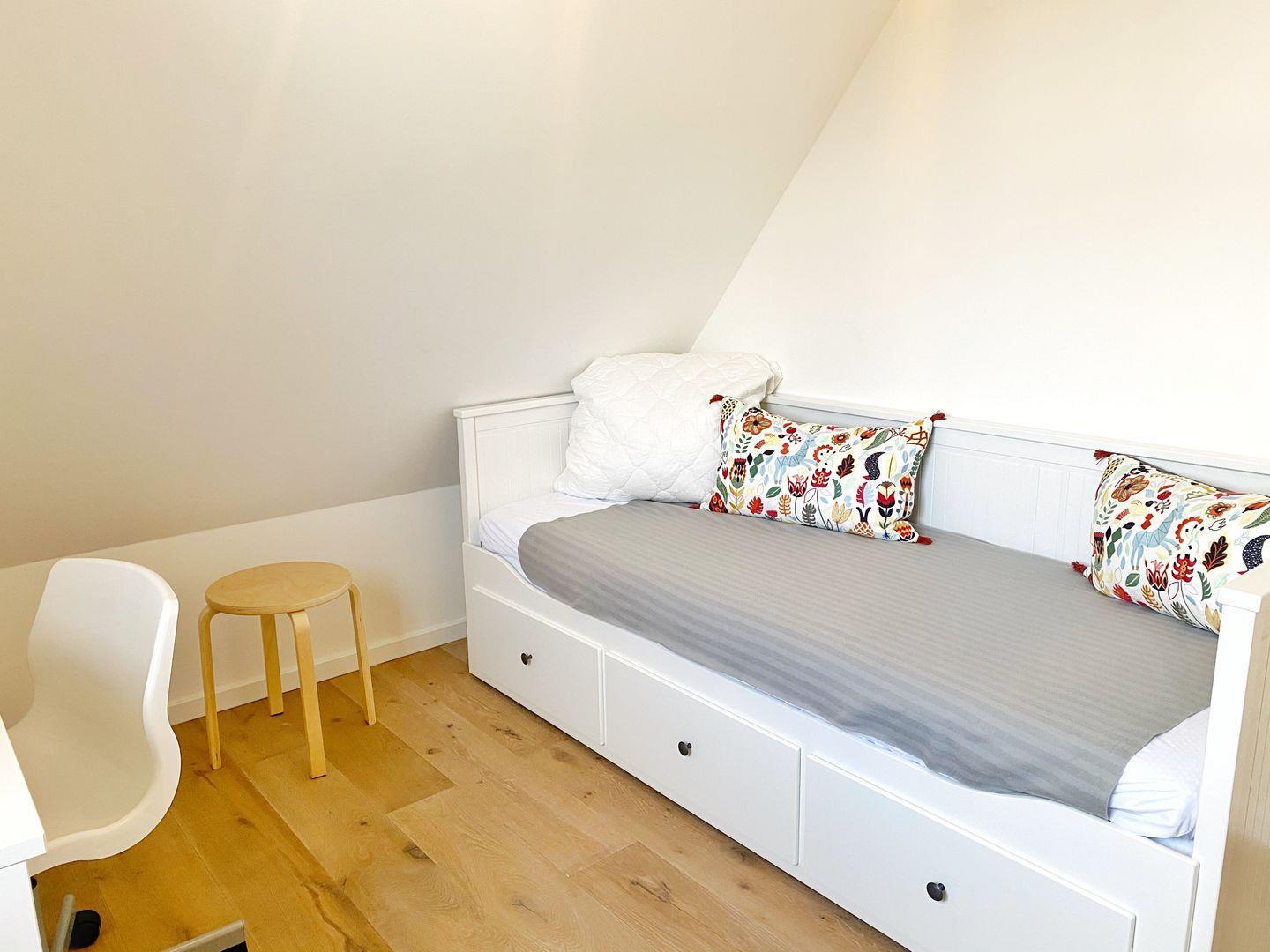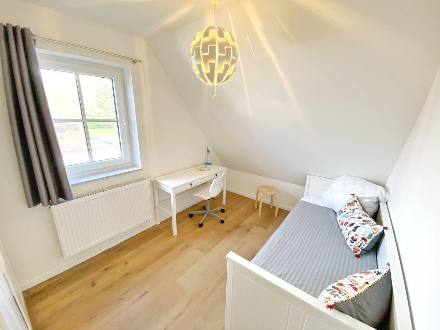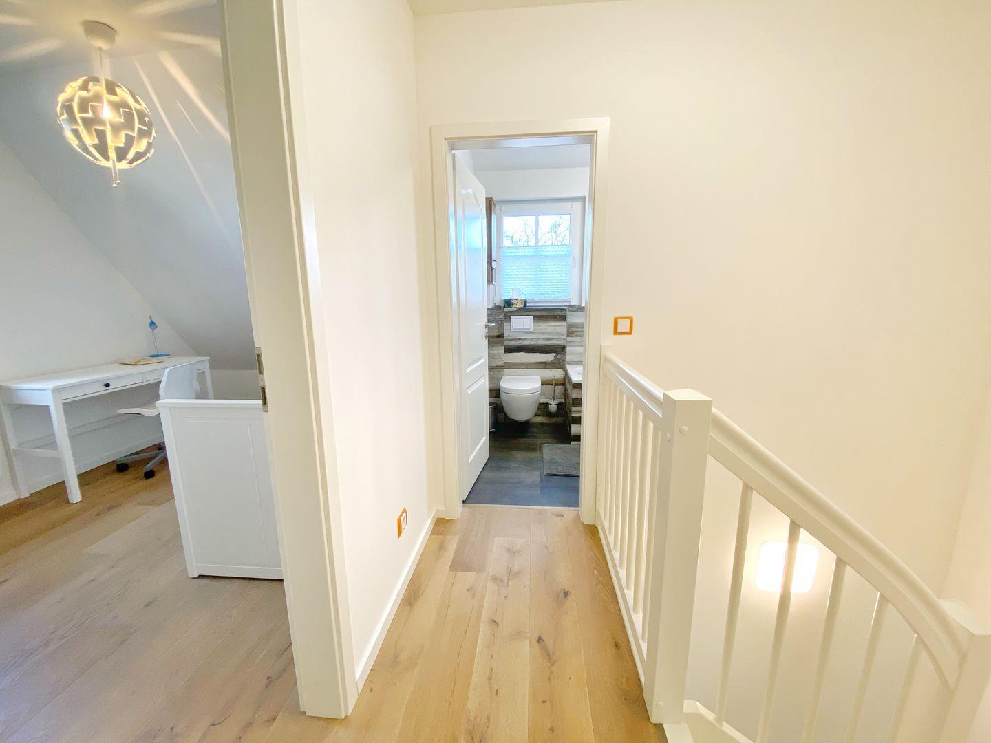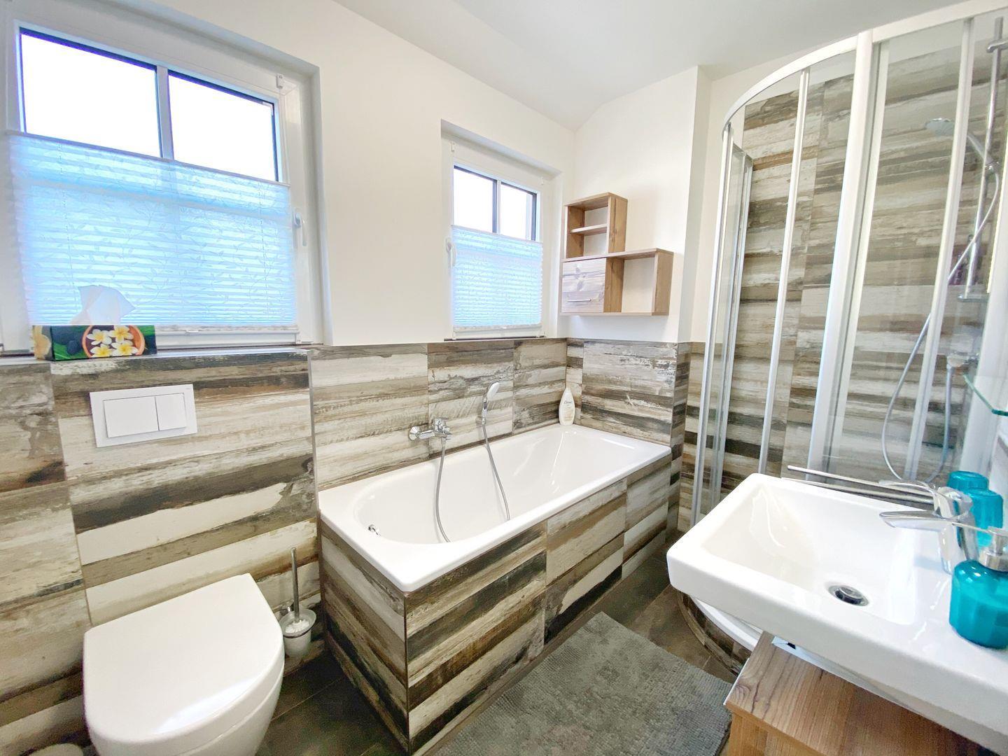 Auf 87qm Wohnfläche finden 4 Personen ausreichend Platz. Im Erdgeschoß der Doppelhaushälfte befindet sich das gemütliche Wohn-Esszimmer mit offener Küche. Von dort gelangt man auf die vorgelagerte Terrasse und in den Garten. Der Wohnbereich ist in warmen Farben und Holzoptik gemütlich und modern eingerichet. Die moderne Einbauküche verfügt über Geschirrspüler, Induktionsherd, Mikrowelle, Kühlschrank mit Gefrierfach, Wasserkocher, Kaffeemaschine Toaster und zahlreiche Küchenutensilien. Im Obergeschoß befinden sich die beiden Schlafzimmer. Das eine Schlafzimmer verfügt über ein bequemes Boxspring-Doppelbett und das andere Schlafzimmer über ein Einzelbett, welches man durch Auszug zu einem Doppelbett vergrößern kann. Im Haus gibt es zwei Bäder, ein kleineres im Erdgeschoß mit Dusche. Das größere Bad im Obergeschoß verfügt zusätzlich zur Dusche auch über eine Badewanne. Zum Haus gehört eine Terrasse mit Gartenmöbeln, ein Carport für den Pkw und ein Schuppen im Garten.