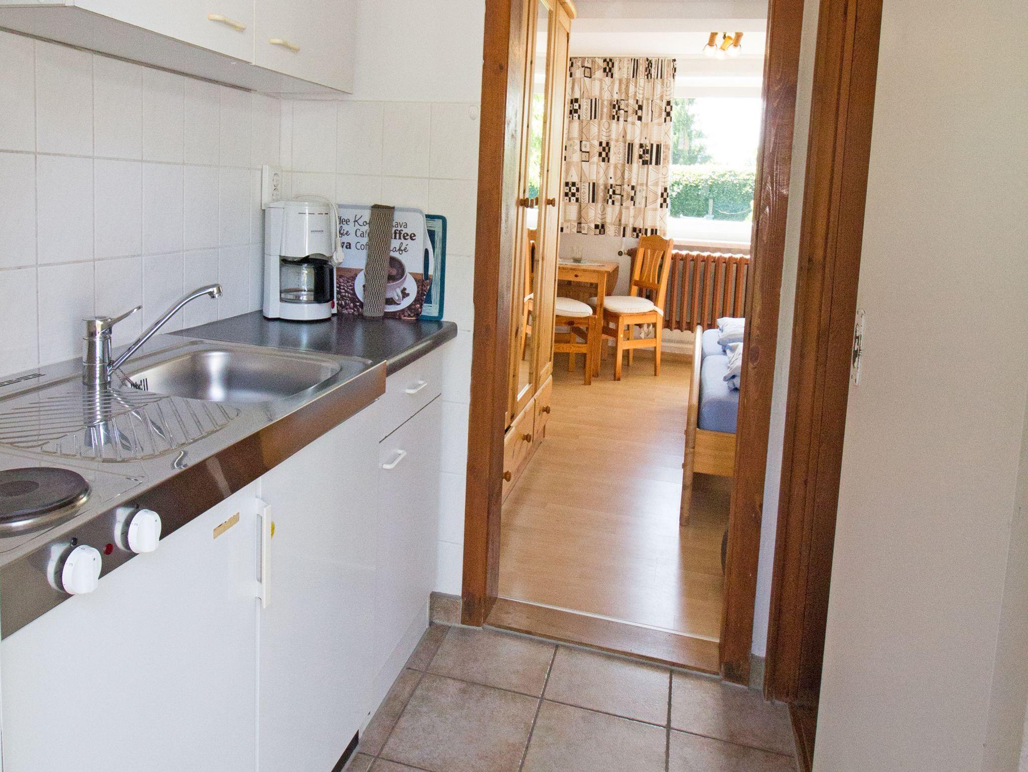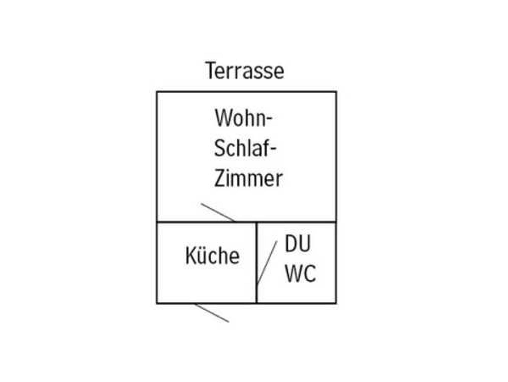 - Im Wohnbereich steht ein Doppelbett, Esstisch mit 2 Stühlen, TV, Radio und eine kleine Küche mit 2 Kochplatten, Kaffeemaschine und Kühlschrank.