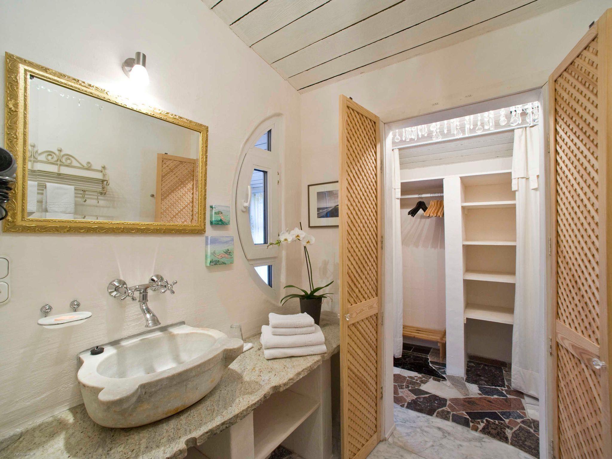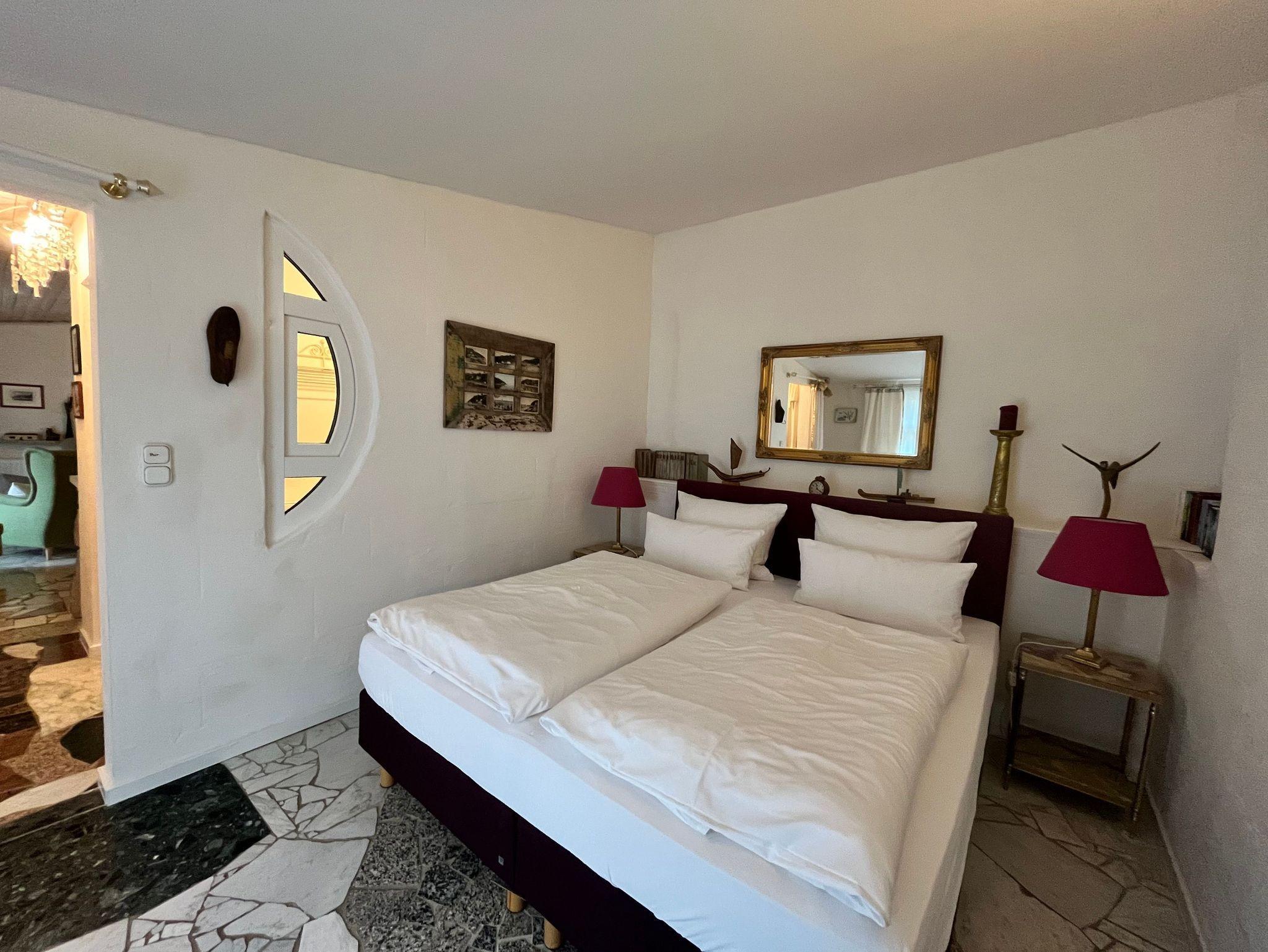 Wohnzimmer mit 2 bequemen Ohrensesseln und Fußhocker, Essecke, Fernseher (SAT-TV/Radio), CD-Stereoanlage, komplett ausgestatteter Küchenbereich mit 2-Platten-Cerankochfeld, Mikrowelle mit Grill- und Heißluftfunktion, Geschirrspülmaschine und Kühlschrank mit Eisfach, Schlafzimmer mit hochwertigem Hotelboxspringbett mit Bandscheiben-Federkernmatratzen (2 x 0,90 m x 2 m) und 2 Nachttischen, Kleiderschrank, Bad mit Dusche, WC, Heizung, Haartrockner und Kosmetikspiegel, Marmorfußboden, große West-Terrasse und eigener Gartenbereich mit modernem Mobiliar, Sonnenschirm, Sonnenliegen und Grillmöglichkeit