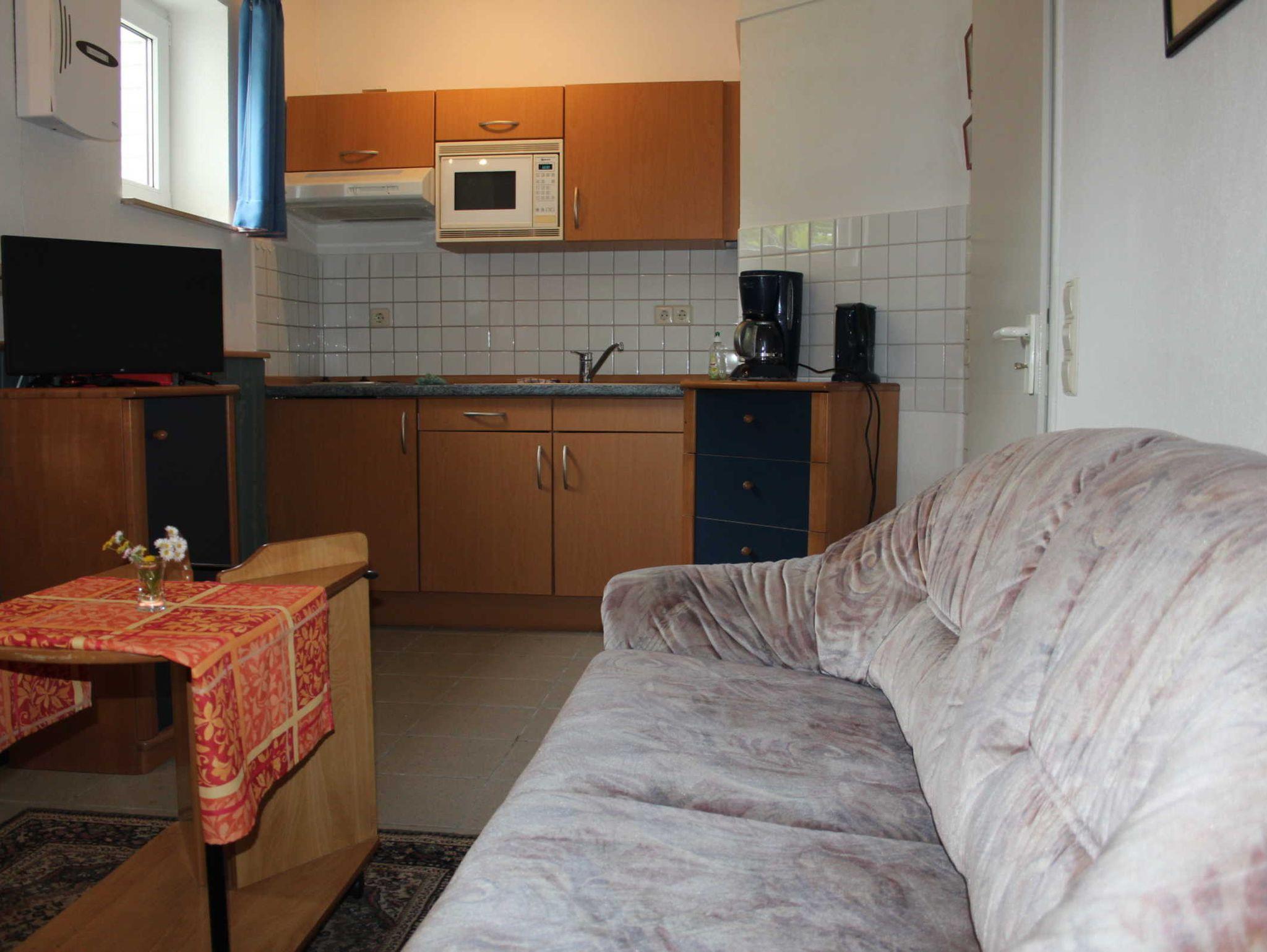 Das 25 Quadratmeter grosse Appartment ist ausgestattet mit einem kombinierten Wohn- und Schlafbereich (mit einem Doppelbett), einer offenen Küche und einem Duschbad.