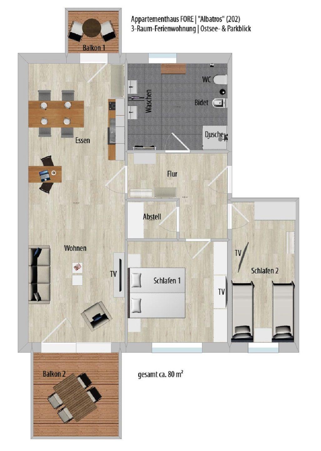 Natur, Komfort, Wellness, Ruhe - all das bietet Ihnen das geräumige 3-Raum-Appartement "Albatros". Es bezaubert mit praktisch aufgeteilten Wohlfühlfläche von ca. 79 qm.Hinzu kommen zwei Balkone, einer mit Ostseeblick und einer mit Blick in den Park. Harmonisch eingebettet neben dem Nationalpark Jasmund, nahe der berühmten Kreideküste, bietet Ihnen das "Albatros" alle Vorteile für einen erholsamen und naturreichen Urlaub auf der Insel Rügen.