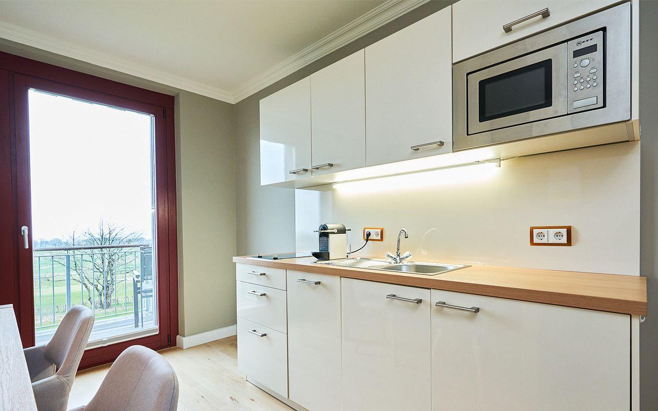 Das im Februar 2020 komplett renovierte 2-Raum-Appartement bezaubert mit einer Größe von 72 qm. Es befindet sich im Obergeschoß des Appartementhauses Fore auf dem Anwesen von Schloss Ranzow. Über den Flur gelangen Sie in den Wohnbereich mit Küchenzeile. Das Schlafzimmer bietet ein Doppelbett sowie ein Bettsofa als Aufbettung für eine weitere Person. Die Wohnung verfügt weiterhin über ein Bad mit Dusche und WC. Für Ihr Gepäck bietet zusätzlich ein kleiner Abstellraum im Flur Platz.
