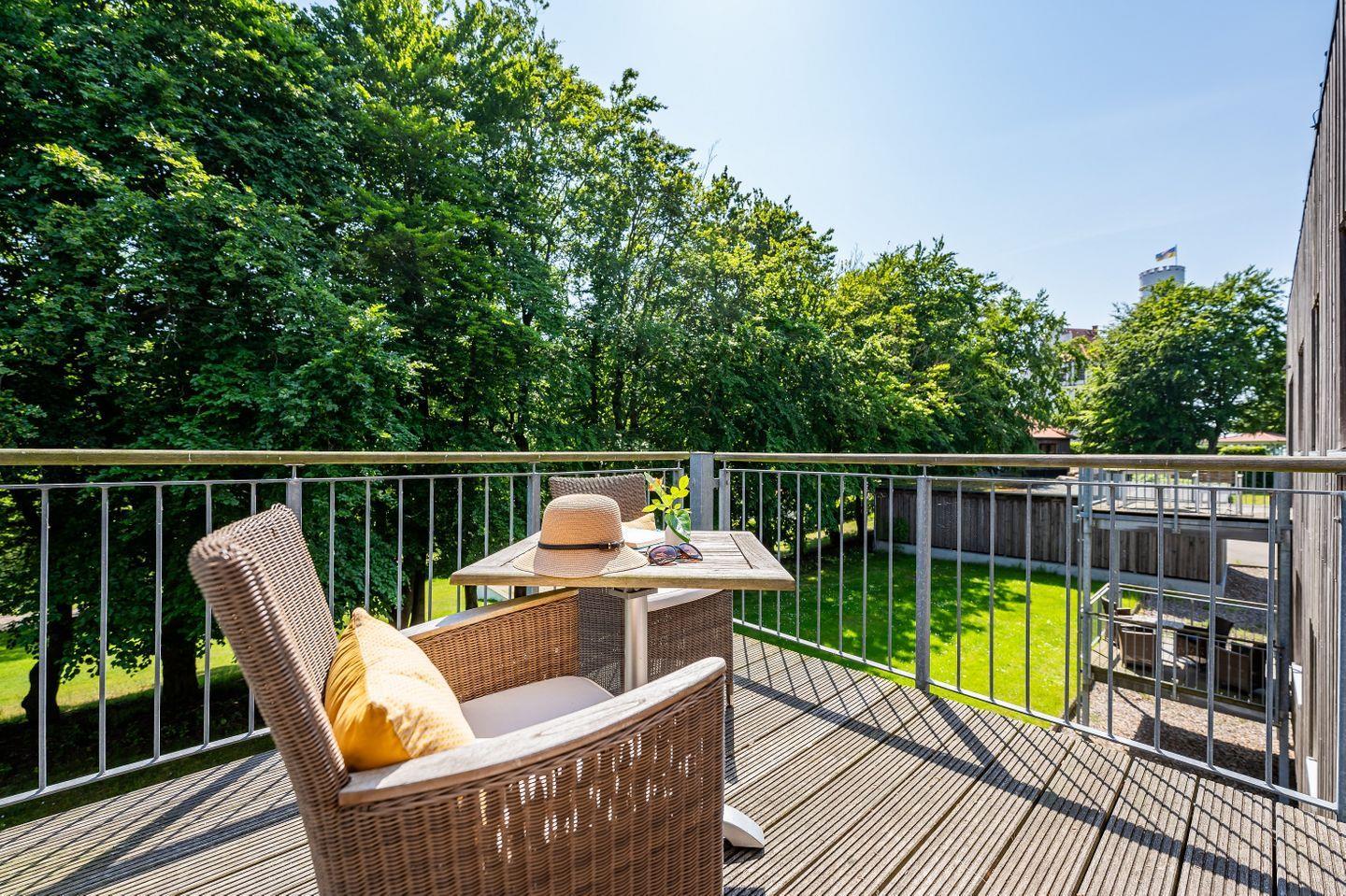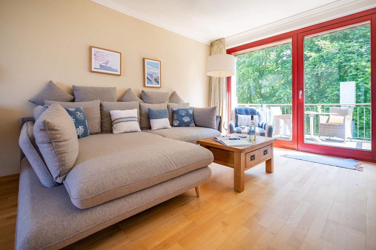 Sie verfügt über ein Schlafzimmer, eine Küchenzeile, ein großes, helles Duschbad mit Doppelwaschbecken sowie über einen geräumigen Flur mit kleinem Abstellbereich. Das besondere Highlight der Ferienwohnungen - sie verfügt über zwei Balkone mit bodentiefen Panoramafenstern. Von hier aus haben Sie einen traumhaften Ausblick auf das Meer, den Golfplatz, den Nationalpark und den Schlossgarten.