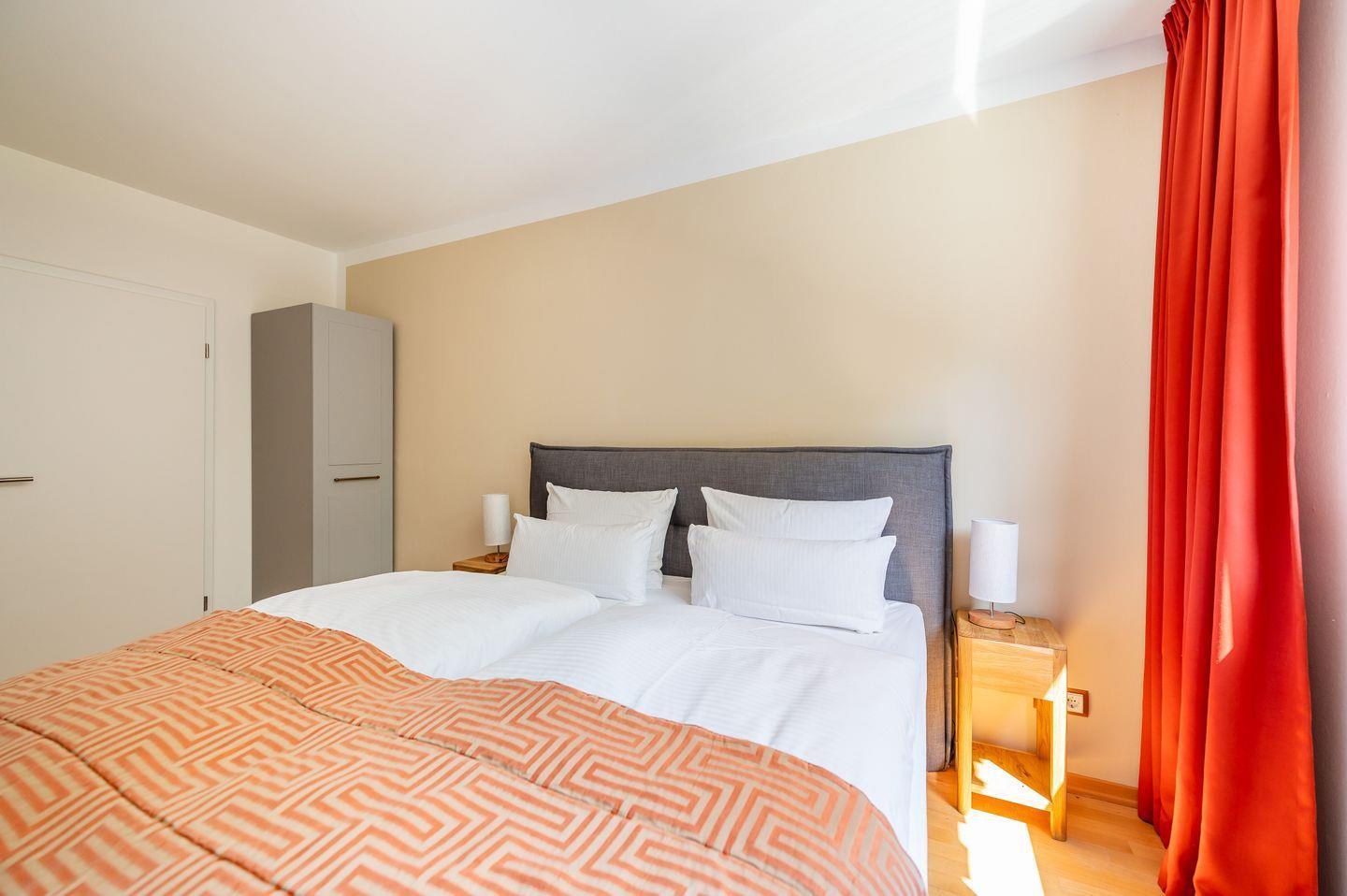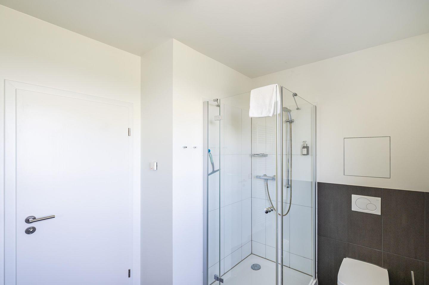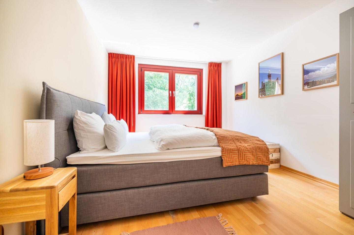 Sie verfügt über ein separates Schlafzimmer mit einem Boxspringbett (180 x 210), eine integrierte und voll ausgestattet Küchenzeile, ein großes, helles Duschbad mit Doppelwaschbecken, sowie über einen geräumigen Flur mit kleinem Abstellbereich. Das besondere Highlight der Ferienwohnungen - sie verfügt über zwei Balkone mit bodentiefen