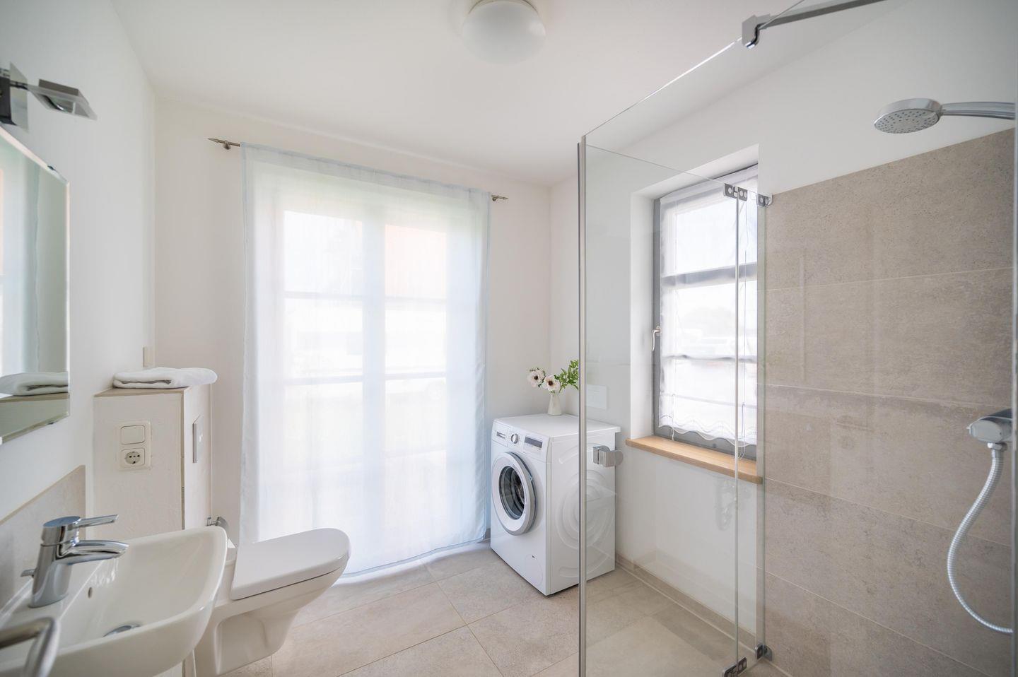 Ein modernes Duschbad mit Toilette im Erdgeschoss. Ein weiteres lichtdurchflutetes modernes Duschbad mit Toilette im Obergeschoss.