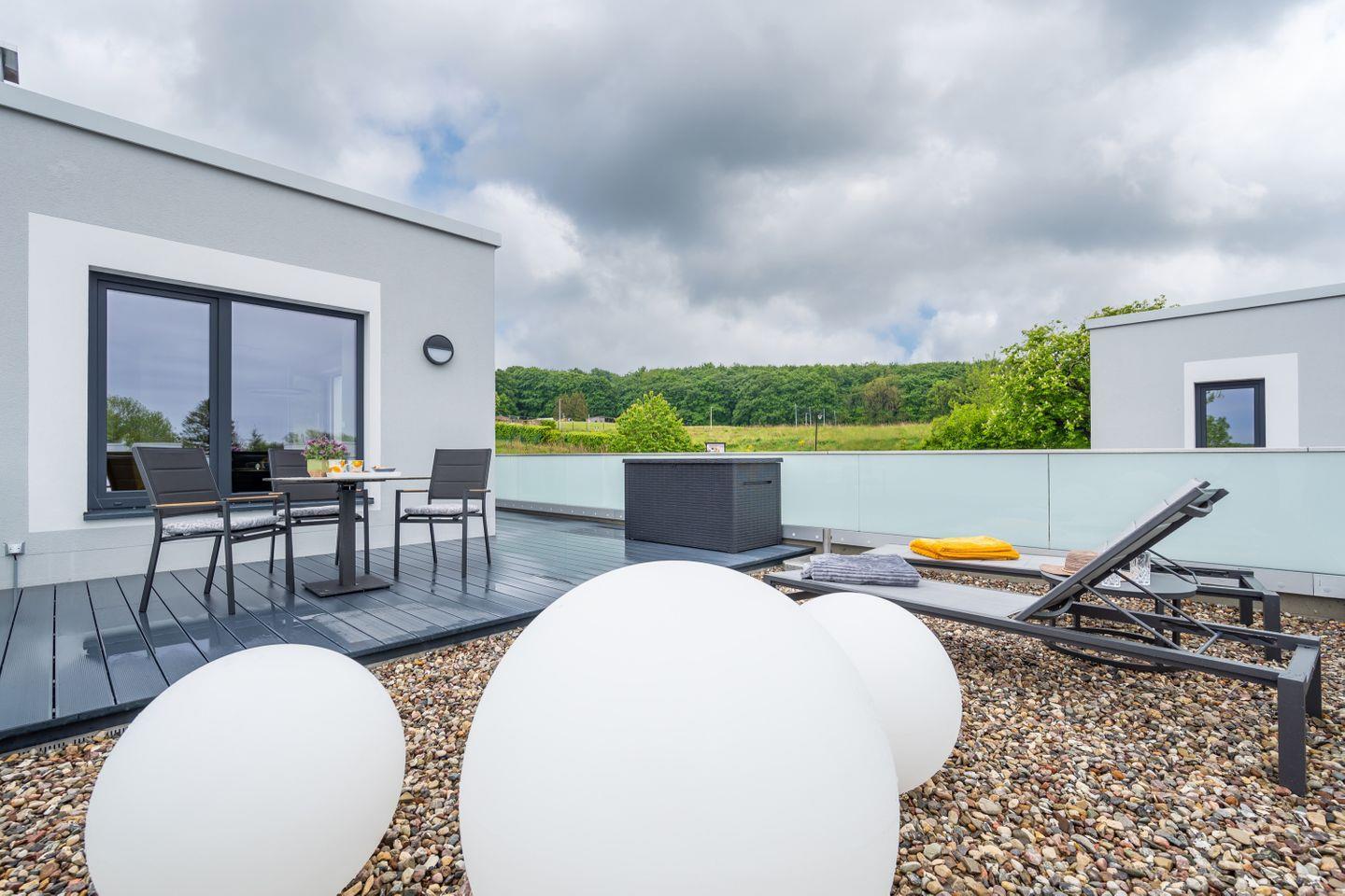 Die moderne Ferienwohnung befindet sich im Obergeschoß der neuen Villa Schlossblick. Ihren Namen hat sie durch den direkten Blick auf das denkmalgeschützte Schloss Ranzow erhalten. Verteilt auf 2,5 Räume mit einer komfortablen Wohnfläche von ca. 67 qm und einer paradiesischen, vollbestückten Sonnenterrasse von ca. 46 qm, die vom Wohnzimmer aus betreten wird. Von hier haben Sie einen fantastischen Blick auf den Golfplatz, auf das historische Schloss Ranzow und in den Nationalpark. Sie überzeugt Sie mit Ihrer lichtdurchfluteten Leichtigkeit, modernem Interieur und der Liebe zum Detail.