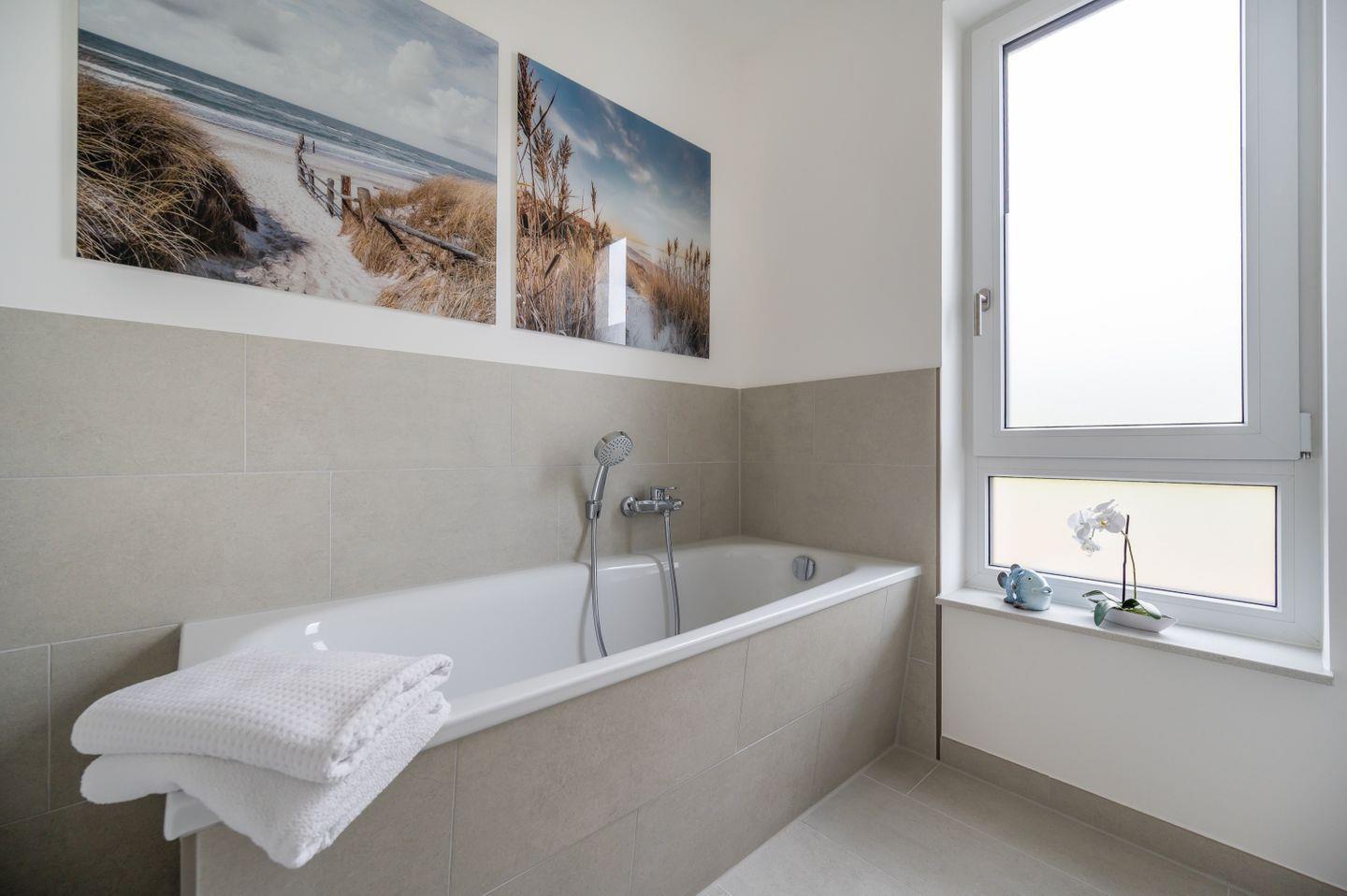 Die im Obergeschoss gelegene Wohnung für bis zu 2 Personen und einem Kleinkind verteilt sich auf 2,5 Räume mit einer Wohnfläche von 67qm. Der Wohnbereich verfügt über Flachbild-TV und einem Essbereich mit Küchenzeile. Im Schlafzimmer finden Sie ein Boxspringbett und einen zusätzlichen TV sowie einen begehbare Ankleidebereich. Das Badezimmer mit ebenerdiger Dusche, Badewanne, WC und Handtuchheizung vervollständigt die Wohnung. Eine Ladestation für E-Autos befindet sich direkt am Haus.