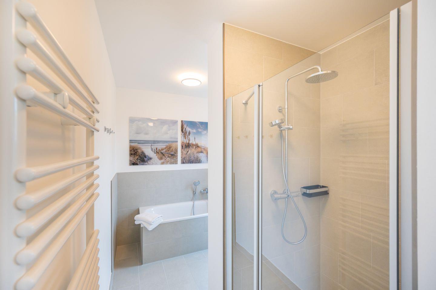 Das moderne Badezimmer mit ebenerdiger Dusche, Badewanne, WC und Handtuchheizung vervollständigt das stilvolle Essemble dieser Wohnung.