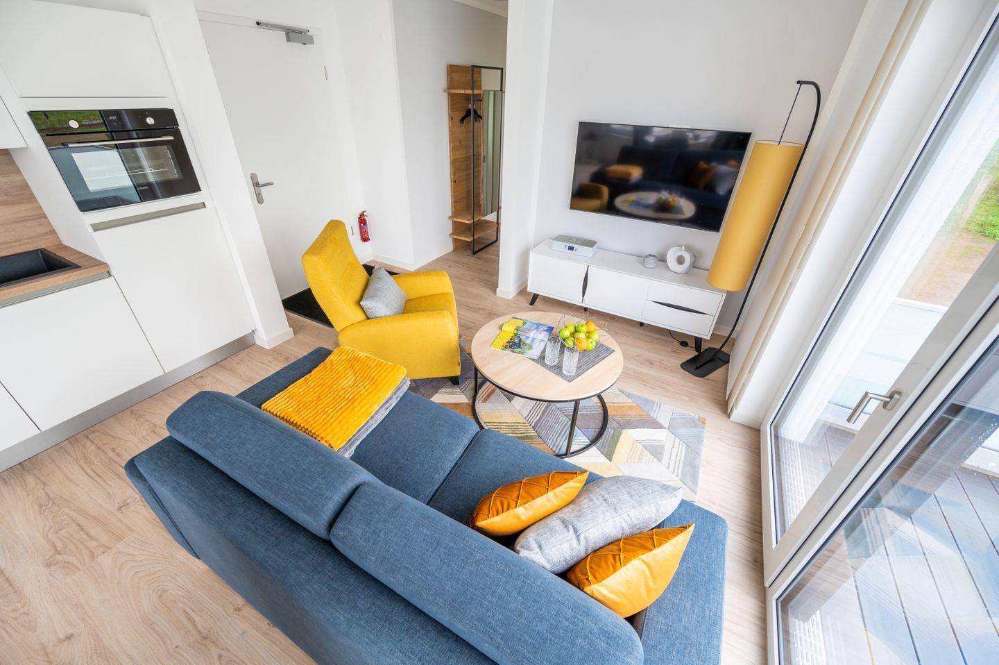 Mit Eintritt in die Wohnung gelangen Sie in den großzügig geschnittenen Wohnbereich mit gemütlicher Couchgarnitur, Flachbild-TV, kostenfreiem W-LAN, einem schönen Essbereich mit herrlichem Blick in die Natur sowie der harmonisch im Raum integrierten, vollständig ausgestatteten Küchenzeile. Die moderne Küchenzeile verfügt über ein Induktionskochfeld, einen Backofen, einen Kühlschrank, eine Spülmaschine, Senseo-Kaffeemaschine und diversen Kleininventar, das die hochwertige Küchenausstattung komplettiert.