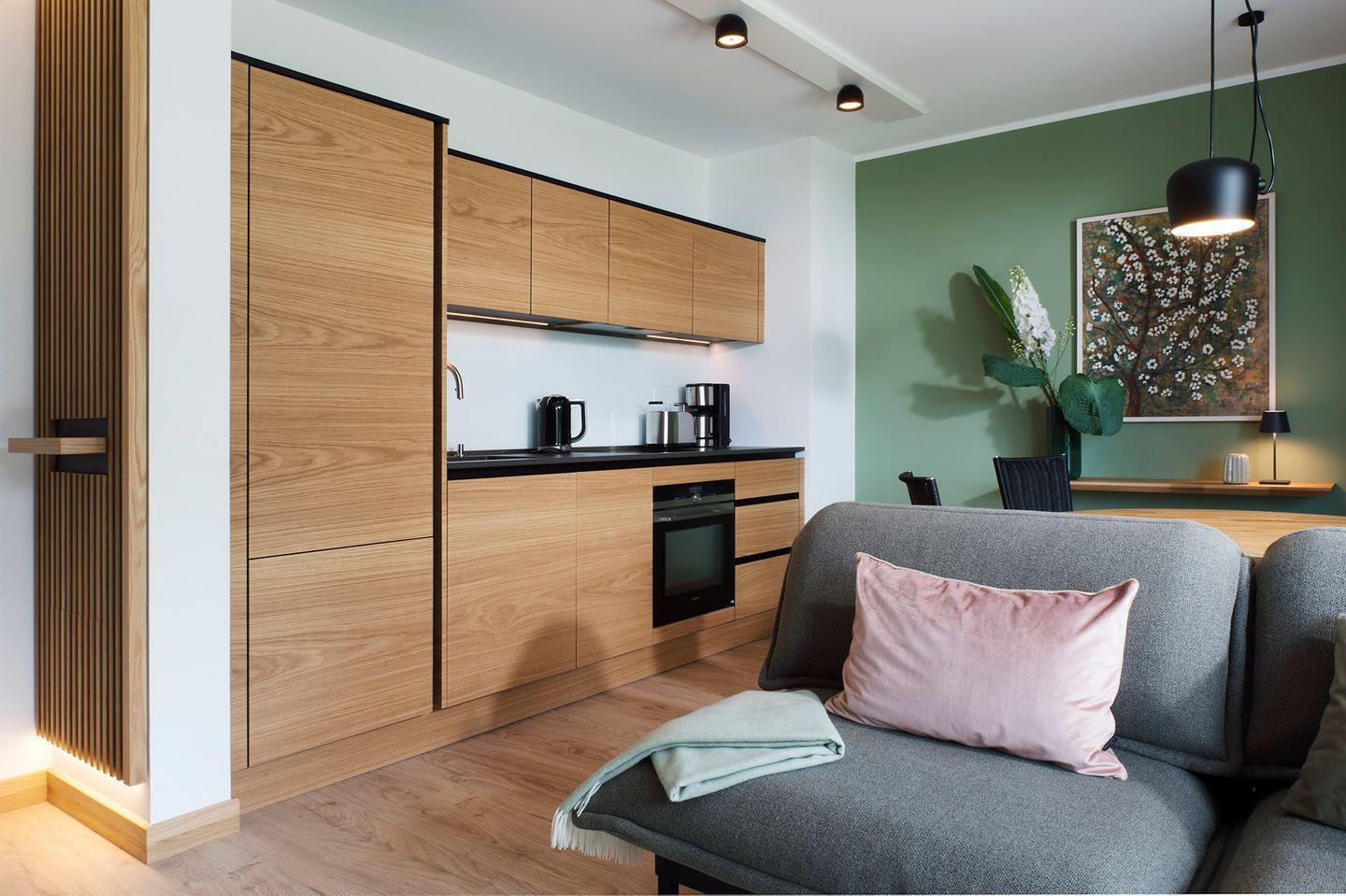 Fine Interiors: Die Lohme Luxury Living L3 begeistert auch mit innerer Schönheit. Das gesamte Apartment ist im Retro-Stil modern-minimalistisch funktional gestaltet. Ausgelegt mit hochwertigem Laminat plus Fußbodenheizung, ist dieses Design-Domizil ein Maximum an Formschönheit. Exklusive, handgefertigte Holzdesignarbeiten bringen hochklassiges Eichen-Interieur in alle Räume, meisterlich erschaffen von der renommierten Rügener Tischlerei Koepke und Kasiske. Ein Sehnsuchtsplatz im Wohnzimmer bildet die inspirierende Couch, designed by Rolf Benz. Die Exklusiv-Küche, Design by Eric Koepke, der Tulip-Esstisch, FLOS-Leuchten sowie große, lichtdurchflutete Fensterflächen machen die Lohme Luxury Living L3 zu dem, was sie ist: einzigartig für Ihre Auszeit.