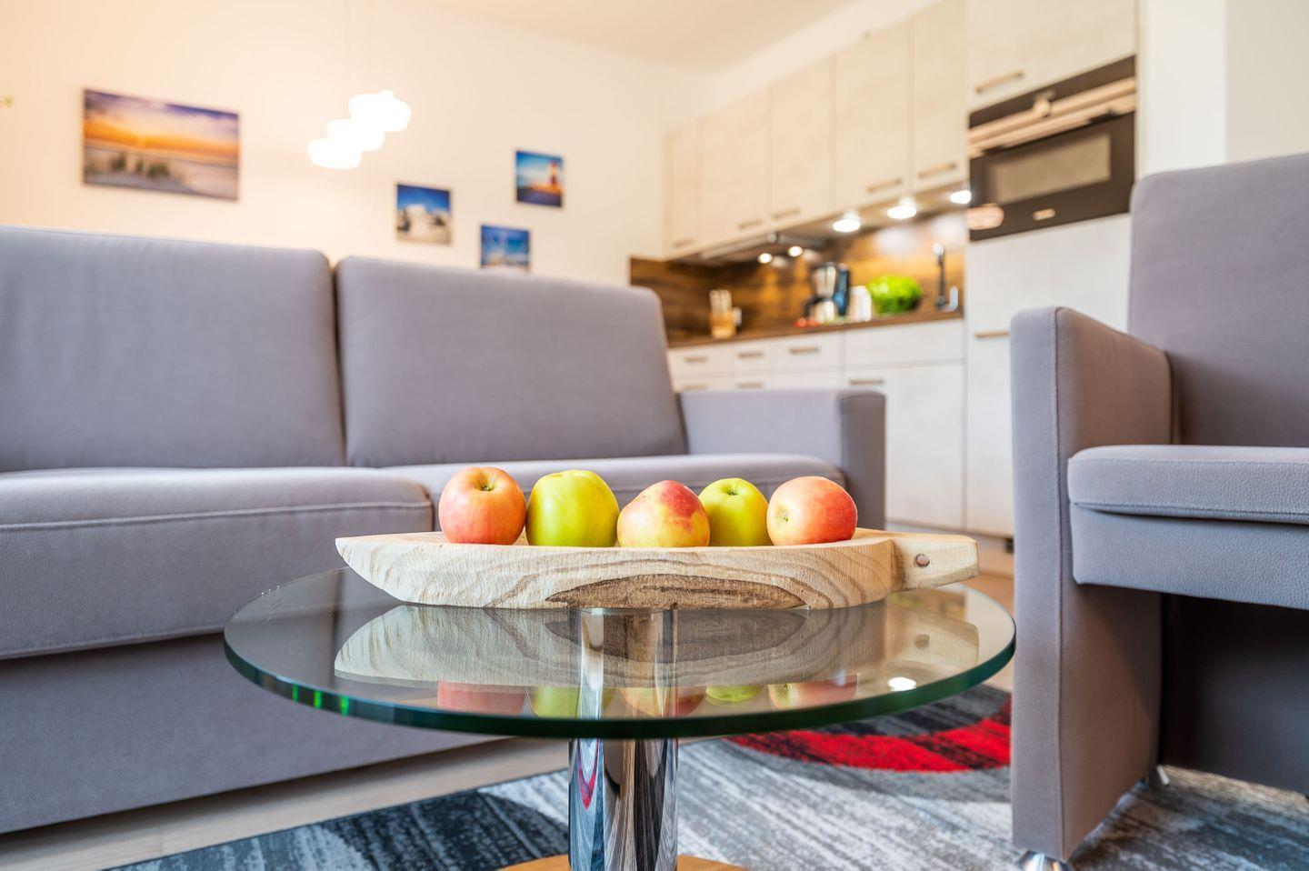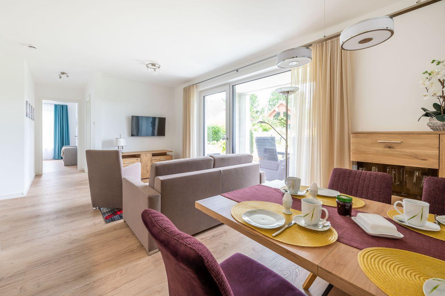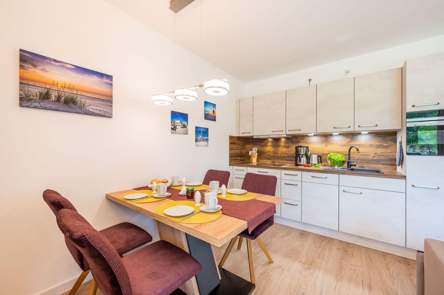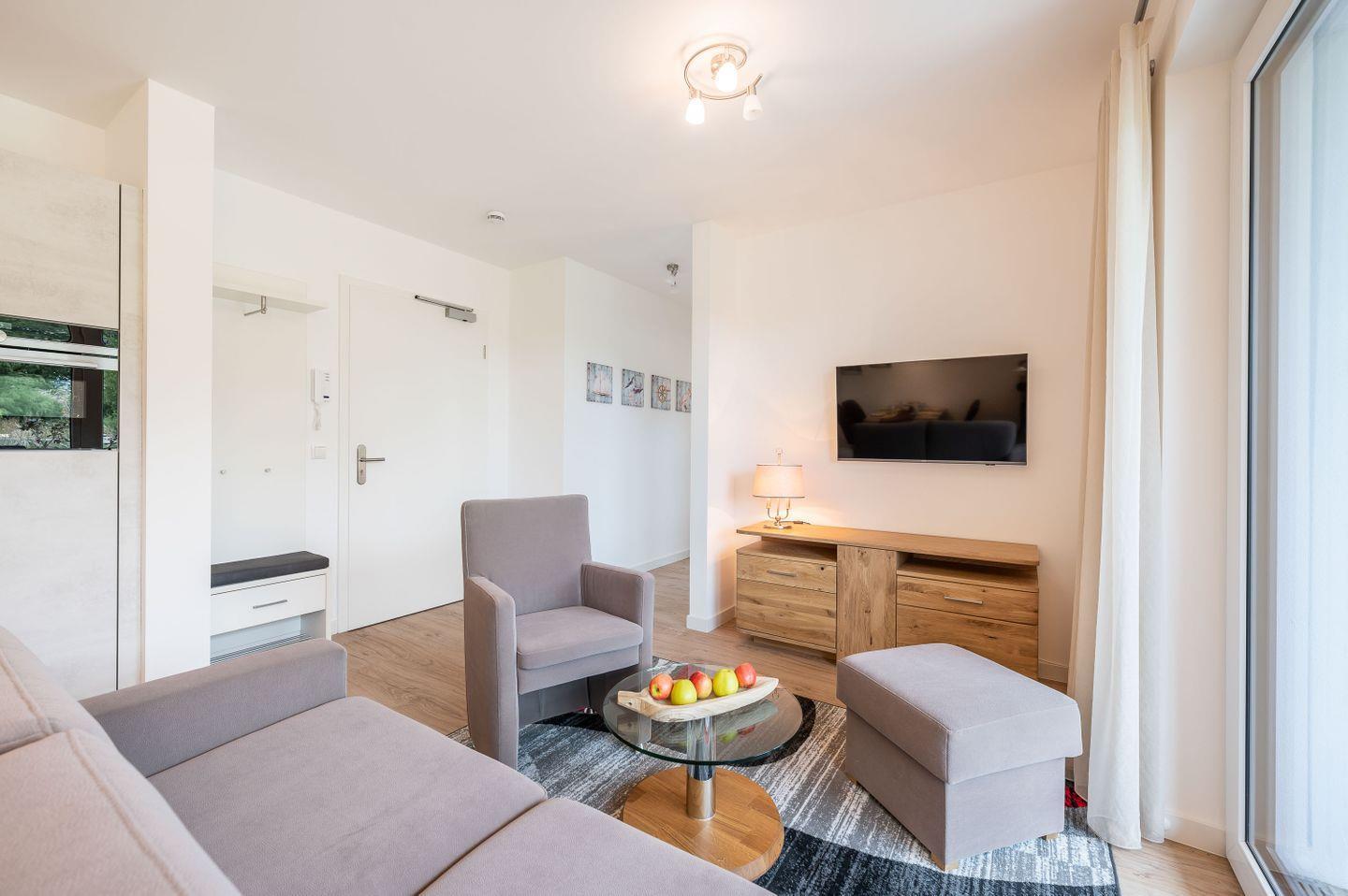 Mit Betreten der Wohnung werden Sie im offenen und lichten Wohn-/Essbereich herzlich von dem modernen, freundlichen Interieur empfangen. WLAN und Smart-TV von Phillips gehören selbstverständlich zum Standard.