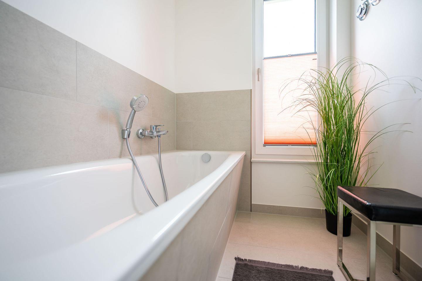 Den morgendlichen Frischekick erhalten Sie in dem hellen Fensterbad mit ebenerdiger Dusche. An frischen Tagen hilft ein schönes Bad - Ausblick inklusive.