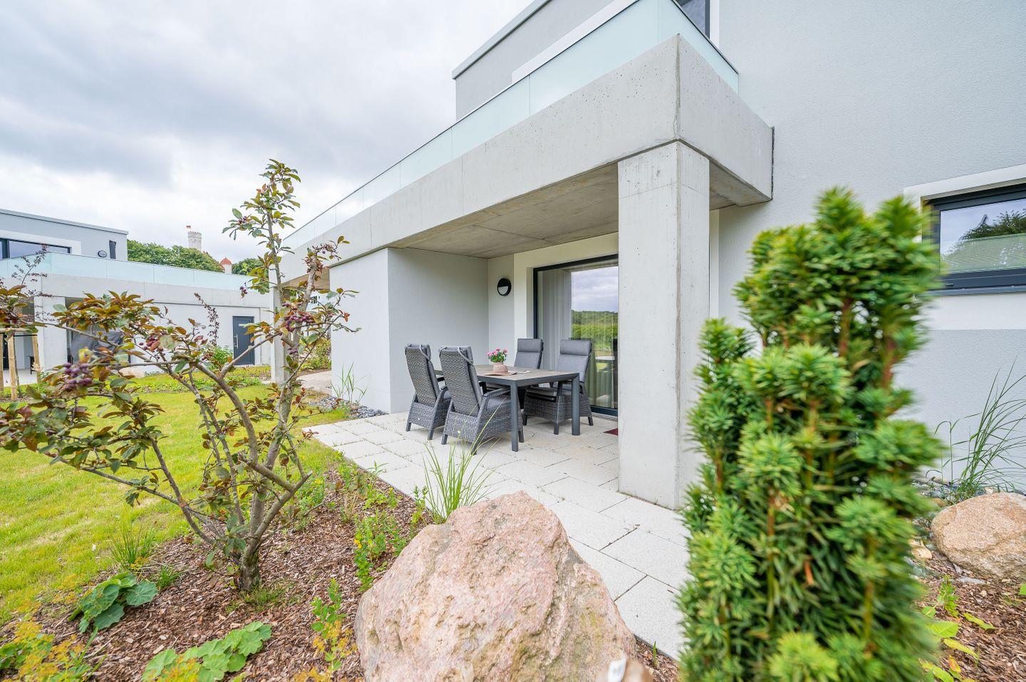 Die moderne, kleine Wohnanlage im minimalistischen Baustil wurde im Jahr 2022 neu errichtet und besteht aus 6 Häusern. Sie befindet sich in Lohme, Ortsteil Ranzow auf der Halbinsel Jasmund im Nordosten der Insel Rügen, in unmittelbarer Nähe zum Schloss Ranzow mit seinem 18 Loch-Golfplatz, unmittelbar am Nationalpark Jasmund und der idyllischen Steilküste Rügens. In jedem der sechs Häuser gibt es zwei Wohnungen, eine im Erdgeschoß und eine im Obergeschoss. Zu jeder Wohnung gehört ein überdachter Pkw-Stellplatz direkt vor der Tür. Die Wohnanlage bietet für Naturliebhaber und Wanderer einen idealen Ausgangspunkt für tolle Ausflüge in die traumhafte Landschaft; für Golfer ist es ideal gelegen direkt am Golfplatz und für Genussmomente bietet sich das Schloss Ranzow mit seinem Restaurant EARL und Wellnessbereich mit Saunalandschaft und Bio-Outdoorpool (saisonal) nur 2 Gehminuten entfernt. Auch nach Lohme mit seinem kleinen, idyllischen Hafen für Segler und Sportboote und guter Gastronomie ist es nur ein Katzensprung.