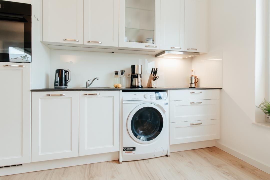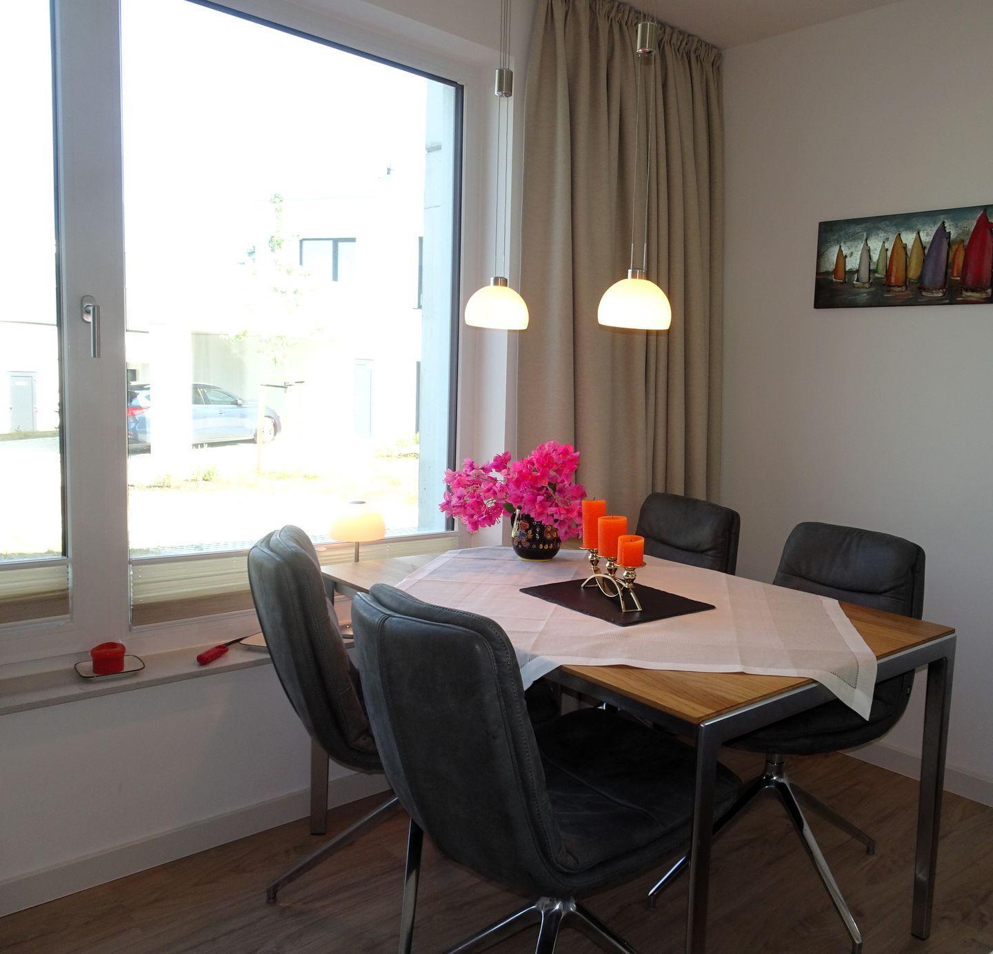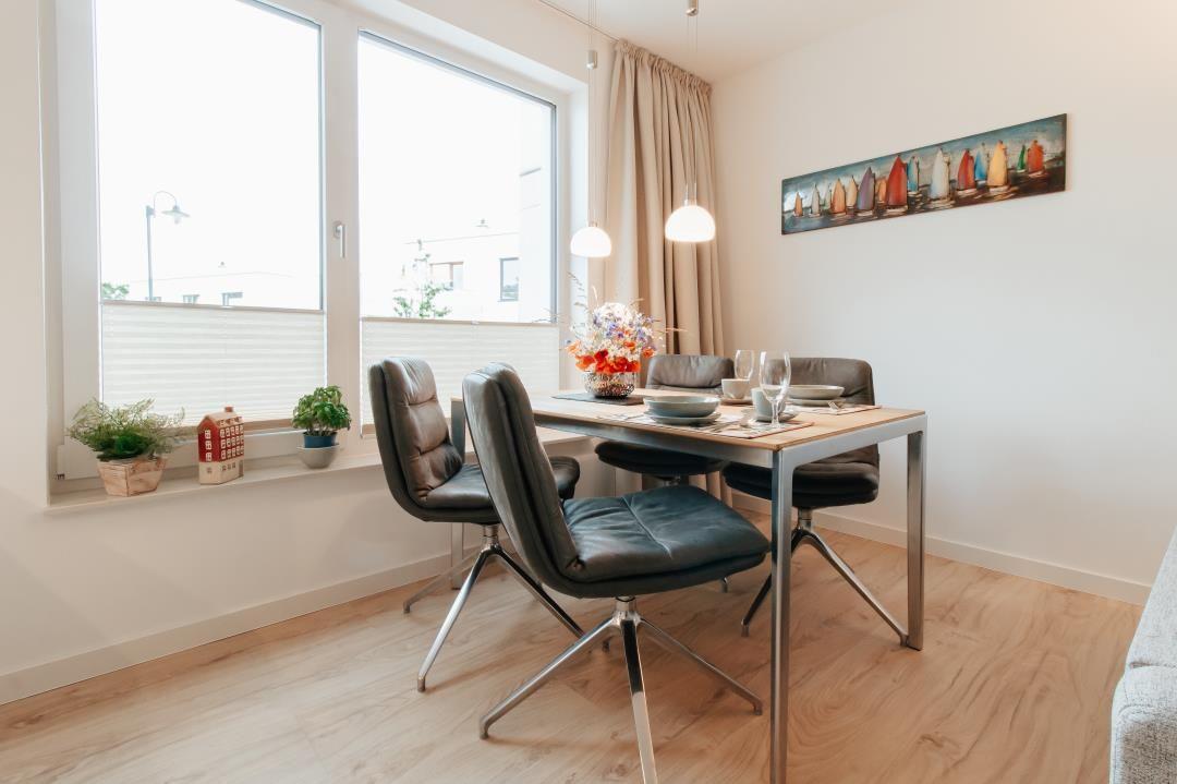 Der offene Wohn- und Essbereich mit bodentiefen Fenstern sorgt für viel Tageslicht und Wohlfühlatmosphäre. Hochwertige Möbel und ein modernes Design schaffen ein elegantes Ambiente. Die offene Küche ist voll ausgestattet – perfekt für entspannte Kochmomente. Auf dem Schlafsofa finden zwei Kinder oder eine erwachsene Person bequem Platz.