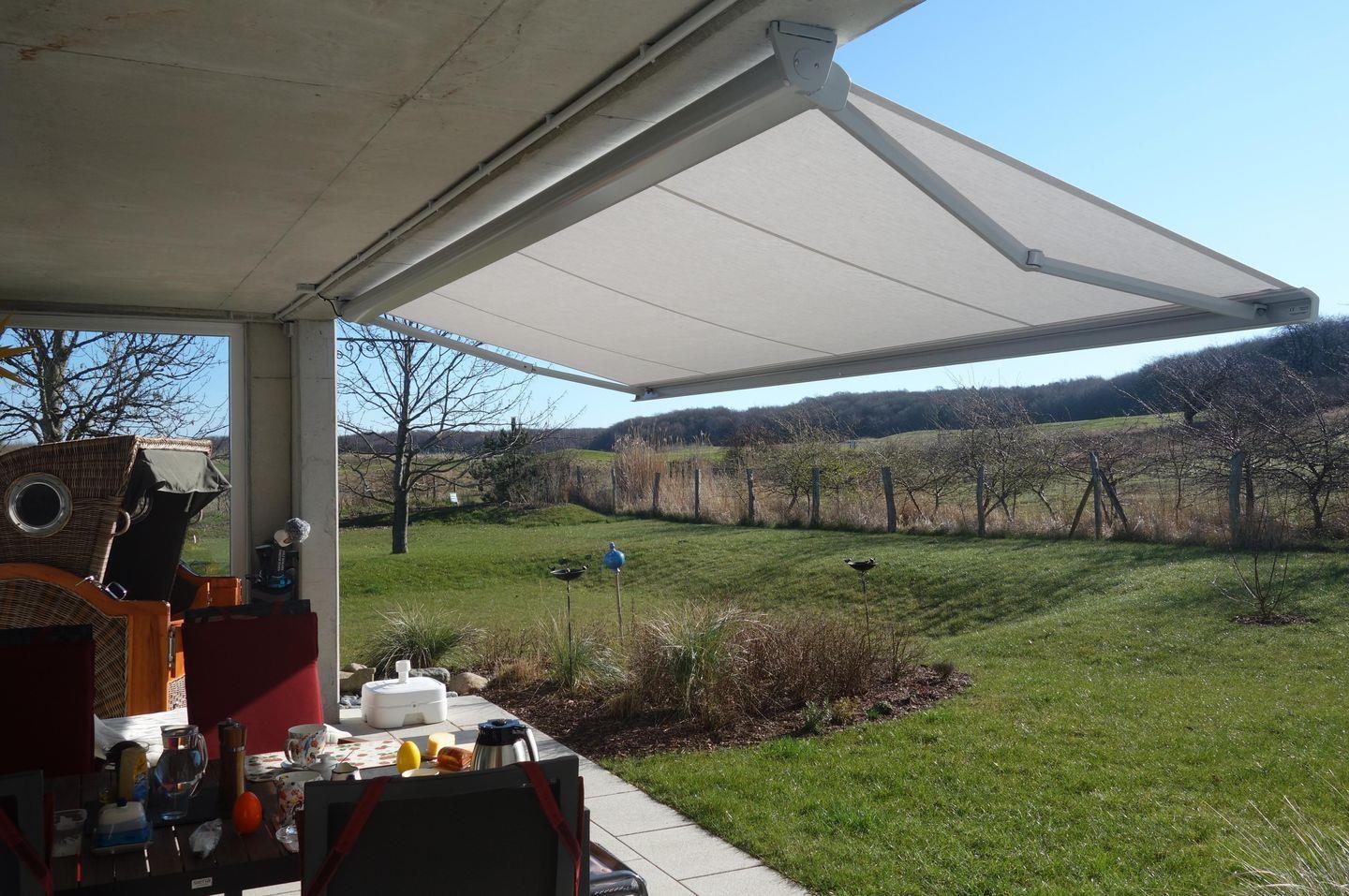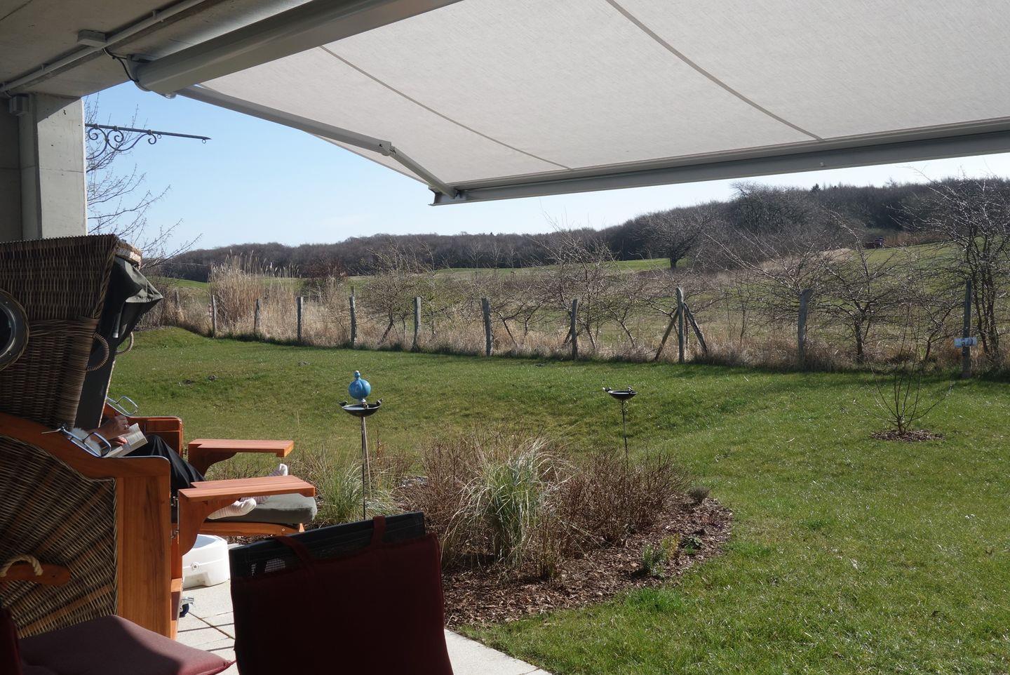 Die sonnige Terrasse mit windgeschütztem Bereich und angrenzendem Garten lädt zum Frühstück im Freien oder abendlichen Glas Wein ein. Genieße die frische Ostseeluft und den Blick auf die Natur – auch mit Hund.