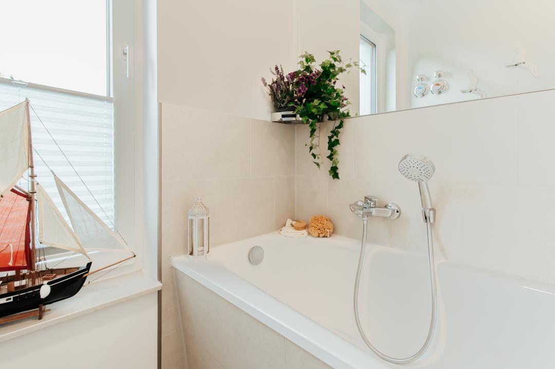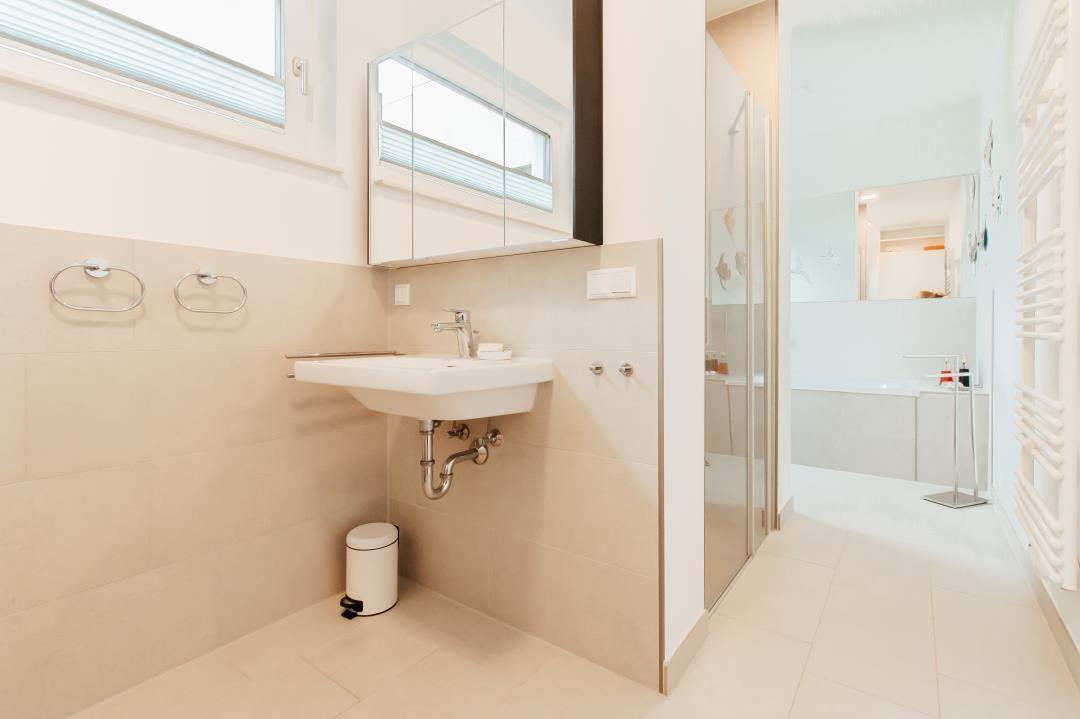 Das Badezimmer bietet dir eine bodengleiche Dusche, eine Badewanne sowie Kosmetikspiegel und Föhn – ideal für dein persönliches Wellnessprogramm nach einem aktiven Tag.