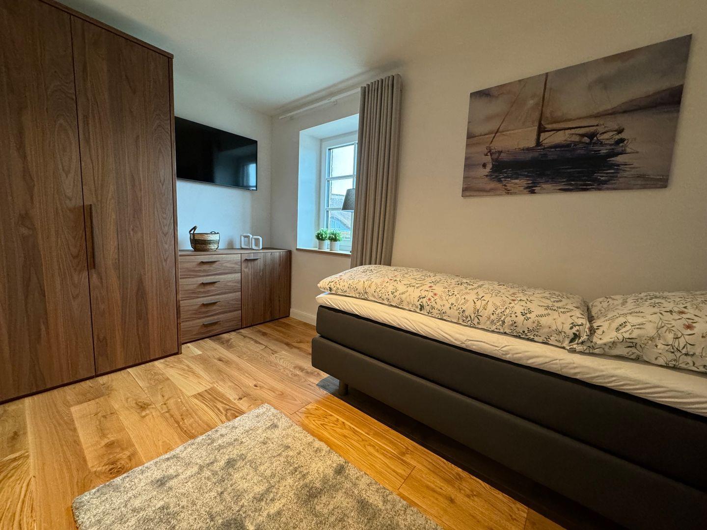 Im Obergeschoss erwarten dich zwei Schlafzimmer mit komfortablen Boxspringbetten, Kleiderschrank, Kommode und Fernseher – mit Blick auf die Ostsee. Das dritte Schlafzimmer im Souterrain verfügt über zwei Einzelbetten – ideal für Kinder, Geschwister oder Freunde.