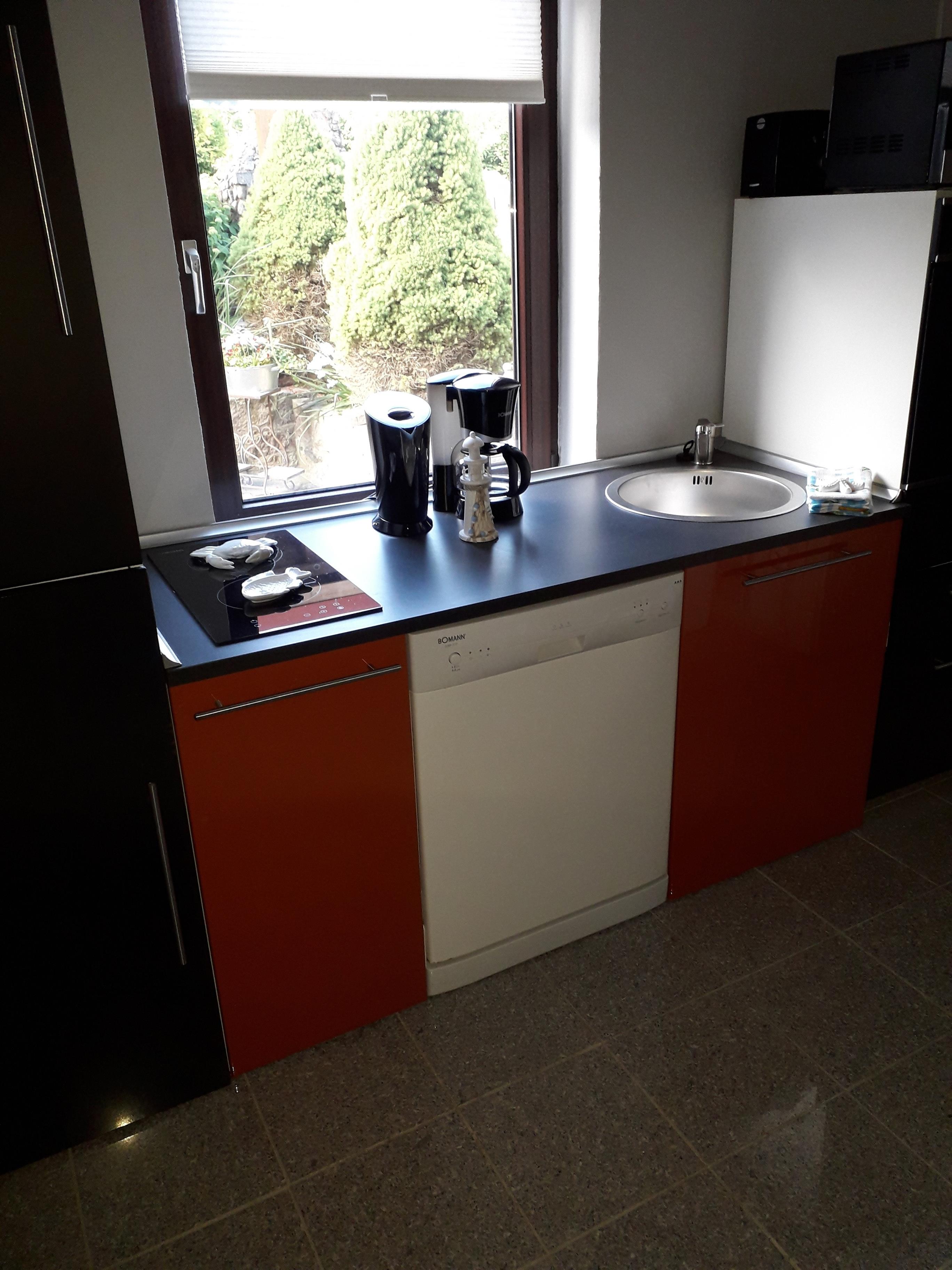 1 kleine Einbauküche komplett eingerichtet mit Spülmaschine, Mikrowelle usw.