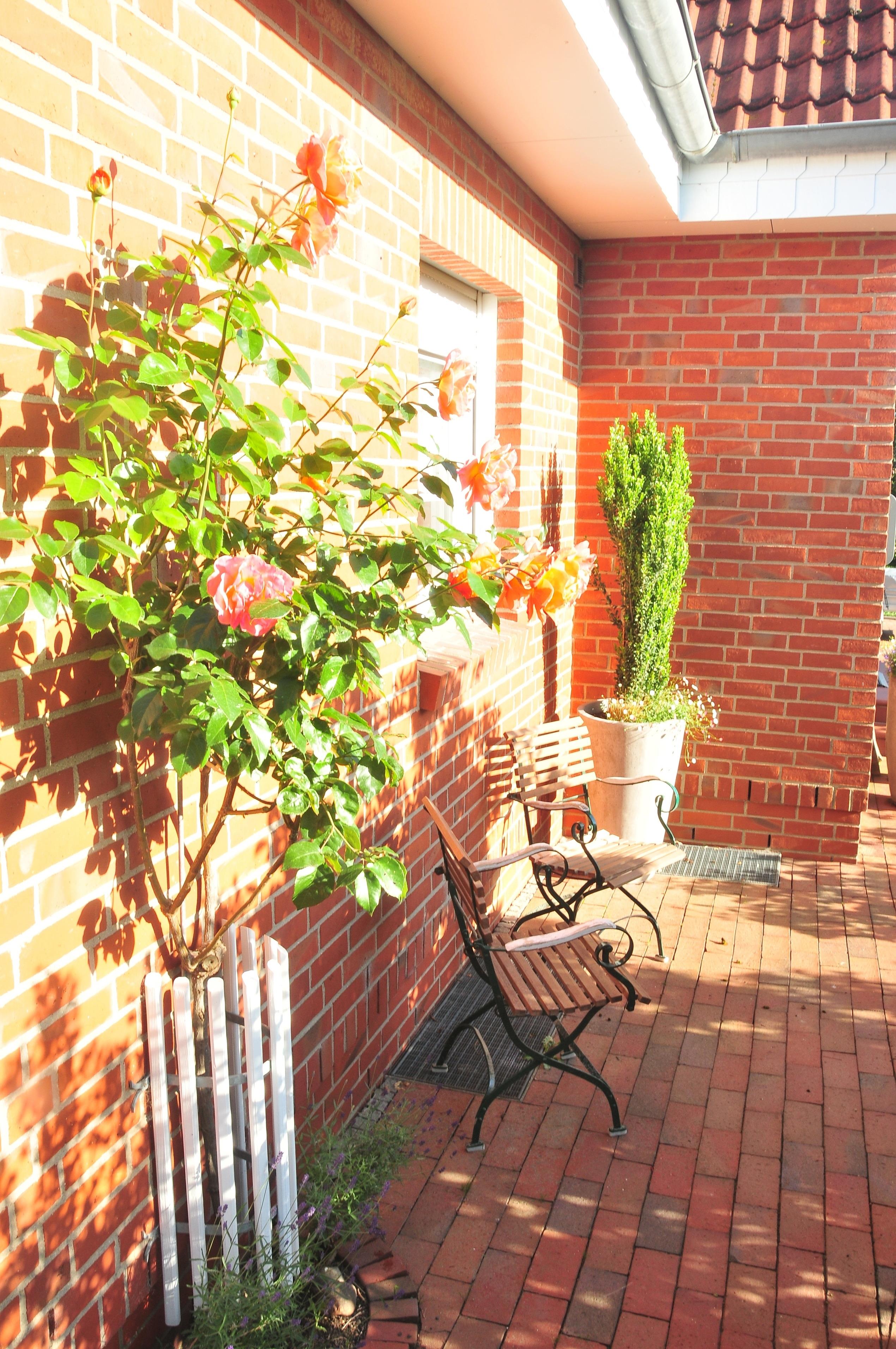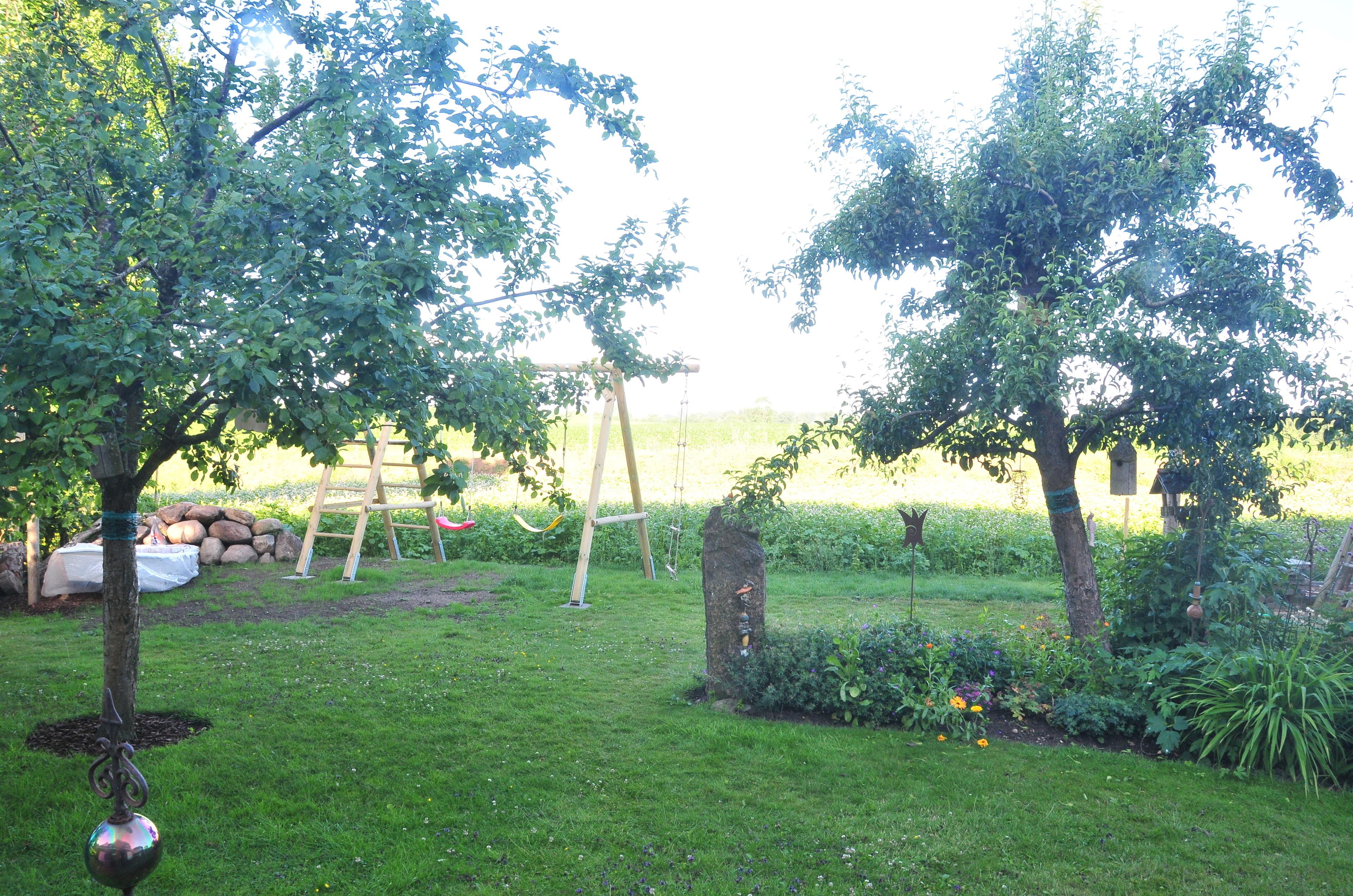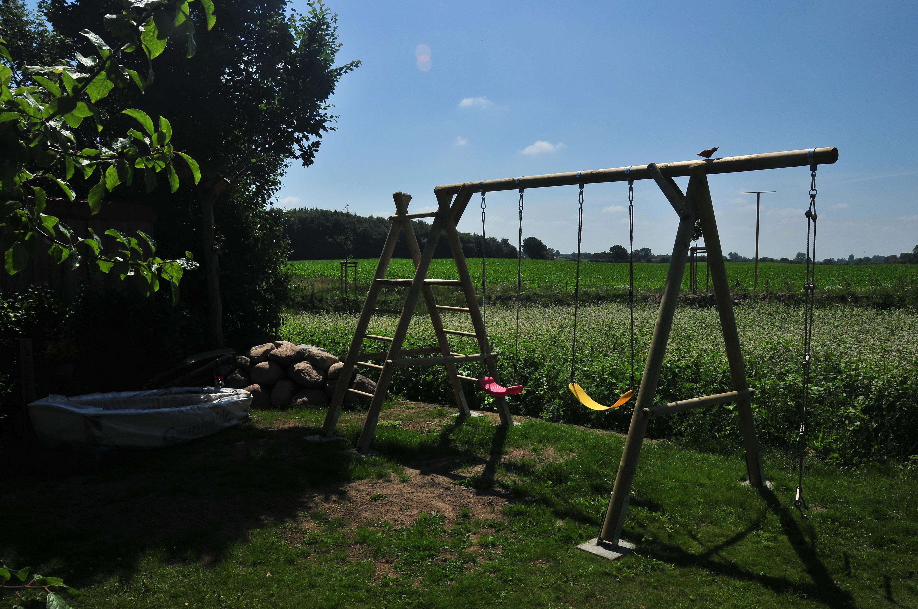 FEWO im Erdgeschoss mit separatem Eingang eines hübschen Wohnhauses (53qm Wohnfl., Terrasse mit Markise und schönem Garten), ruhige Lage zwischen Schlei und Ostsee im Herzen Schwansens, Terrasse mit Markise, Fenster mit Außenrolladen, Parkplätze vor dem Haus, Gartenmöbel, Grill, Kinderschaukel mit Sandkiste und Spielgeräten,