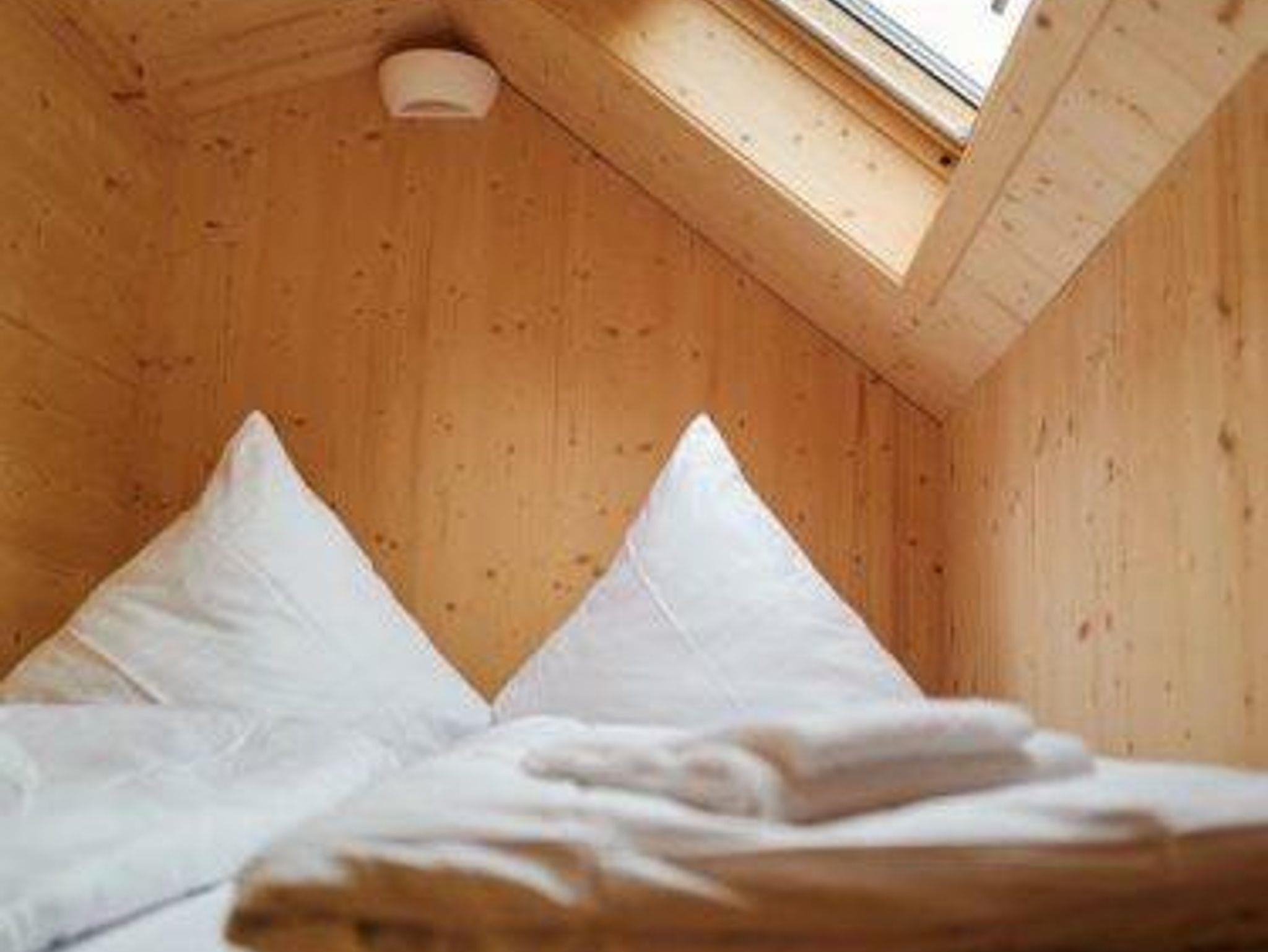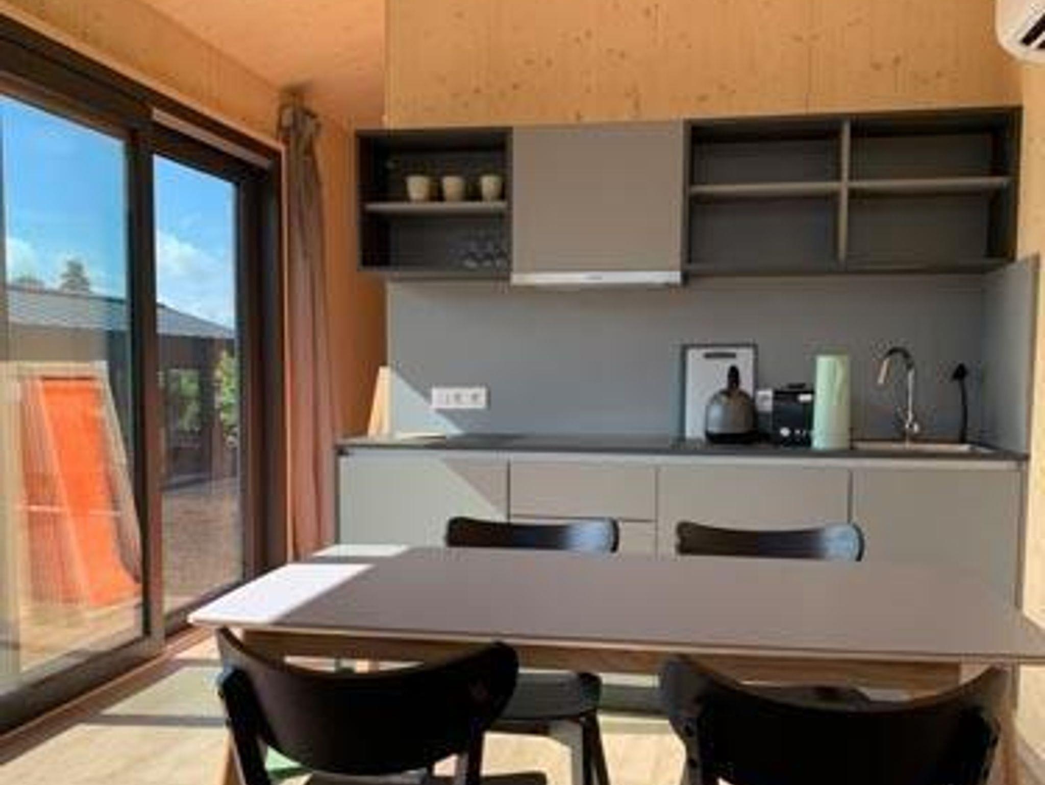 Exclusiv für uns entworfen, bieten unsere Tiny Houses auf fast 35 Quadratmetern Platz für vier Personen in zwei Schlafbereichen. Sie haben ein geräumiges Duschbad und einen Küchenbereich mit Induktionskochfeld und Spülmaschine. Eine große Glasschiebetür öffnet sich zur eigenen Holzterrasse. Im Sommer sorgt die Klimaanlage bei Bedarf sicher für Abkühlung. Und wenn es draußen mal kühler sein sollte, dann lässt sich prima auf der gemütlichen Bank vor dem Panoramafenster lümmeln, gewärmt von den Infrarot-Heizpaneelen unter der Decke.