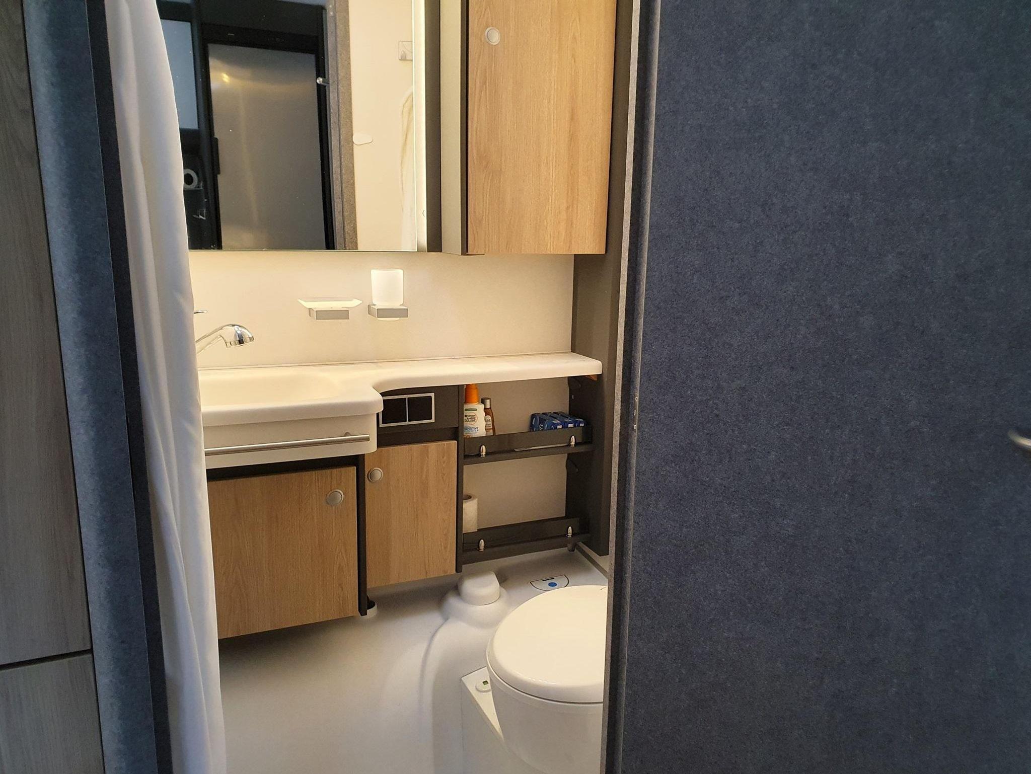 • Cassettentoilette, Waschbecken und Not-Dusche