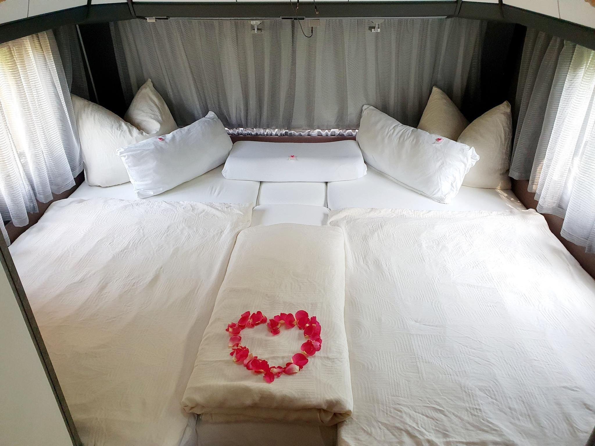 • Einzelbetten mit 7-Zonen-Matratzen aus klimaregulierendem Material auf ergonomischen Holzlattenrosten (umbaubar zu großer Liegefläche)