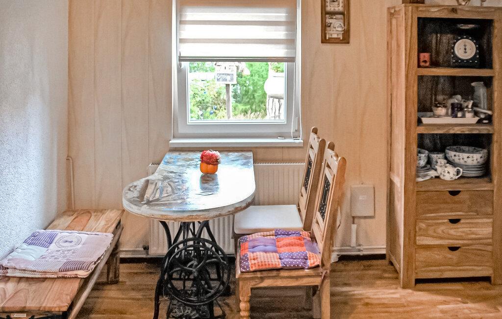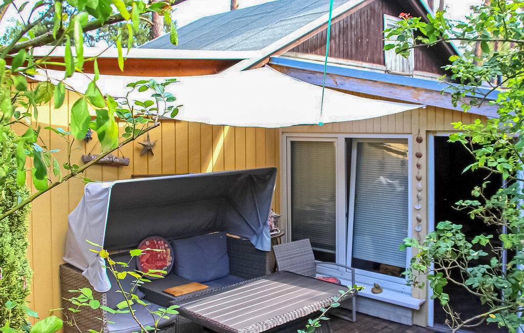 Det moderniserte feriehuset ligger på en 500 m² stor, separat fritidstomt i et skogsområde, kun ca. 80 m fra strandpromenaden. Det er utstyrt med stue (polstret sittegruppe, TV, radio), soverom (3 polstrede solsenger), åpen spisestue med vedovn, kjøkkenkrok (elektrisk komfyr, kjøleskap og mikrobølgeovn), dusj/WC, sentralvarme. Det er en terrasse med sittegruppe, grill, sykkeloppbevaring og parkeringsplass på eiendommen. Totalprisen inkluderer sluttrengjøring, sengetøy, vann- og energiforbruk, men du må ta med egne håndklær. Betales på stedet: Turistskatt. To hunder opp til en maksimal høyde på 40 cm er tillatt på denne eiendommen.