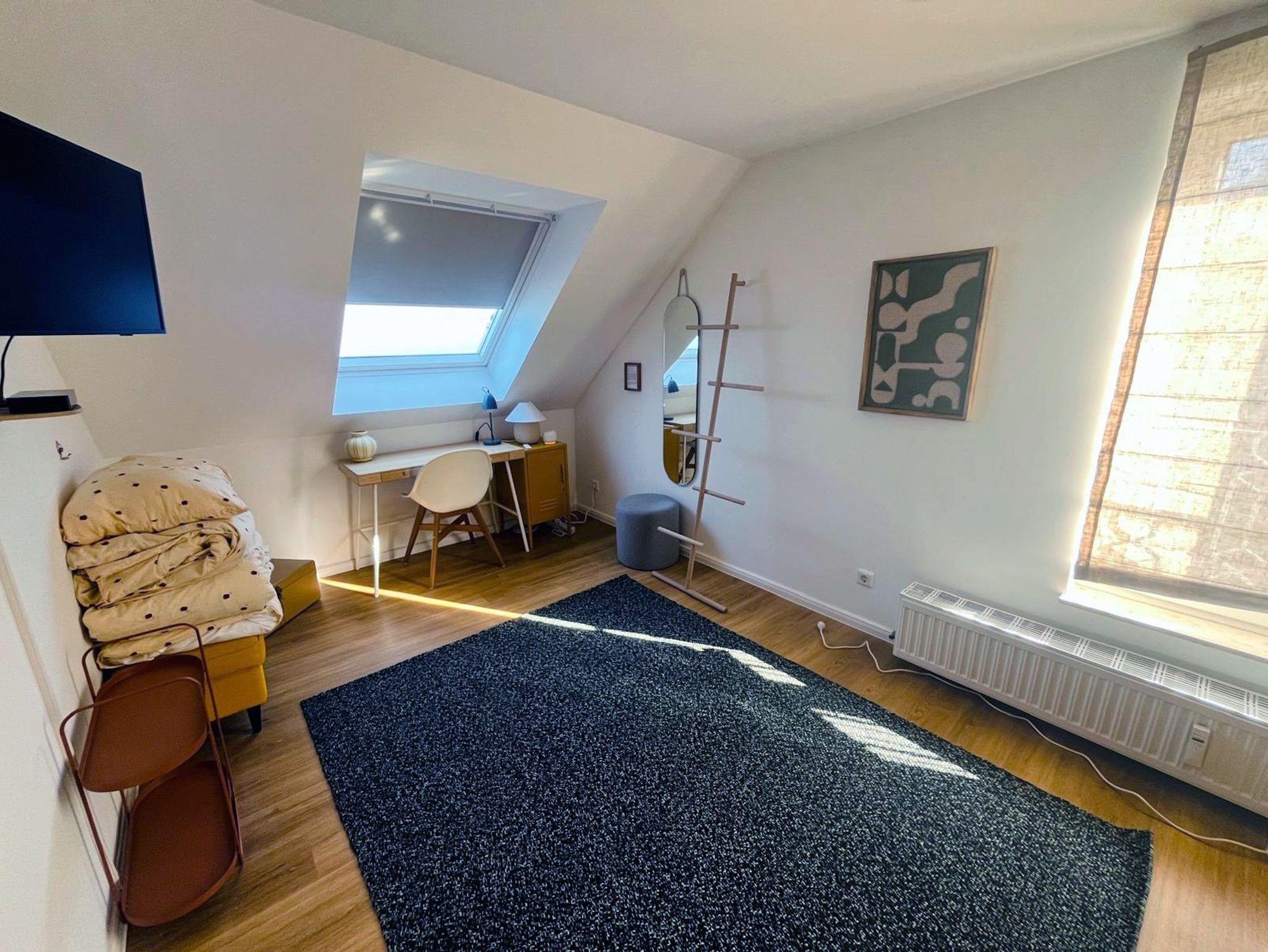 Offene Galerie vom Wohnraum über eine Treppe ins Dachgeschoss (leichte Dachschrägen) mit kleiner Sitzgruppe
