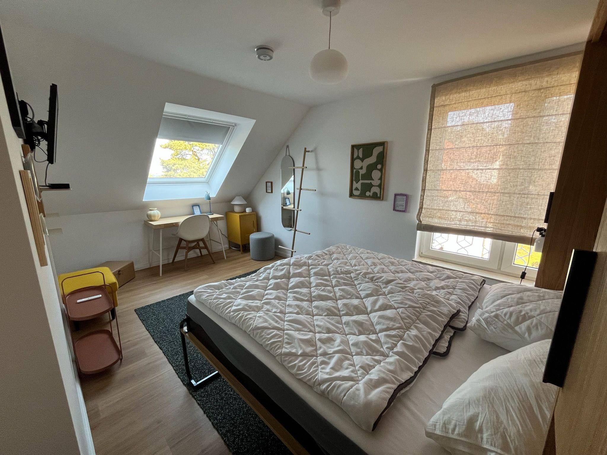 Die im zweiten Obergeschoss an der Nord- und Ostseite des Hauses gelegene, durch große Glasfenster freie Blicke auf das Meer bietende, ca. 70 qm große Wohnung Nr. 20 verfügt über Bad/WC mit Wanne, zwei Schlafzimmer, offene Galerie sowie einen geräumigen Wohnraum mit Sitzgruppe, Essplatz für bis zu 4 Personen und einer Küchenzeile (Herd mit Ceranfeld, Backofen, Kühlschrank, Kaffeemaschine, Wasserkocher, Toaster). Der große Wohnraum hat Zugang zur nördlich gelegenen Terrasse und ist oftmals Schauplatz schöner Sonnenuntergänge.