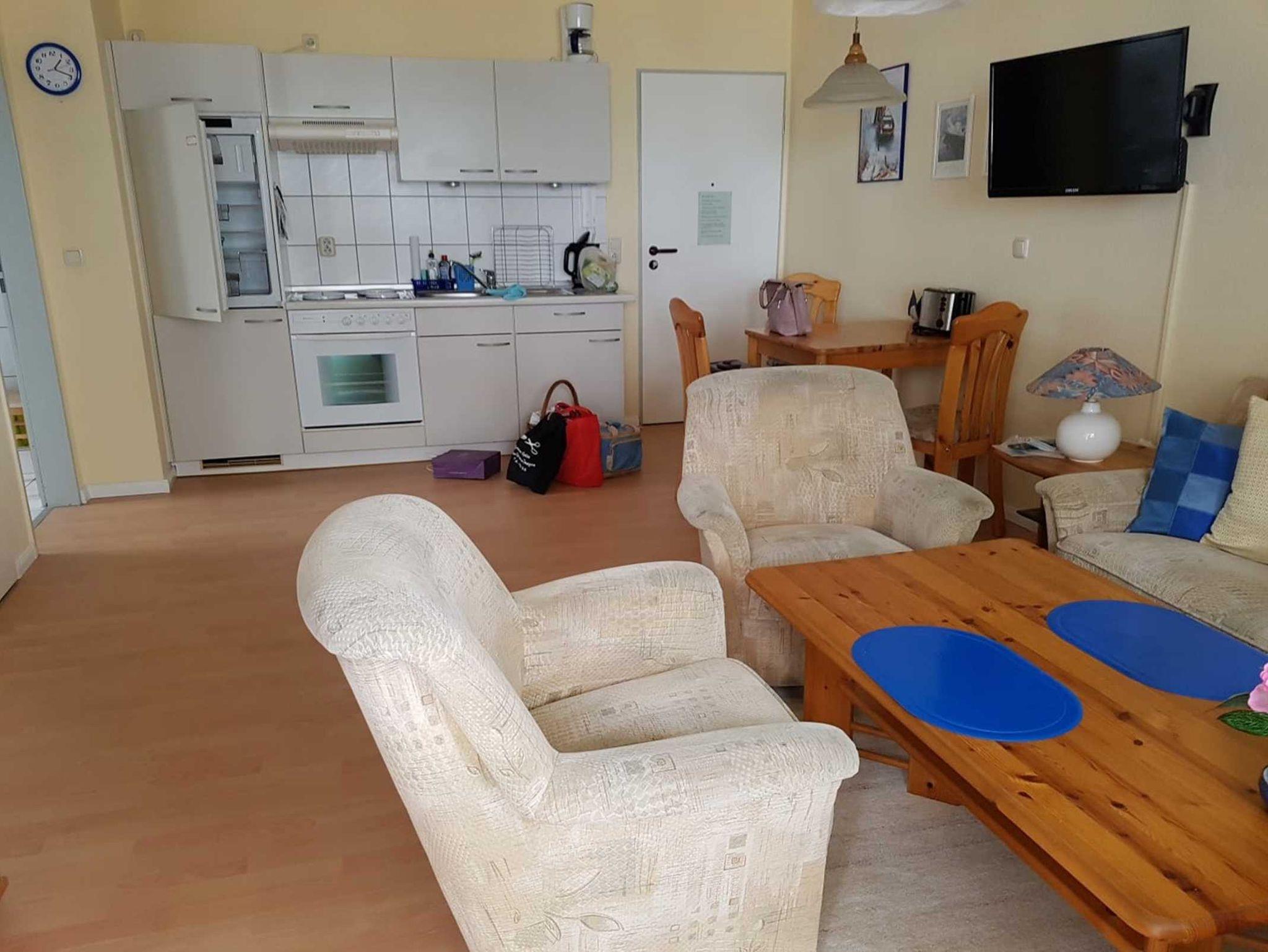 Couch ausklappbar (Bett für die 3. Person), Couchtisch, Flachbild- TV, Schrank, Eßbereich mit 3 Stühlen