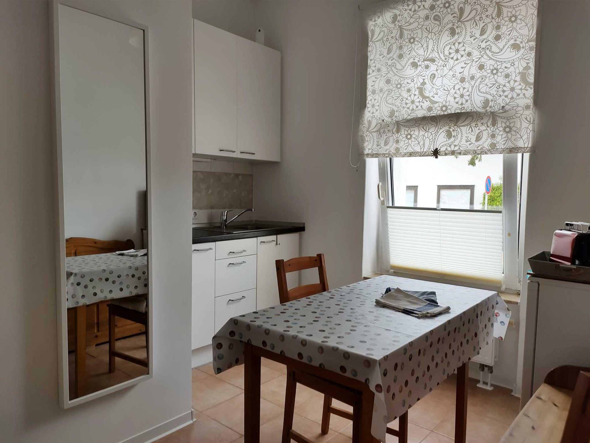 Das Appartement ist modern eingerichtet. Es gibt einen Wohn- Küchenbereich mit Sitzecke für 3 Personen. Angrenzend an den Wohnraum befindet sich der Schlafraum mit Doppelbett (Breite 1,40 m und Länge 2,0 m) Zusätzlich gibt es noch ein kleines Bad mit Dusche und WC. Ein zugehöriger kostenloser PKW- Stellplatz befindet sich direkt neben dem Mehrfamilienhaus.