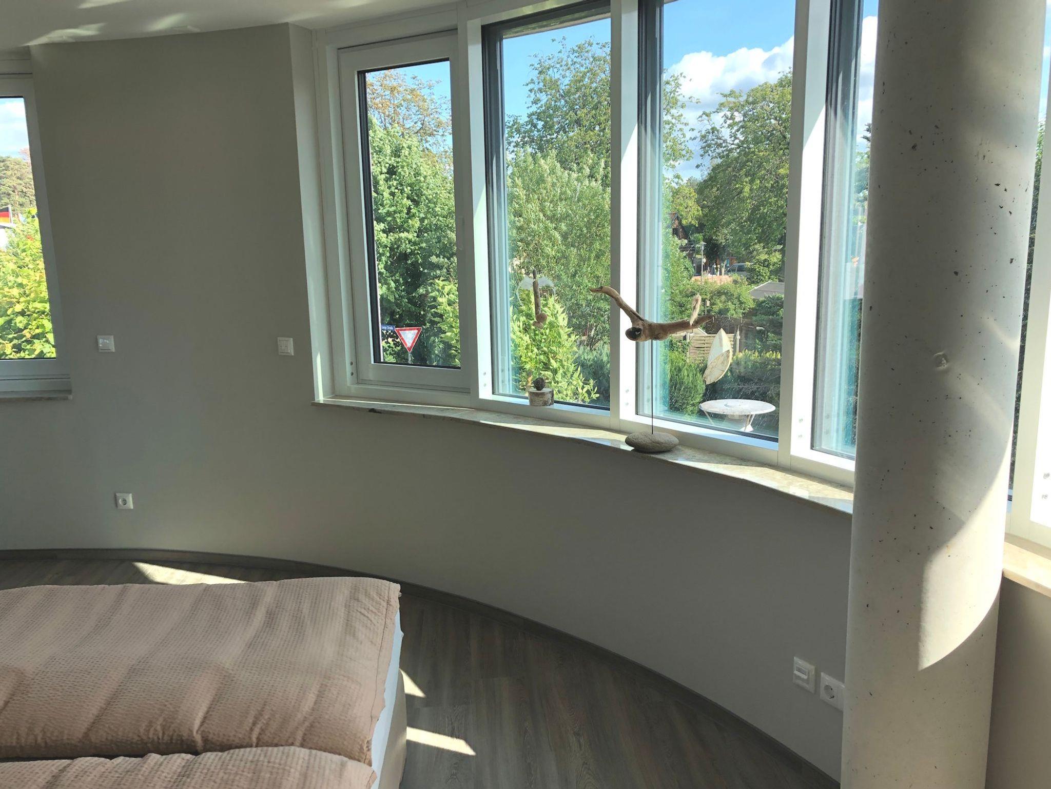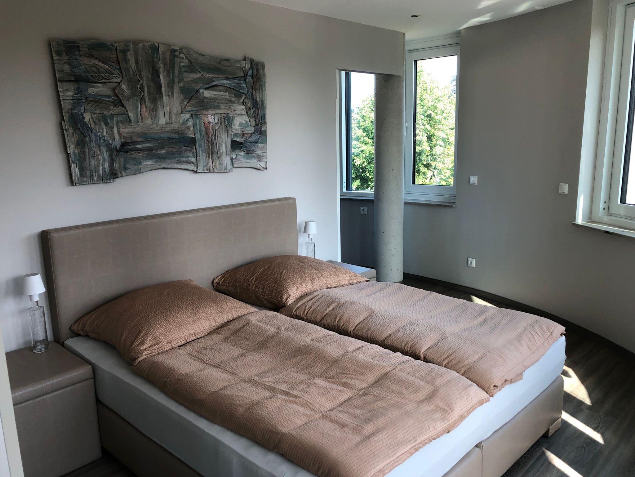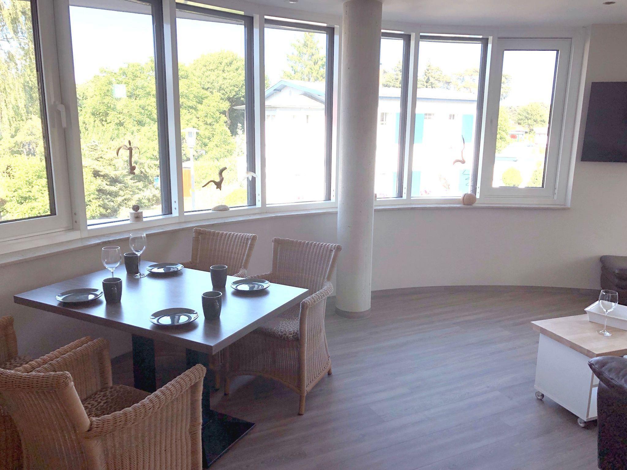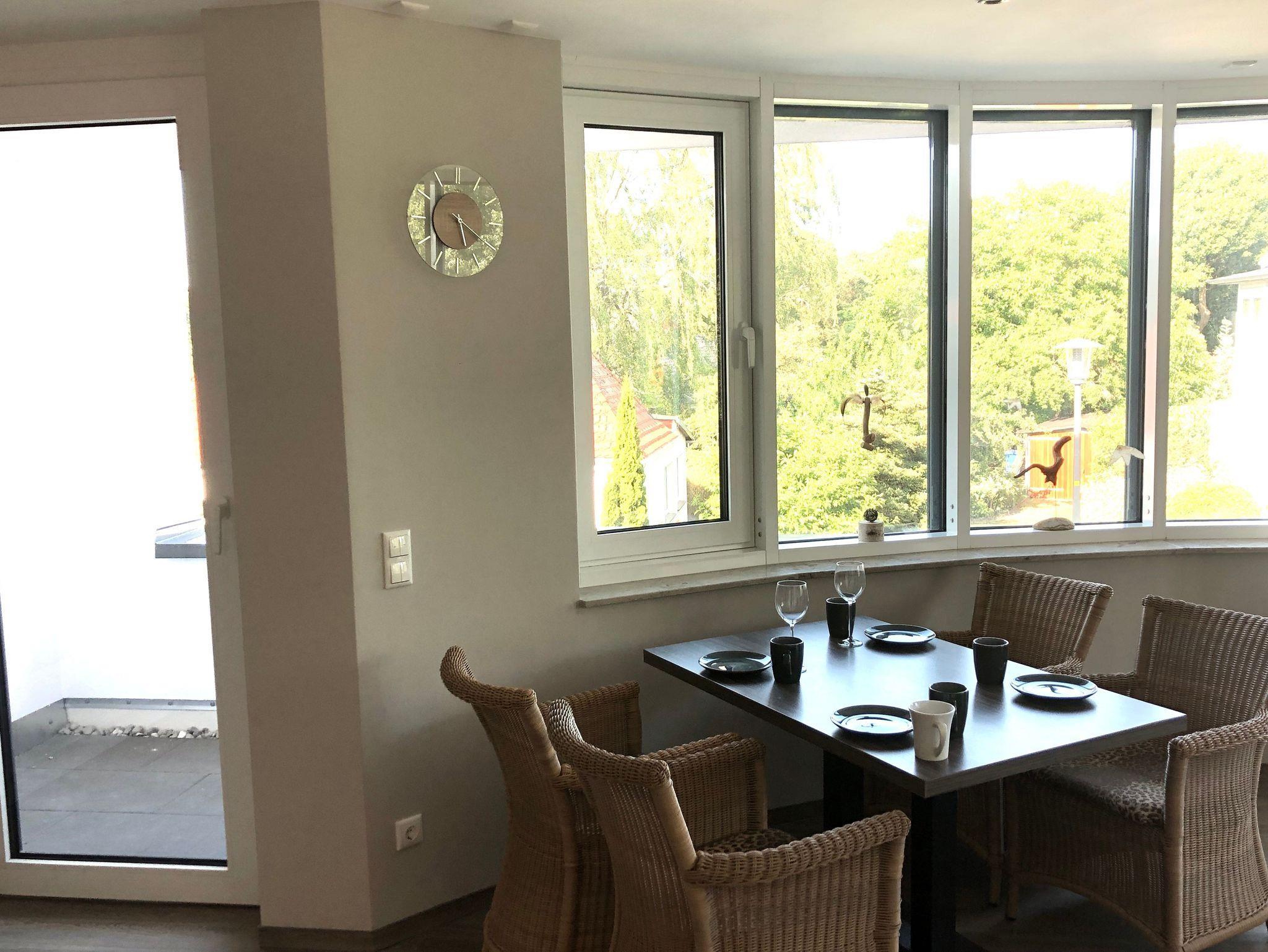 Die Ferienwohnung ist komfortabel und modern eingerichtet. Durch die 3 Seiten- Ausrichtung mit Panoramafront ist die Wohnung sehr hell, wirkt einladend und freundlich. Es gibt einen Balkon zur Ostseite, wo man wunderbar sein Frühstück genießen kann und einen 2. etwas größeren Balkon zur Westseite. Dort kann man von früh bis spät die Sonne genießen. Ein zugehöriger kostenloser PKW- Stellplatz befindet sich direkt neben dem Gebäude.