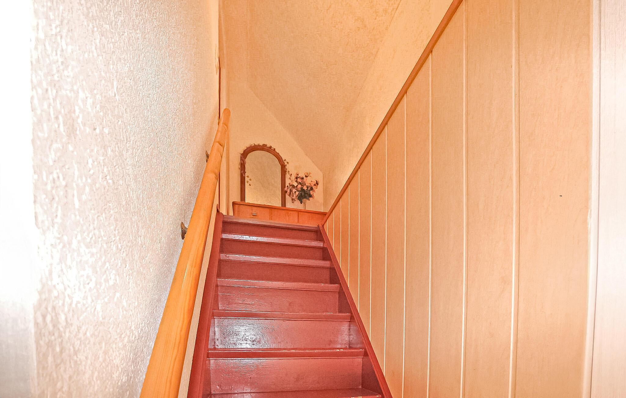 Det ca. 70 kvadratmeter store, familievennlige, røykfrie feriehuset er fordelt over to etasjer. I første etasje er det et stort kjøkken (spiseplass, elektrisk komfyr, kjøleskap med fryser, mikrobølgeovn, diverse små kjøkkenapparater) og badet (dusj, toalett, hårføner), begge med utgang til terrassen. I øverste etasje (relativt bratt trapp!) ligger den store stuen (sovesofa - ekstra seng for to personer, spisebord, flatskjerm-TV, sammenleggbar seng - ekstra seng for et barn) og soverommet (dobbeltseng, en enkeltseng). I tillegg er det en stor terrasse, en sittegruppe i tre rett foran huset, en annen sittegruppe med lekeapparater i hagen, grill og bålpanne, parkeringsplass, sykkeloppbevaring, barneseng og barnestol samt elektriske radiatorer.