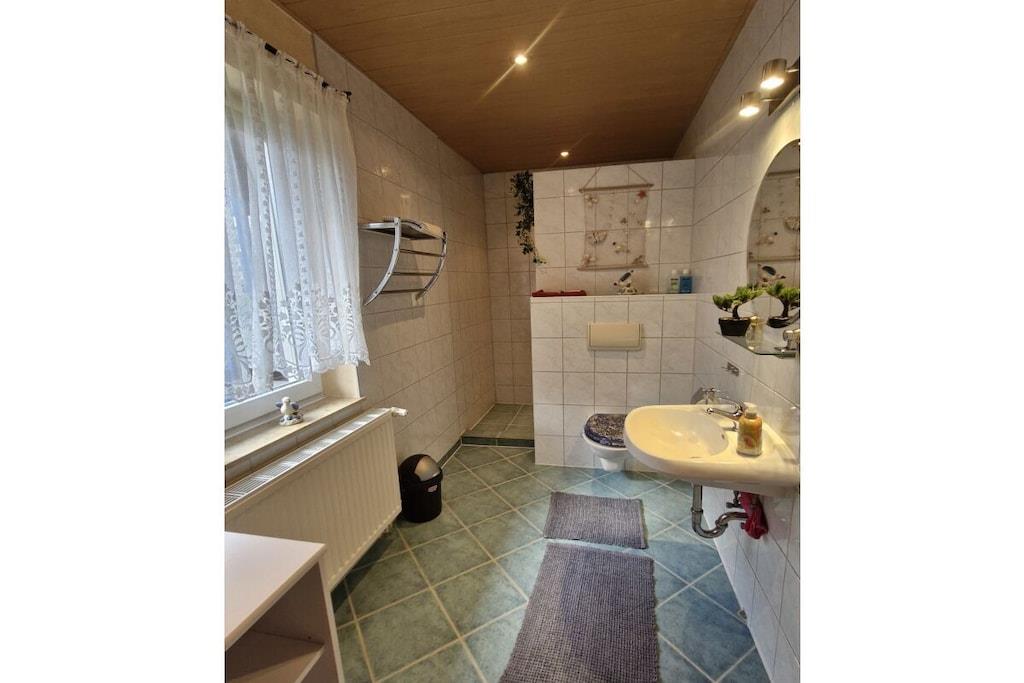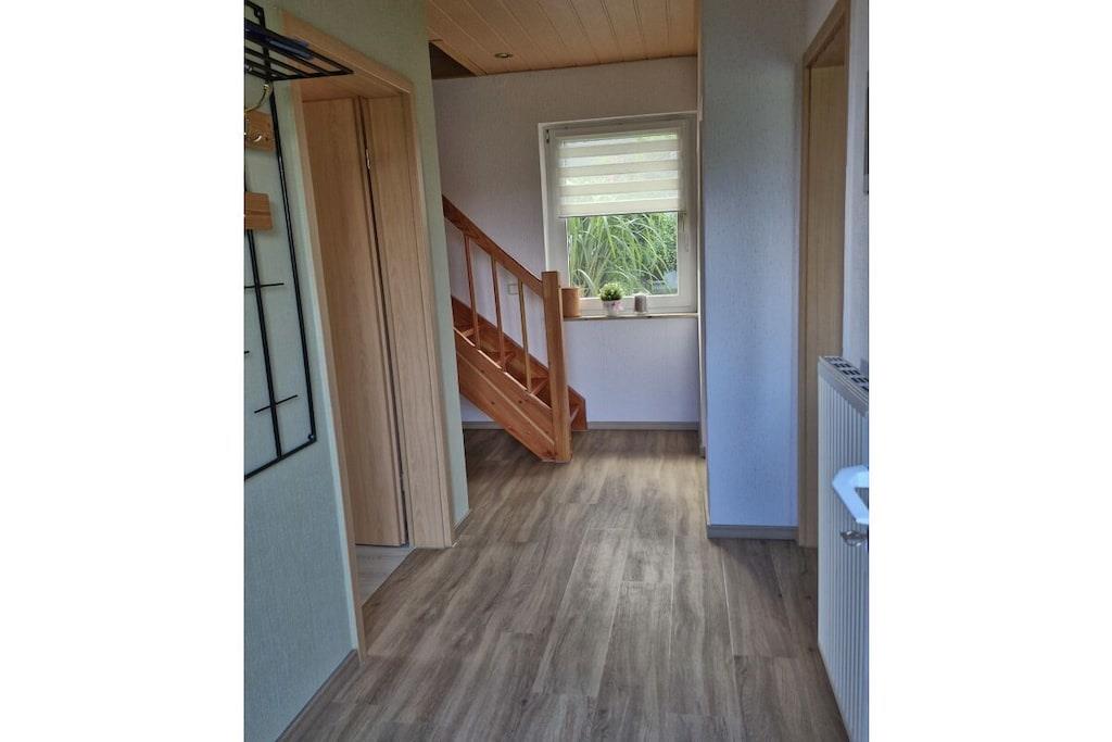 Vårt innbydende og romslige feriehus ligger i fredelige, landlige omgivelser. Stuen, et koselig og funksjonelt kjøkken utstyrt med keramisk koketopp, stekeovn, brødrister og kjøleskap, samt badet med dusj og toalett, ligger i første etasje. De to separate soverommene ligger i øverste etasje, sammen med en stue med en liten sittegruppe. Derfra kan du nyte en fantastisk, vidstrakt utsikt over det omkringliggende landskapet. Terrassen foran huset er møblert med hagemøbler, solsenger og grill. Du kan parkere bilen din i en carport på eiendommen vår. Det er også et sykkeloppbevaringsrom.