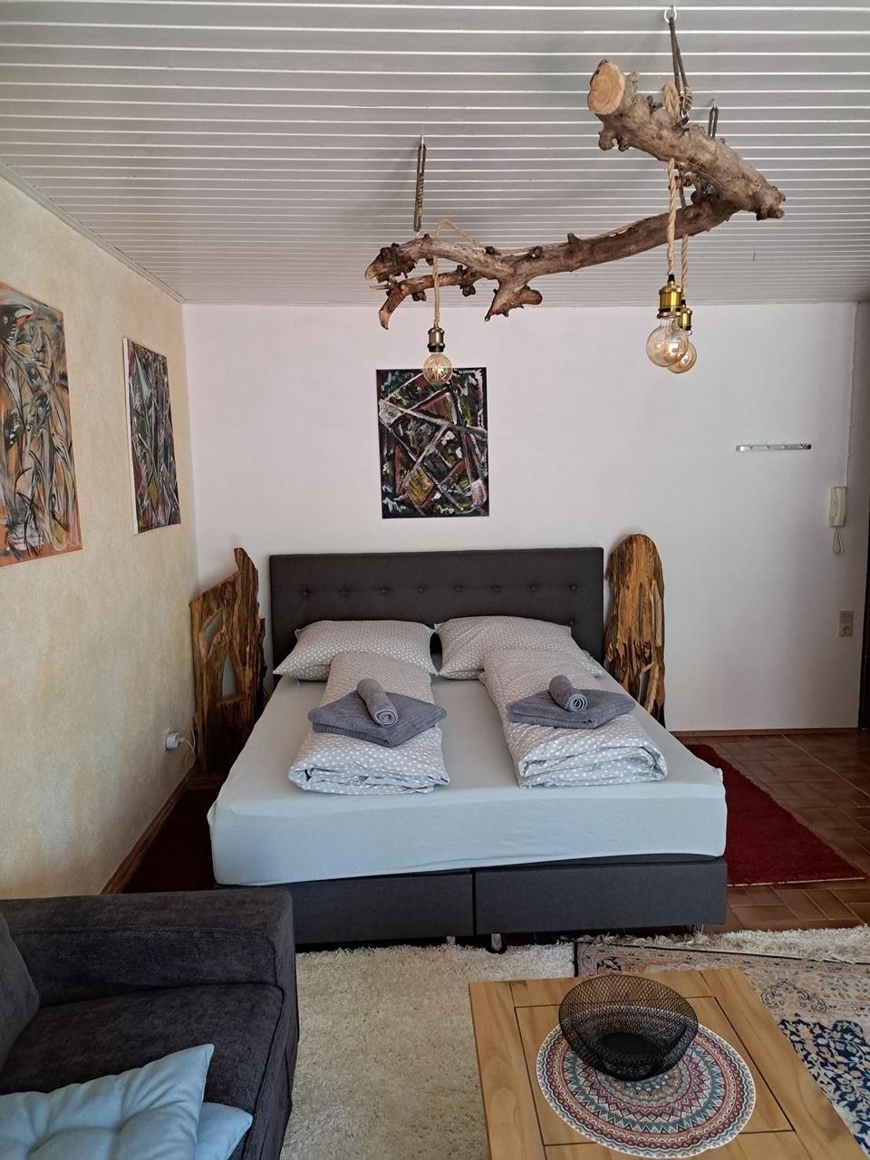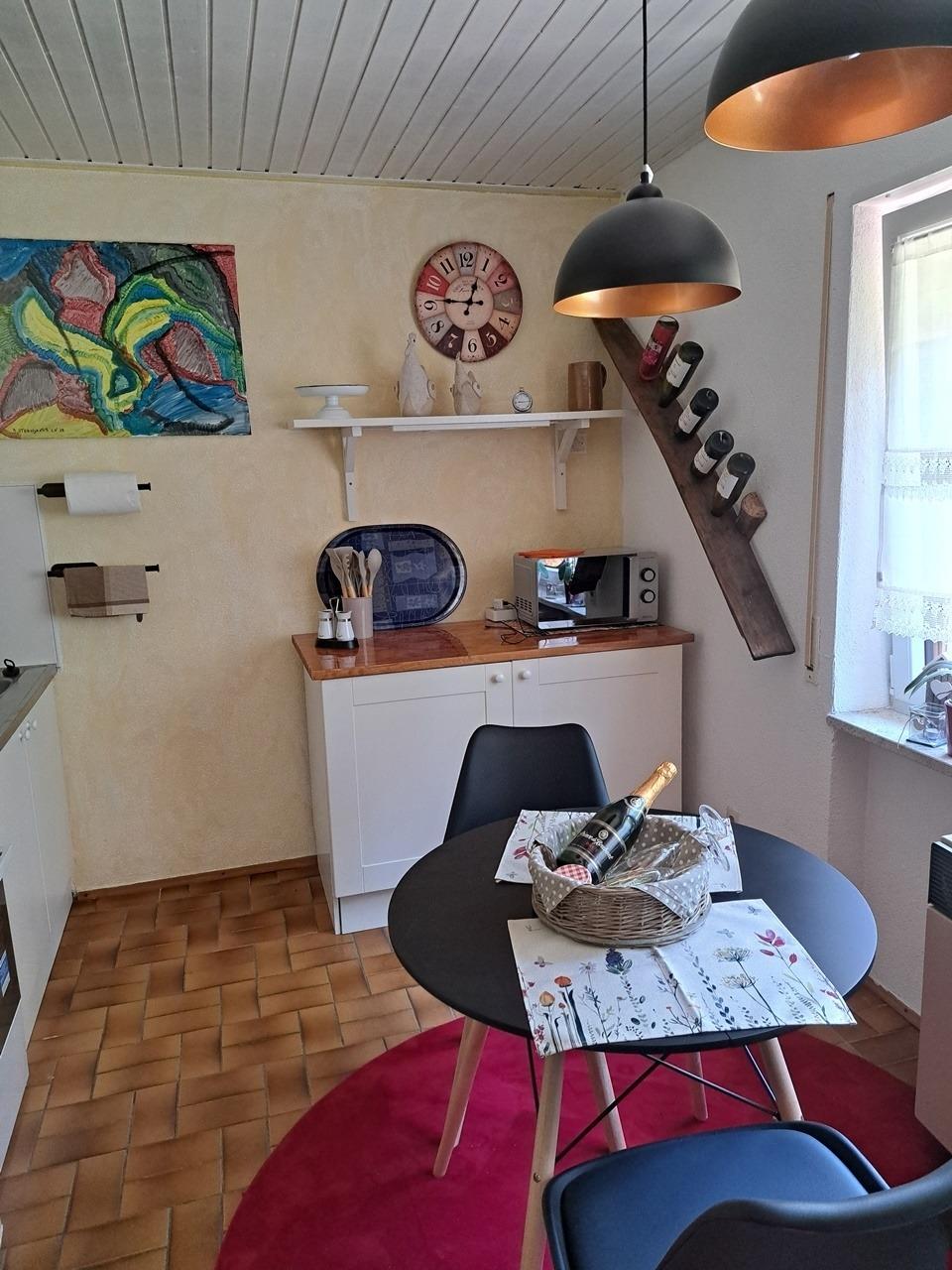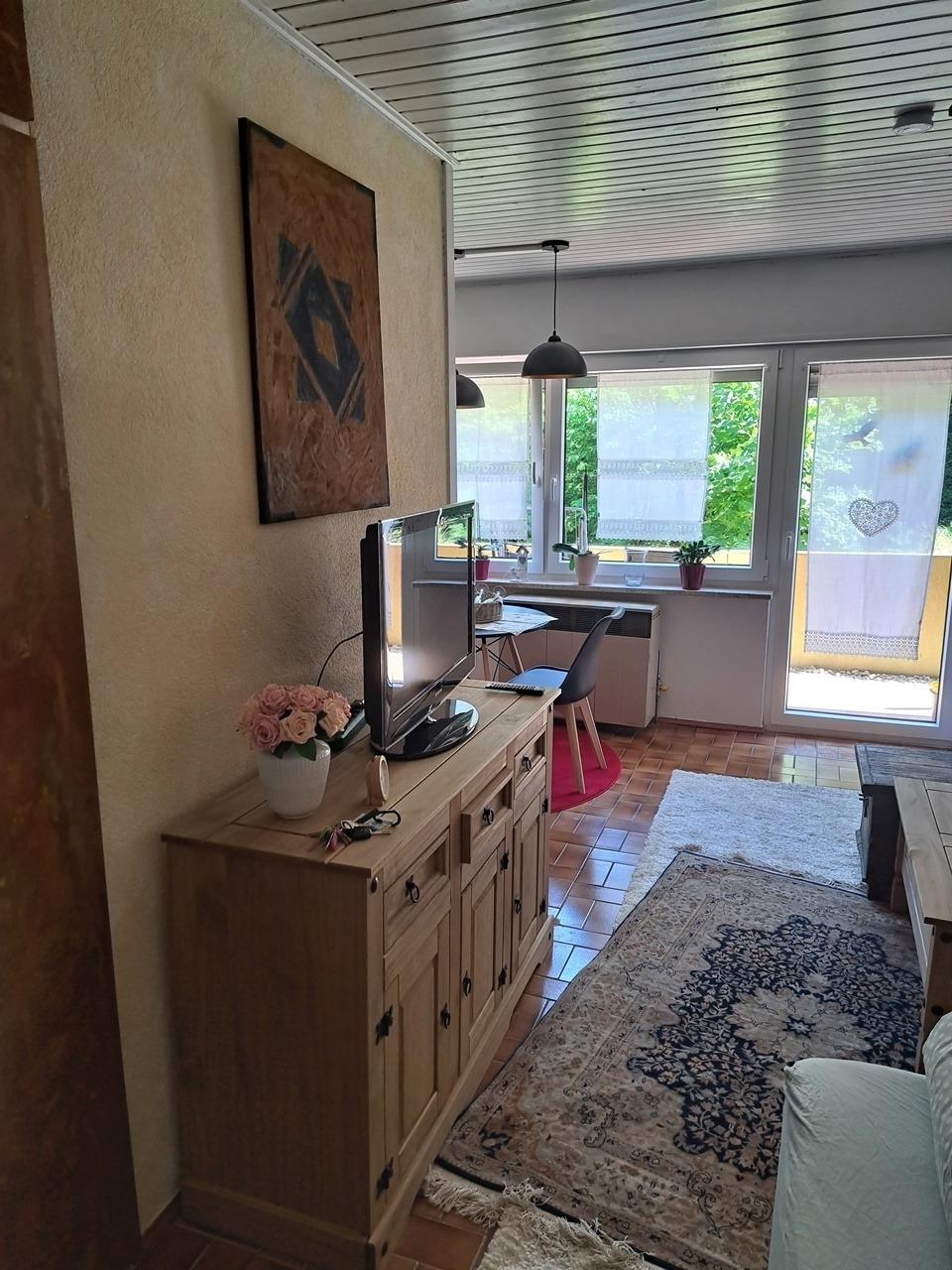 Neu renovierte und geschmackvoll zum Wohlfühlen eingerichtete Ein-Zimmer-Ferienwohnung mit Küchenzeile, Essbereich im Erdgeschoß, vom Garten umrahmt, mit zusätzlichem Zugang auf die Terasse ( abschließbar )