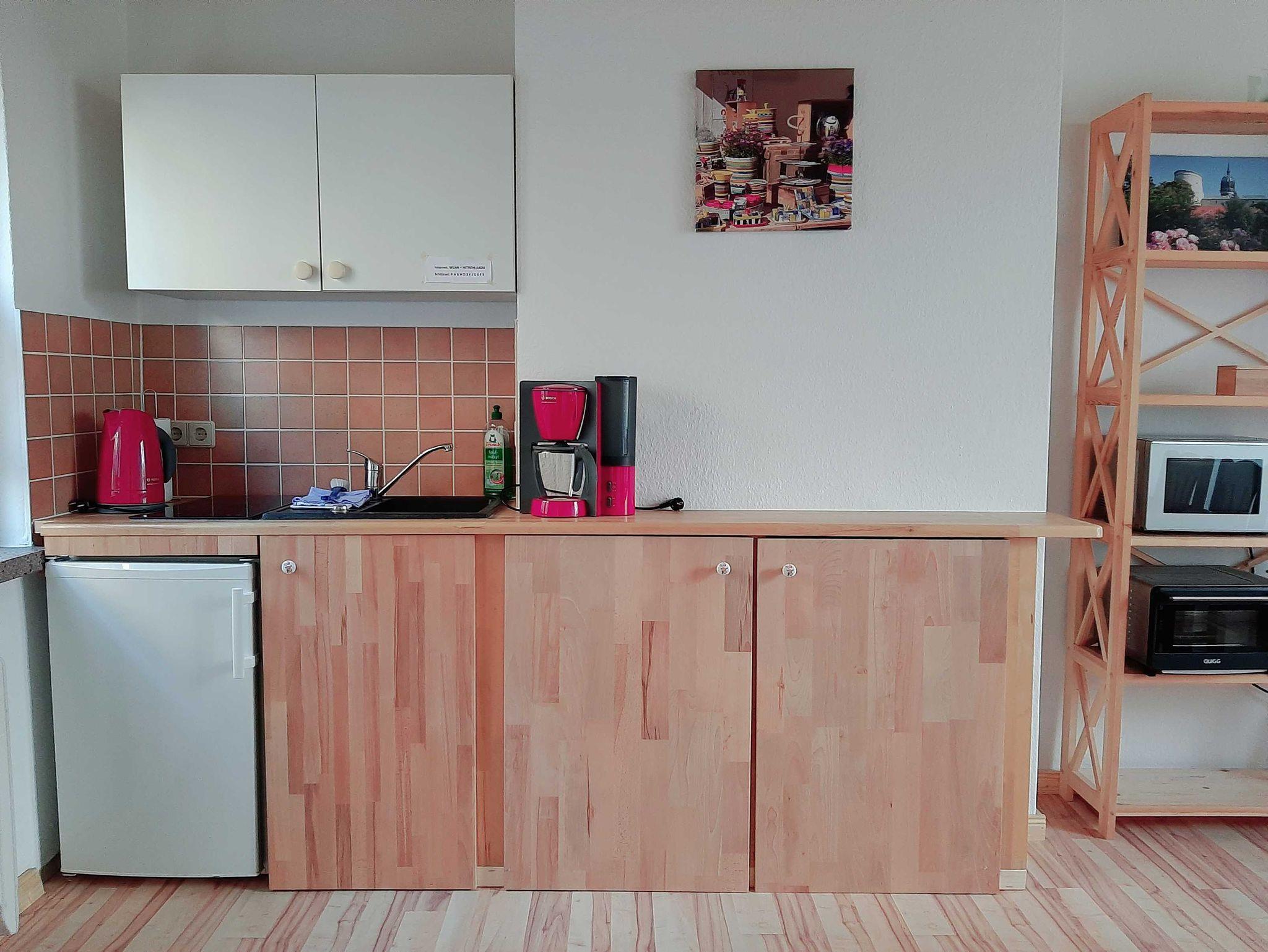 • Küche mit Kochplatten, Mikrowelle und Sitzecke