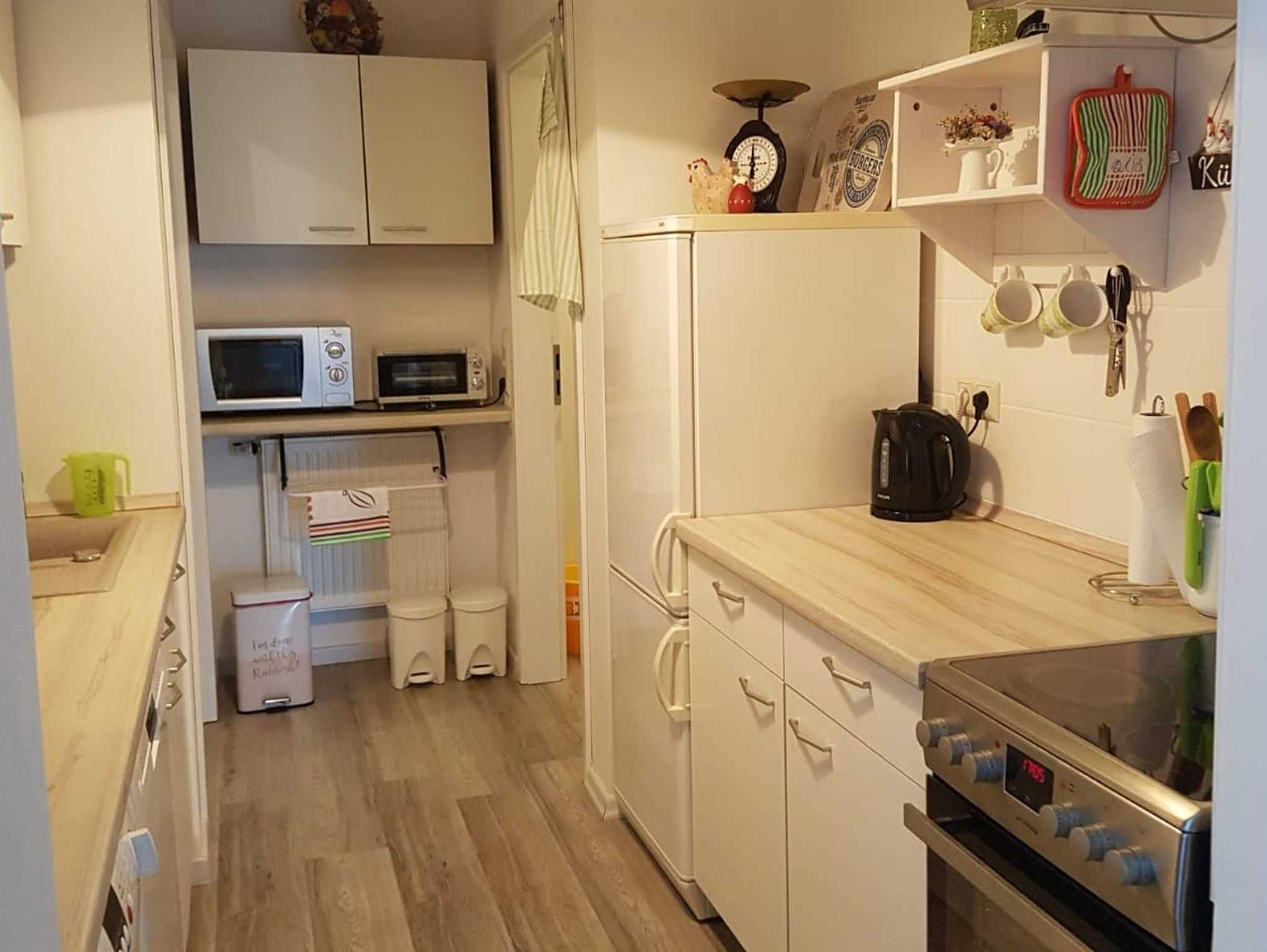 • komplett ausgestattete Küche mit Waschmaschine, Geschirrspüler, Herd, Mikrowelle, Kaffeemaschine, Wasserkocher und Brötchenaufbackofen
