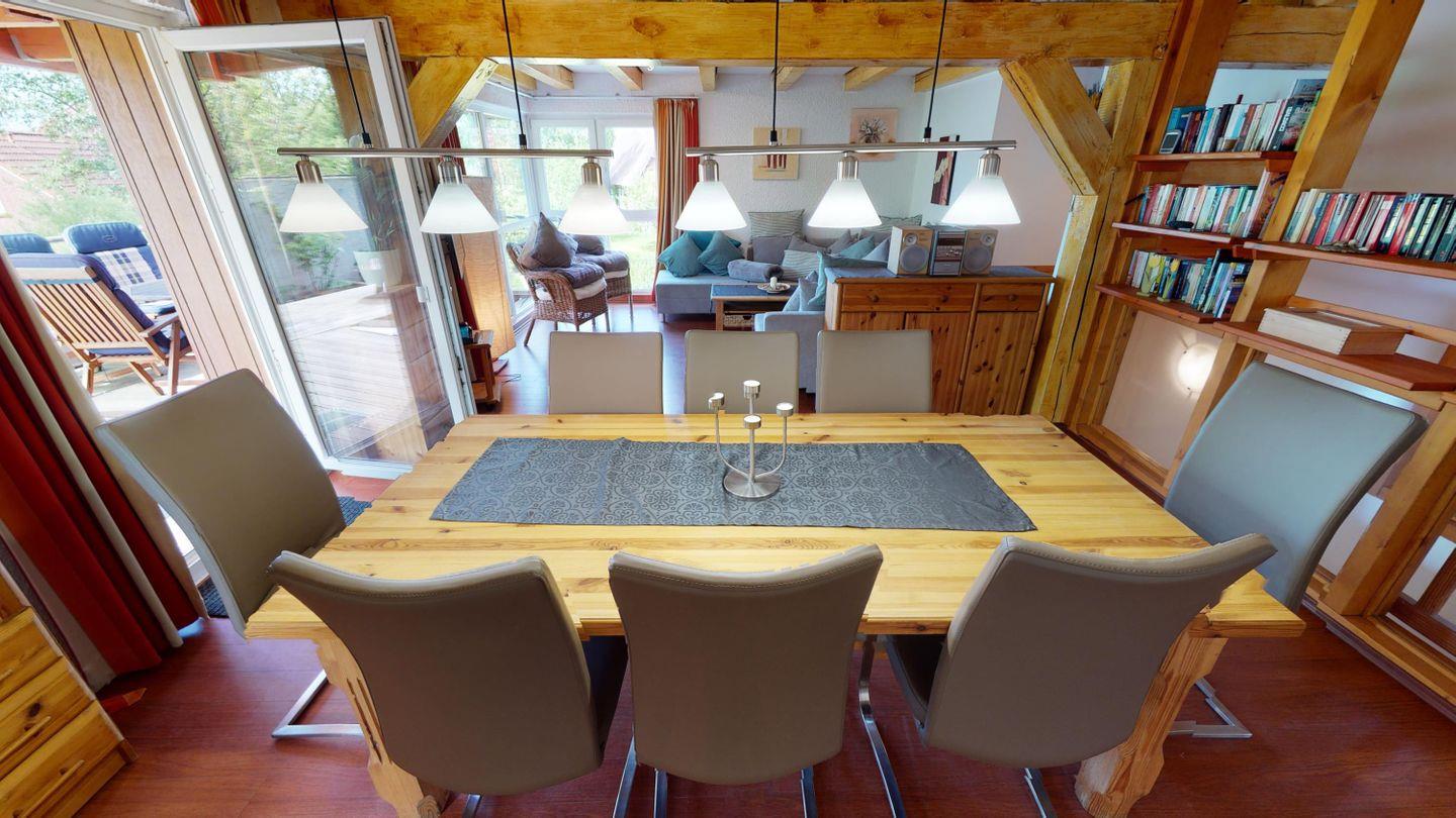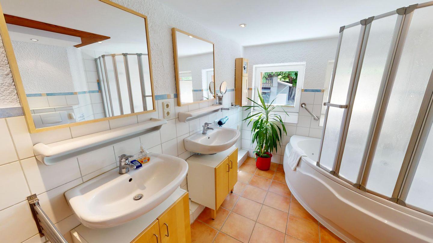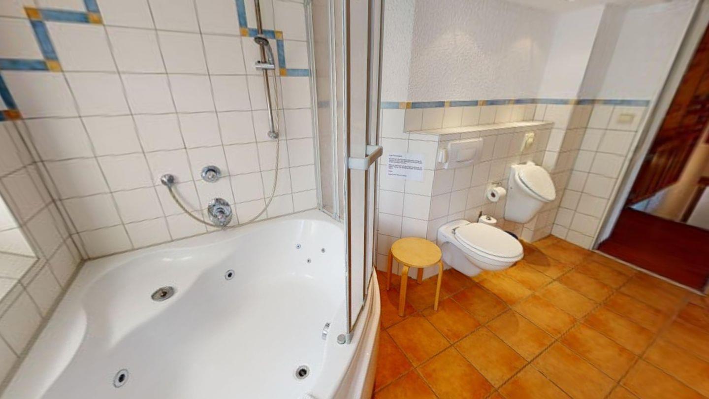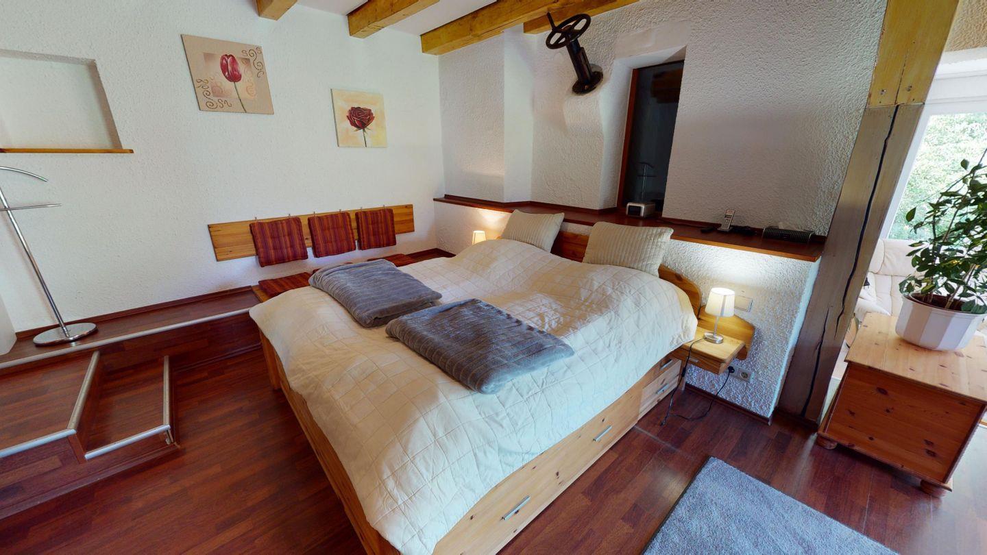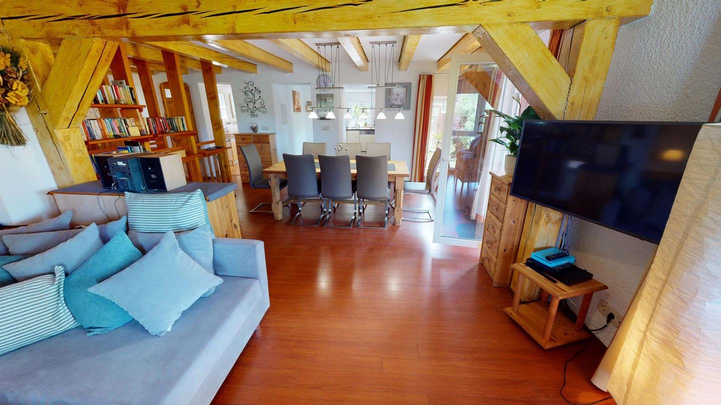 Oben, im Obergeschoss, öffnet sich ein großzügiger Wohnbereich mit viel Licht, einer großen Couchecke und einem langen Esstisch für gemeinsame Mahlzeiten. Die angeschlossene Küche ist voll ausgestattet und lädt zum Kochen und Genießen ein. Von hier aus gelangst du auch auf die überdachte Terrasse – mit direktem Blick auf den Bachlauf und Platz für lange Abende im Freien, bei jedem Wetter. Das Badezimmer auf dieser Ebene ist besonders komfortabel: mit Whirlpoolwanne, Doppelwaschbecken, WC und Urinal. Wenn zwischendurch mal etwas gewaschen werden muss: Im Haus steht ein separater Raum mit Waschmaschine und Trockner zur Verfügung, den sich beide Wohnungen teilen. Ganz praktisch, gerade bei längeren Aufenthalten oder mit Kindern.
