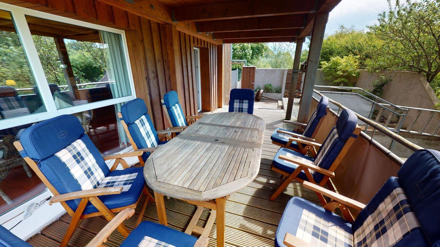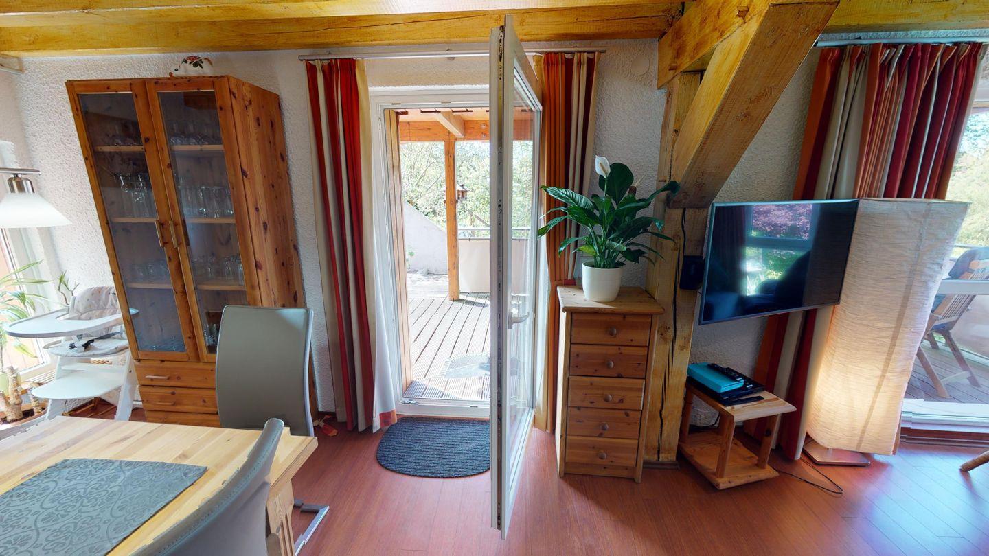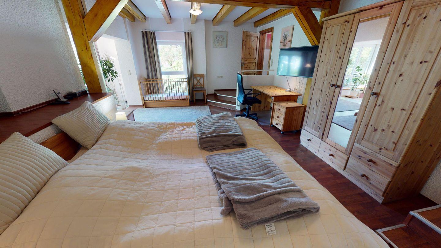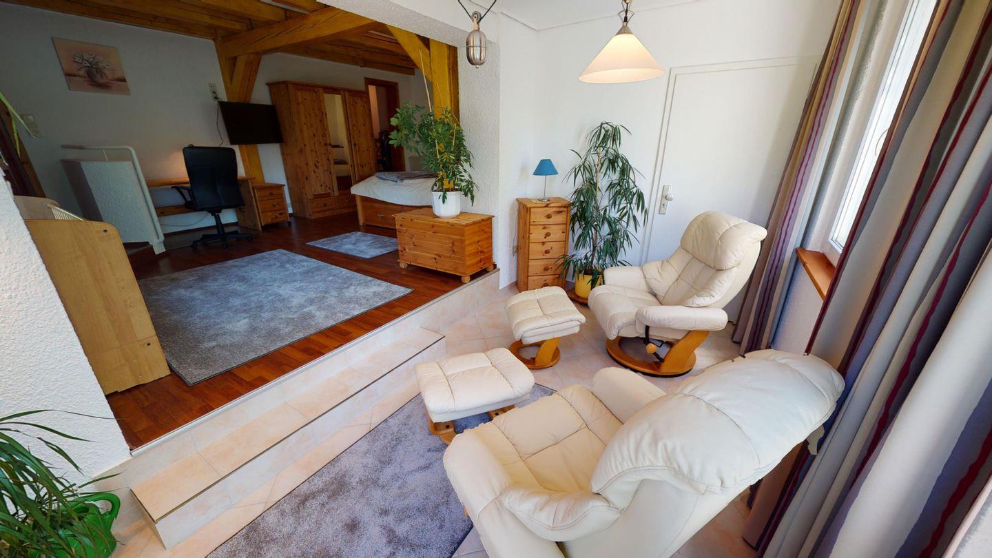 Oben, im Obergeschoss, öffnet sich ein großzügiger Wohnbereich mit viel Licht, einer großen Couchecke und einem langen Esstisch für gemeinsame Mahlzeiten. Die angeschlossene Küche ist voll ausgestattet und lädt zum Kochen und Genießen ein. Von hier aus gelangst du auch auf die überdachte Terrasse – mit direktem Blick auf den Bachlauf und Platz für lange Abende im Freien, bei jedem Wetter. Das Badezimmer auf dieser Ebene ist besonders komfortabel: mit Whirlpoolwanne, Doppelwaschbecken, WC und Urinal. Wenn zwischendurch mal etwas gewaschen werden muss: Im Haus steht ein separater Raum mit Waschmaschine und Trockner zur Verfügung, den sich beide Wohnungen teilen. Ganz praktisch, gerade bei längeren Aufenthalten oder mit Kindern.