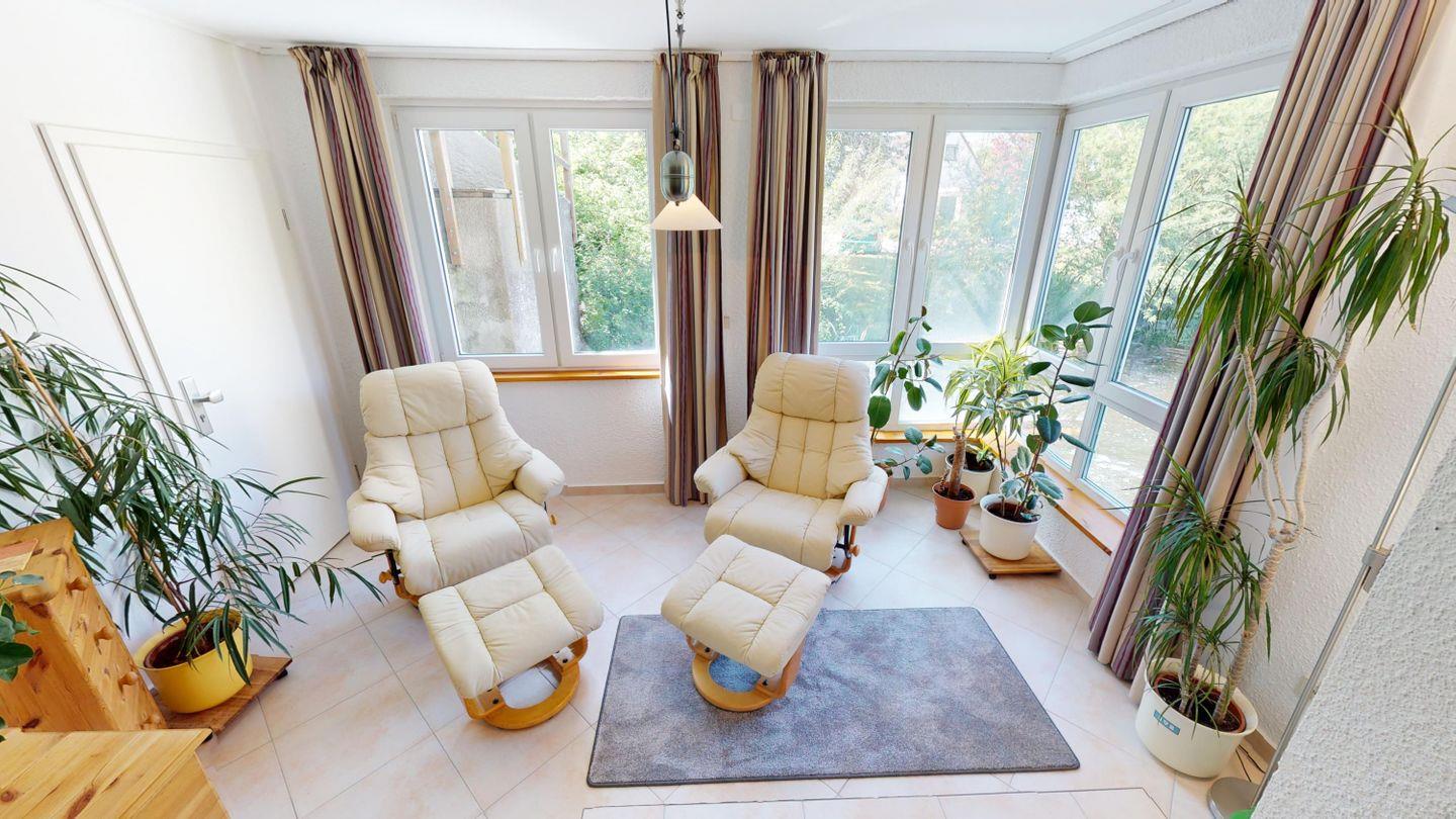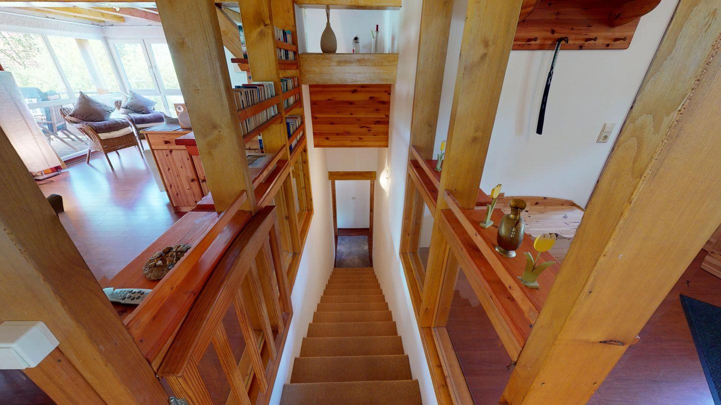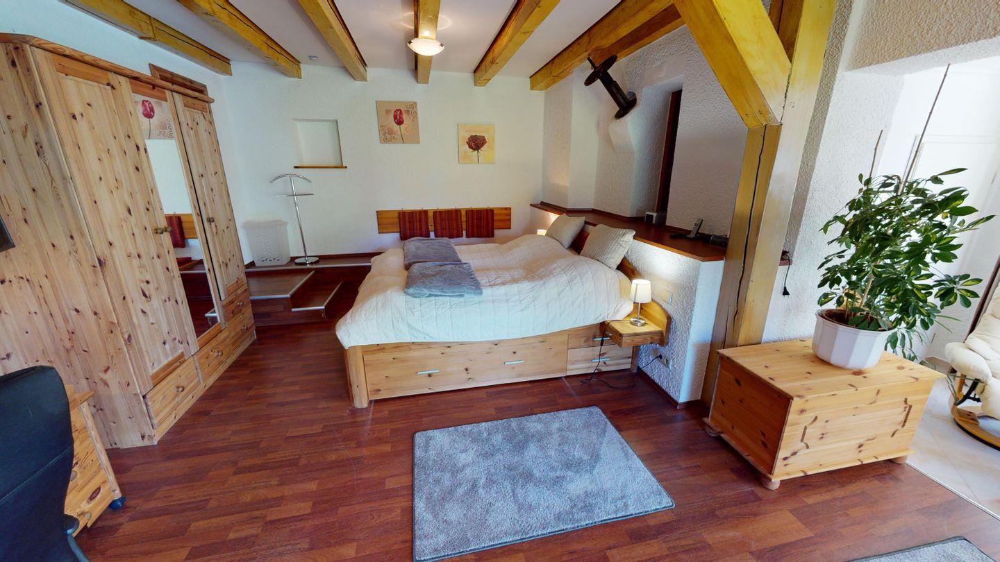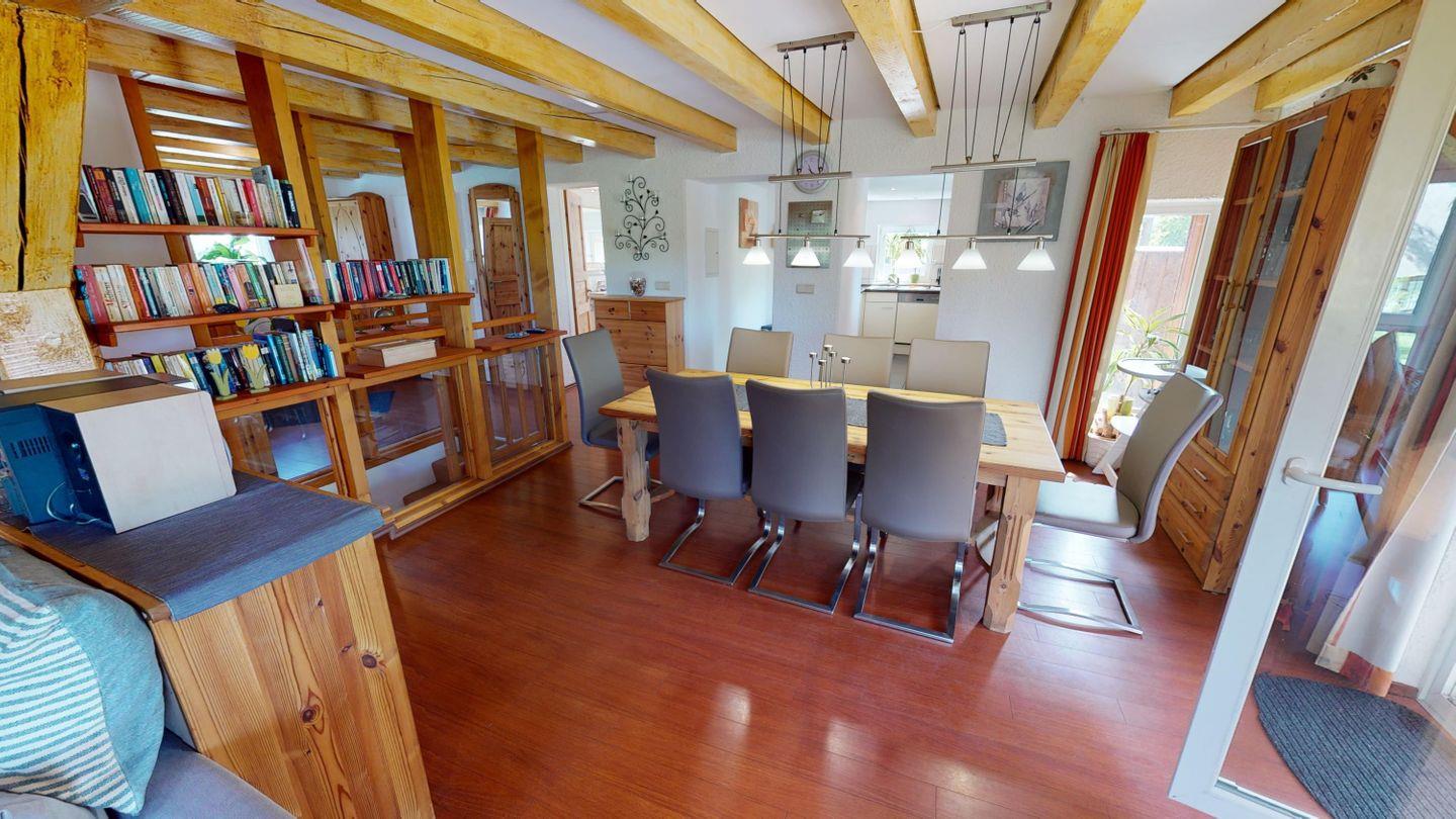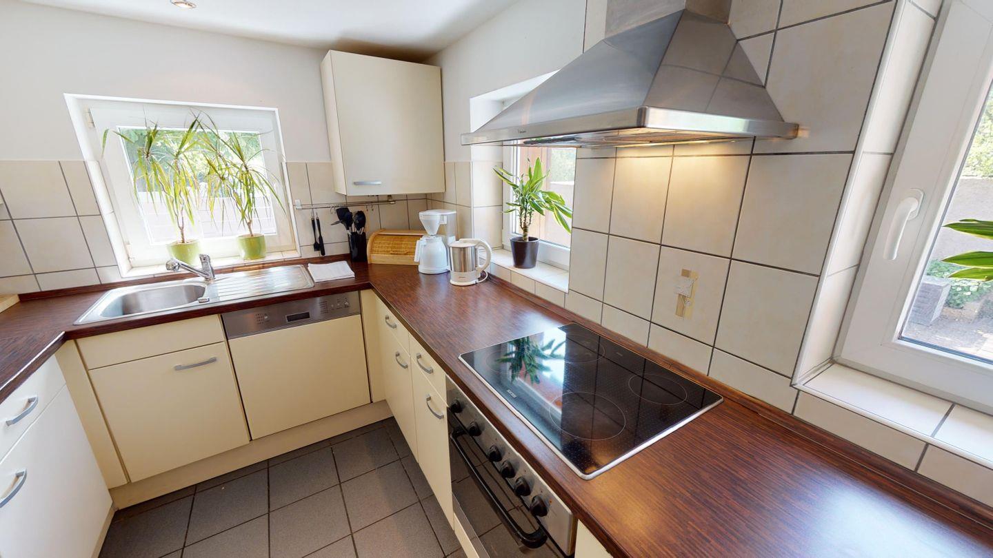 Oben, im Obergeschoss, öffnet sich ein großzügiger Wohnbereich mit viel Licht, einer großen Couchecke und einem langen Esstisch für gemeinsame Mahlzeiten. Die angeschlossene Küche ist voll ausgestattet und lädt zum Kochen und Genießen ein. Von hier aus gelangst du auch auf die überdachte Terrasse – mit direktem Blick auf den Bachlauf und Platz für lange Abende im Freien, bei jedem Wetter. Das Badezimmer auf dieser Ebene ist besonders komfortabel: mit Whirlpoolwanne, Doppelwaschbecken, WC und Urinal. Wenn zwischendurch mal etwas gewaschen werden muss: Im Haus steht ein separater Raum mit Waschmaschine und Trockner zur Verfügung, den sich beide Wohnungen teilen. Ganz praktisch, gerade bei längeren Aufenthalten oder mit Kindern.