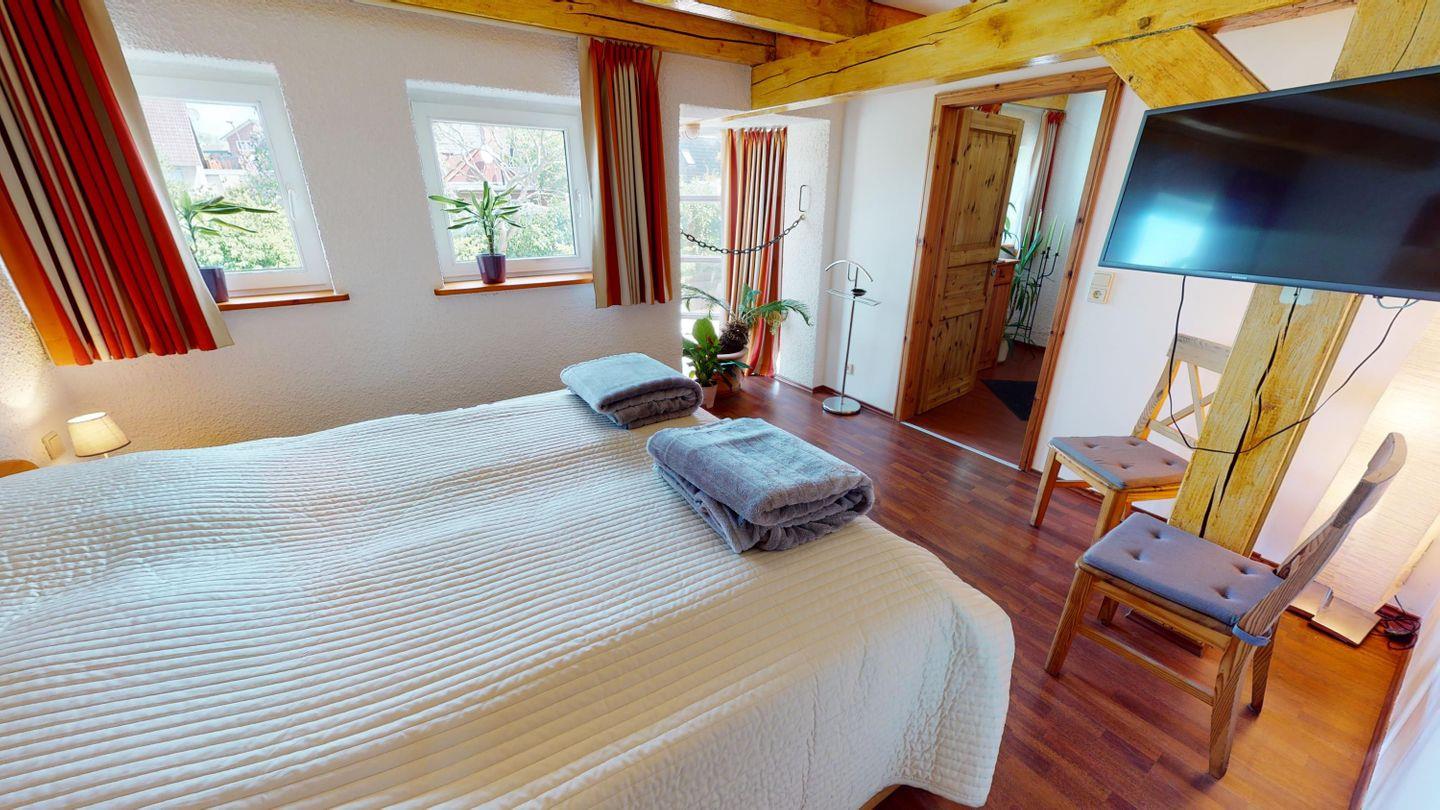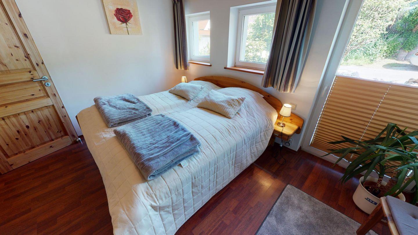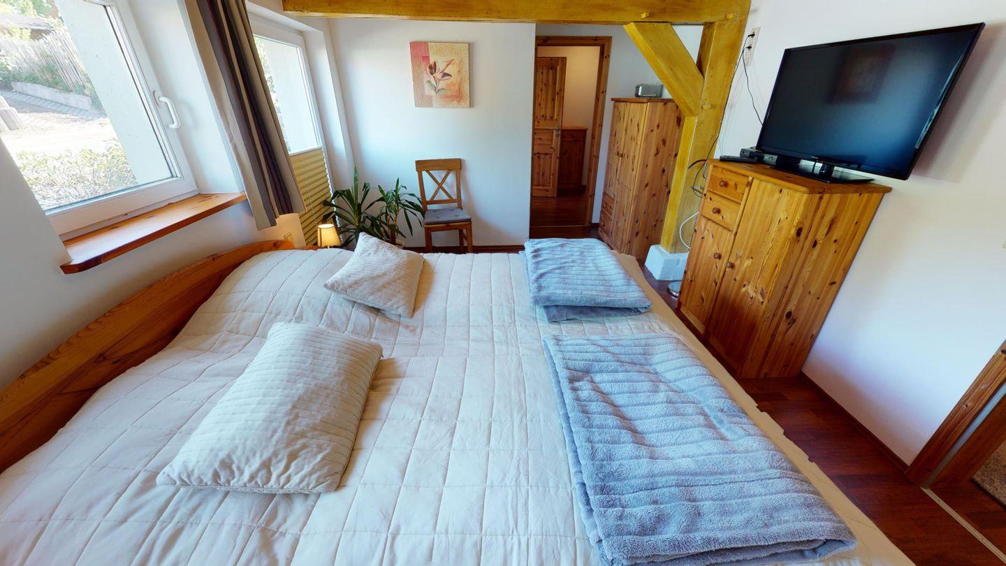 Im Erdgeschoss erwarten dich zwei gemütliche Schlafzimmer, jeweils mit einem Doppelbett ausgestattet. In einem davon steht zusätzlich ein Gitterbett für die Kleinsten bereit. Ein besonderes Highlight ist die kleine Sitzecke mit Fensterfront – von dort aus blickst du direkt auf das Wasser, das aus dem alten Mühlkanal unter den Fenstern hindurchfließt. Das Badezimmer auf dieser Etage verfügt über eine Dusche und ein WC.
